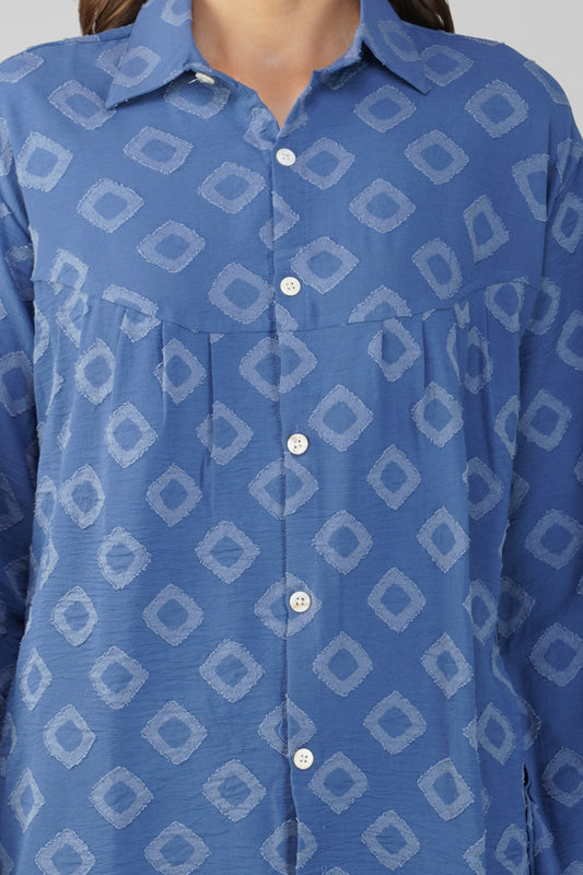 Blue Jacquard Shirt Lets Go Co-ord Set – Gathered Yoke Shirt with Relaxed Pants
