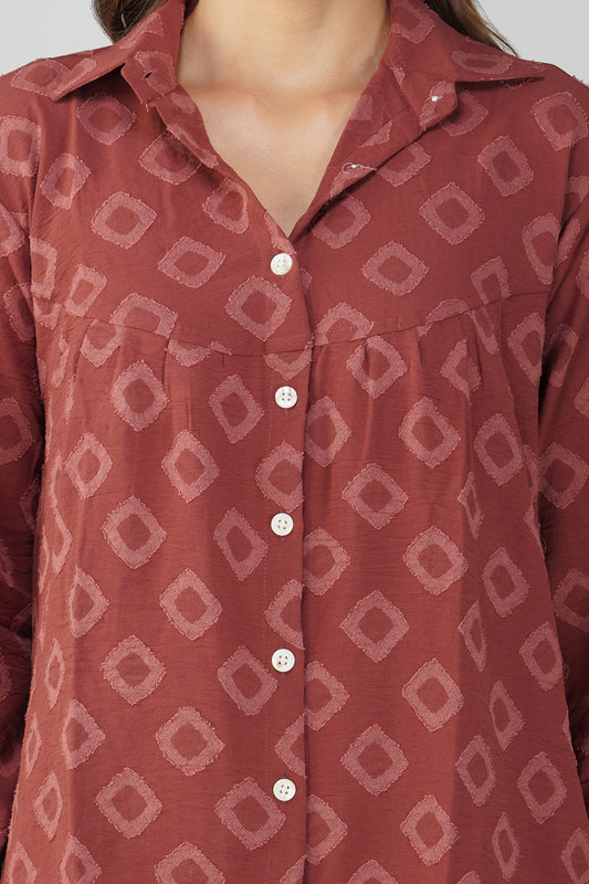 Brick Red Jacquard Shirt Lets Go Co-ord Set – Gathered Yoke Shirt with Relaxed Pants