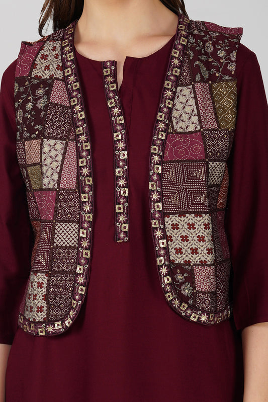 Afreen Afghani Set – Maroon Kurta, Printed Dhoti Pants & Embellished Vest (3-Piece Set)