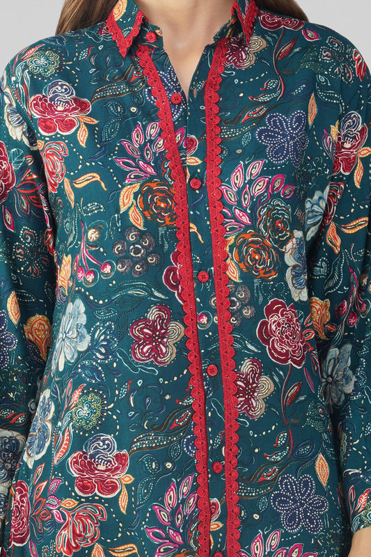 Peacock Floral Shirt Co-ord Set – Gold Highlights & Contrast Lace Detail