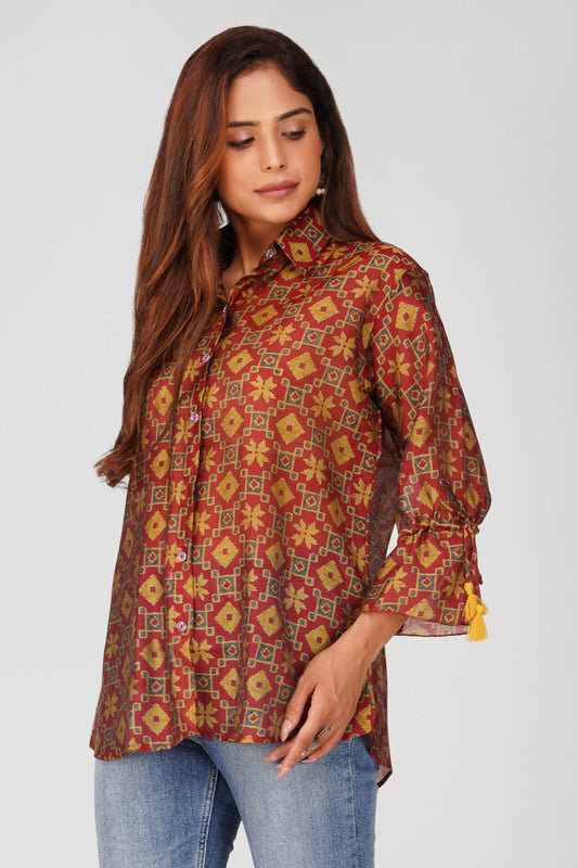 Baawri Maroon Chanderi Printed Shirt with Handmade Tassel Detail | Bindigasm