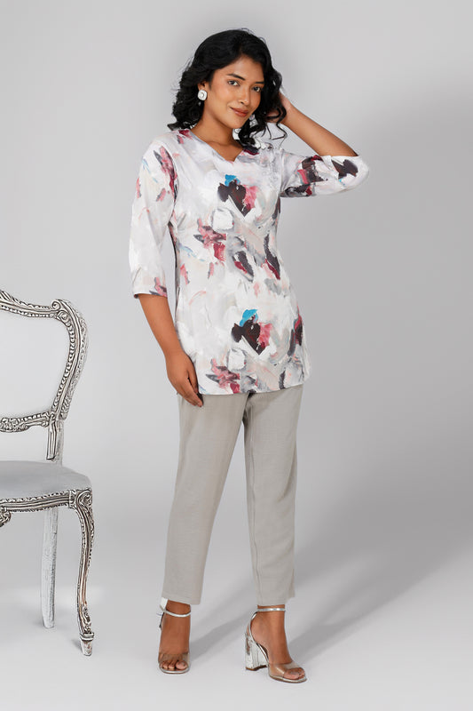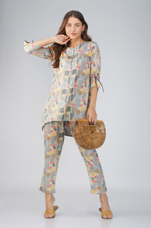 Grey Abstract Co-ord Set – Round Neck Tunic with Printed Straight Pants