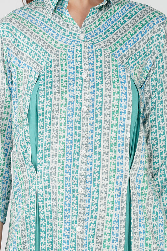 Sea Green Floral Shirt Co-ord Set – Contrast Panel Top with Solid Pants