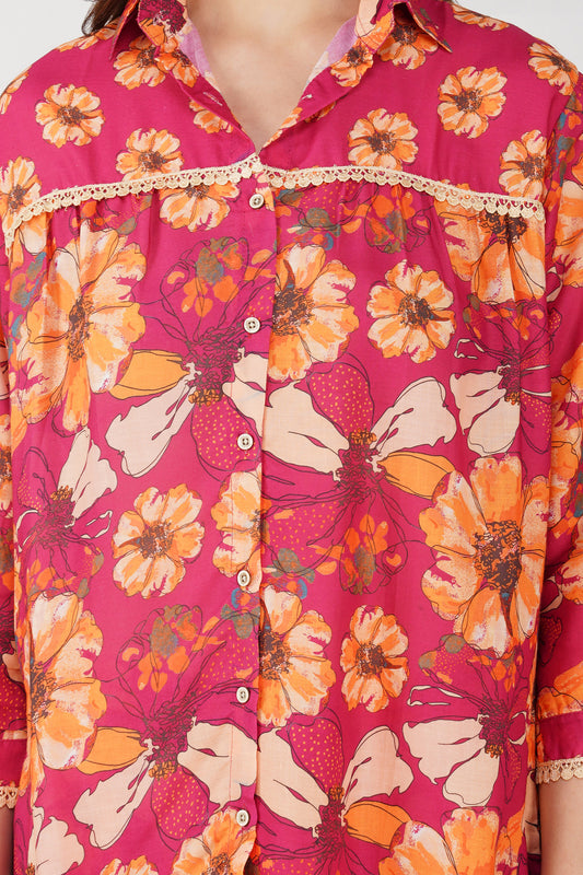 Wine Floral Shirt Co-ord Set – Bold Print Top & Relaxed Pants