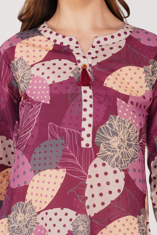 Wine Illustration Kurta Co-ord Set – Tassel Kurta with Polka Dot Pants