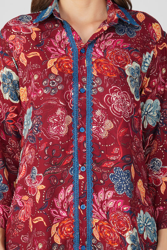 Maroon Floral Shirt Co-ord Set – Gold Highlights & Contrast Lace Detail