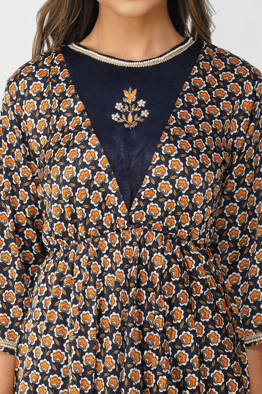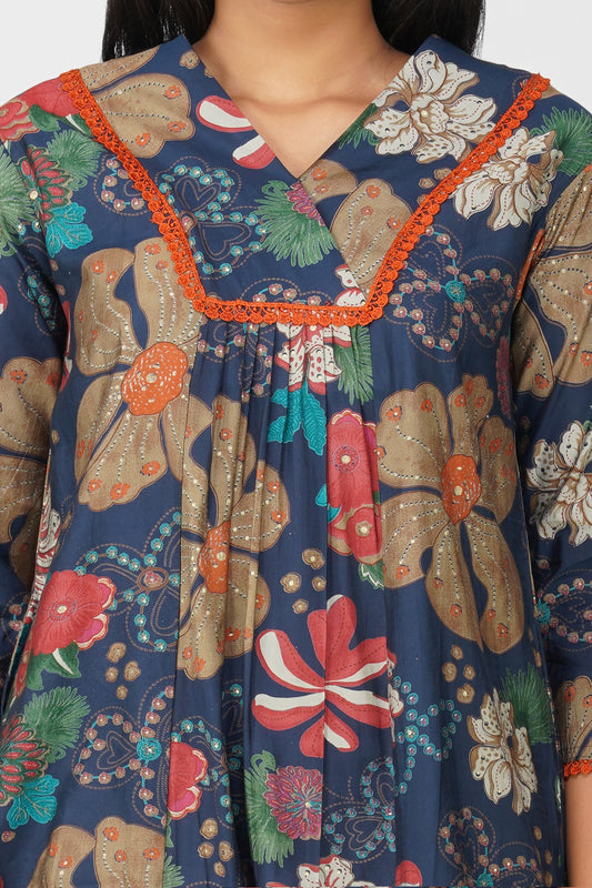 Sia Navy Floral Illustration Co-ord Set – Flared Kurta & Printed Palazzo Pants