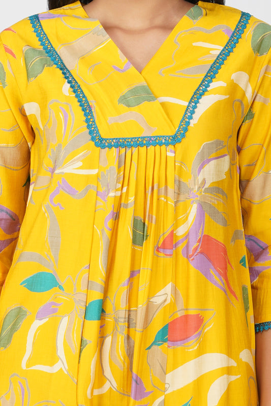 Yellow Floral Printed Co-ord Set – Flared Kurta & Printed Modal Pants