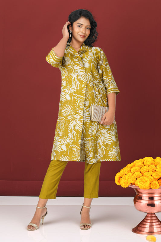 Laila Co-ord Set – Yellow Green Printed Jacket Style Top with Solid Pants (2-Piece Set)