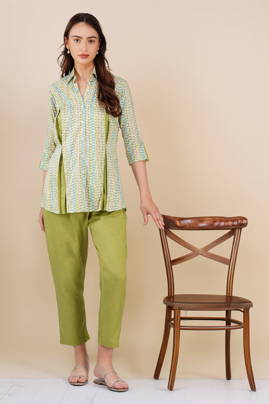 Fresh Green Floral Shirt Co-ord Set – Contrast Panel Top with Solid Pants