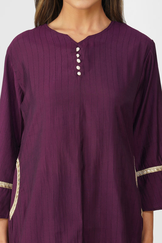 Cham Cham Co-ord Set – Purple | Elegant V-Neck Short Kurta with Gold Threads – Bindigasm