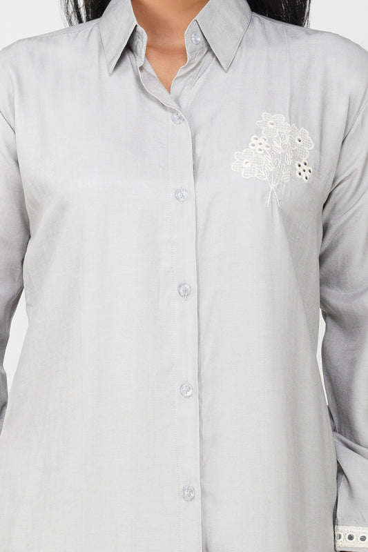 Grey Silk-Denim Co-ord Set – Embroidered Shirt & Relaxed Fit Pants