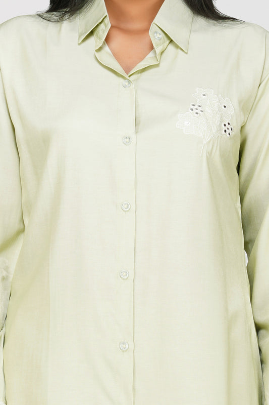 Pastel Green Silk-Denim Co-ord Set – Mirror Embroidered Shirt & Pants