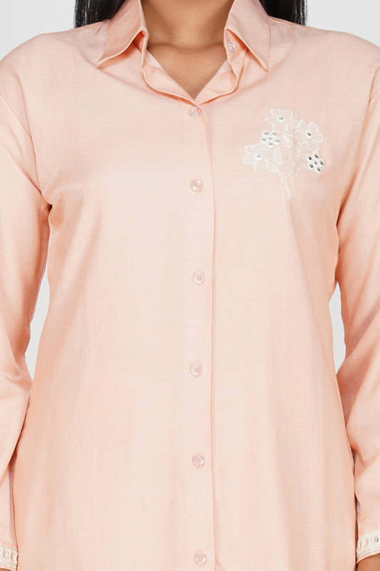 Peach Silk-Denim Co-ord Set – Embroidered Shirt & Relaxed Pants