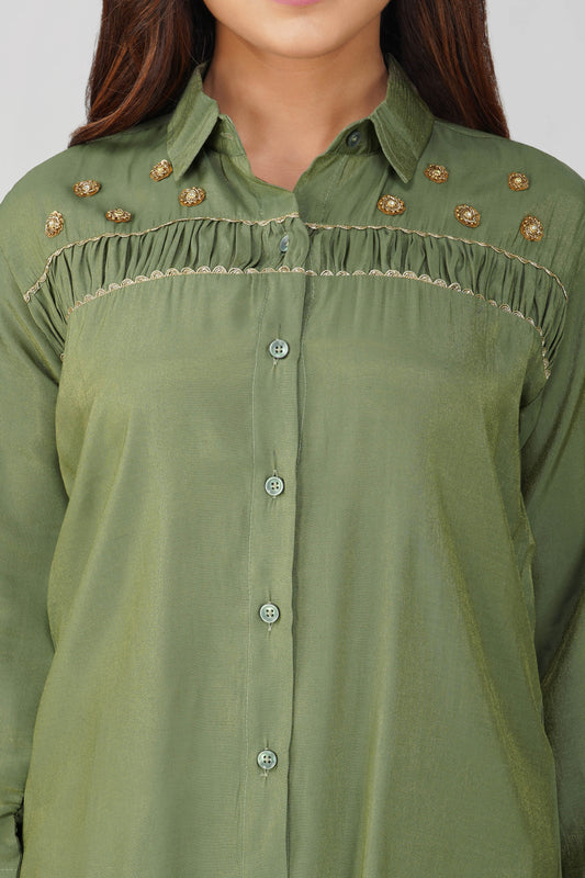 Suhani Mehendi Green Shimmer Shirt & Pants Coord Set with Handwork Yoke | Bindigasm