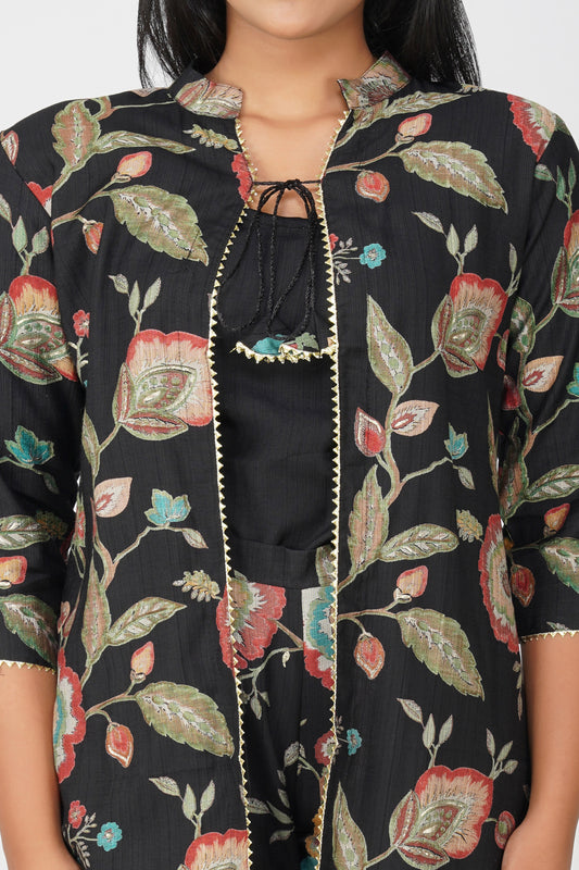 Maahi Co-ord Set – Black Floral Jacket, Solid Inner & Printed Palazzos (3-Piece Set)