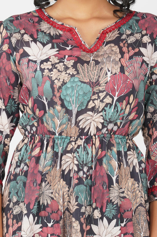 Eva Black Forest Print Cotton Blend Tier Midi Dress