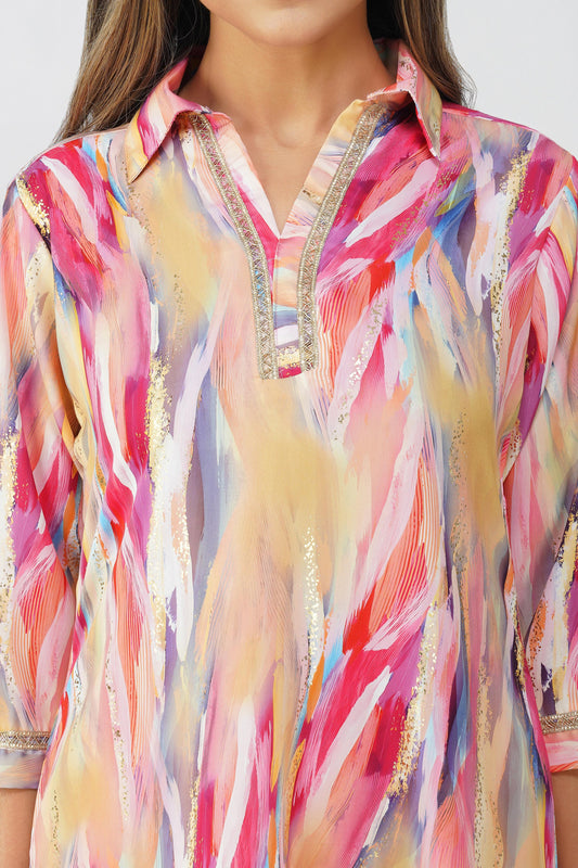 Paint Brush Satin Coord Set – Peach Gold Glint