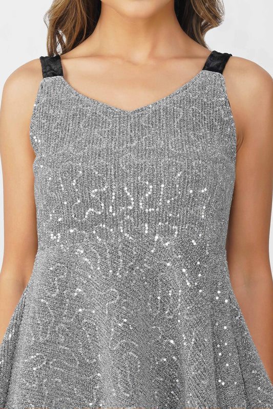 Moonlit Mirage Sequinned Metallic Peplum Top – Silver with Black Velvet Straps