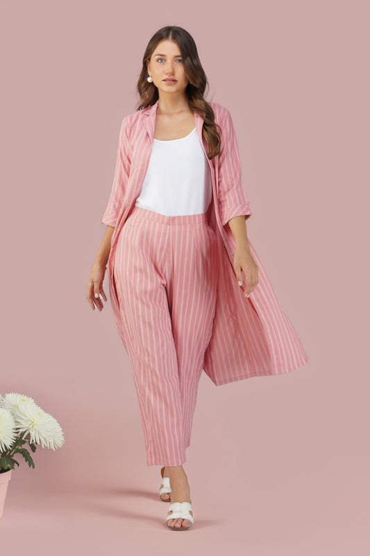 Raahi Blush Peach Jacket Co-ord Set – 3-Piece with Spaghetti Top & Striped Flared Pants