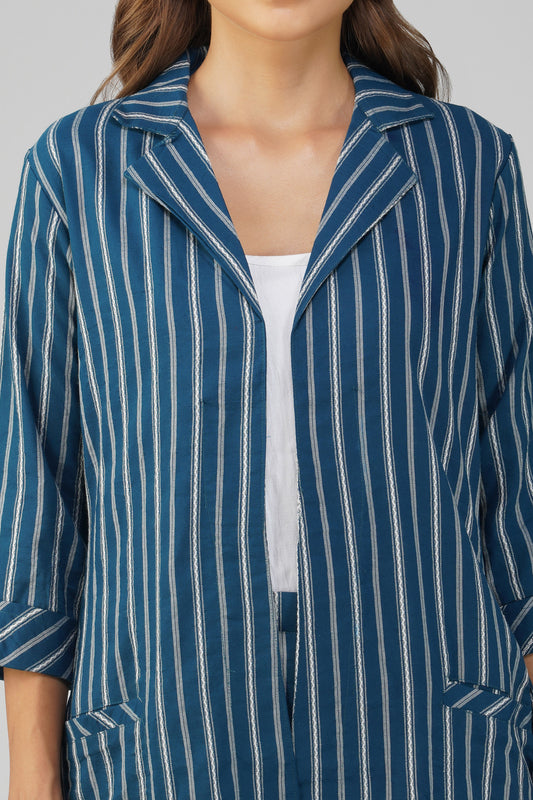 Raahi Sea Blue Jacket Co-ord Set – 3-Piece with Spaghetti Top & Striped Flared Pants