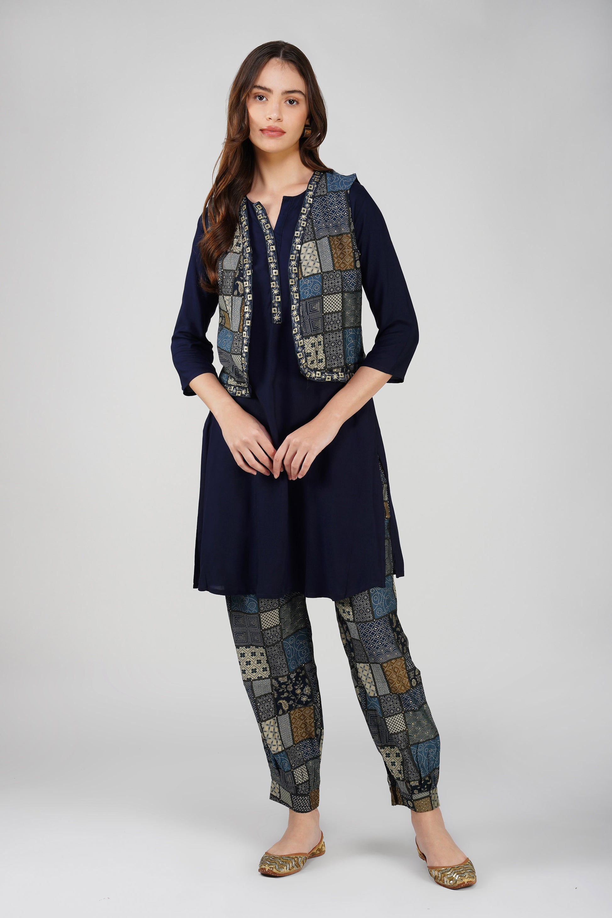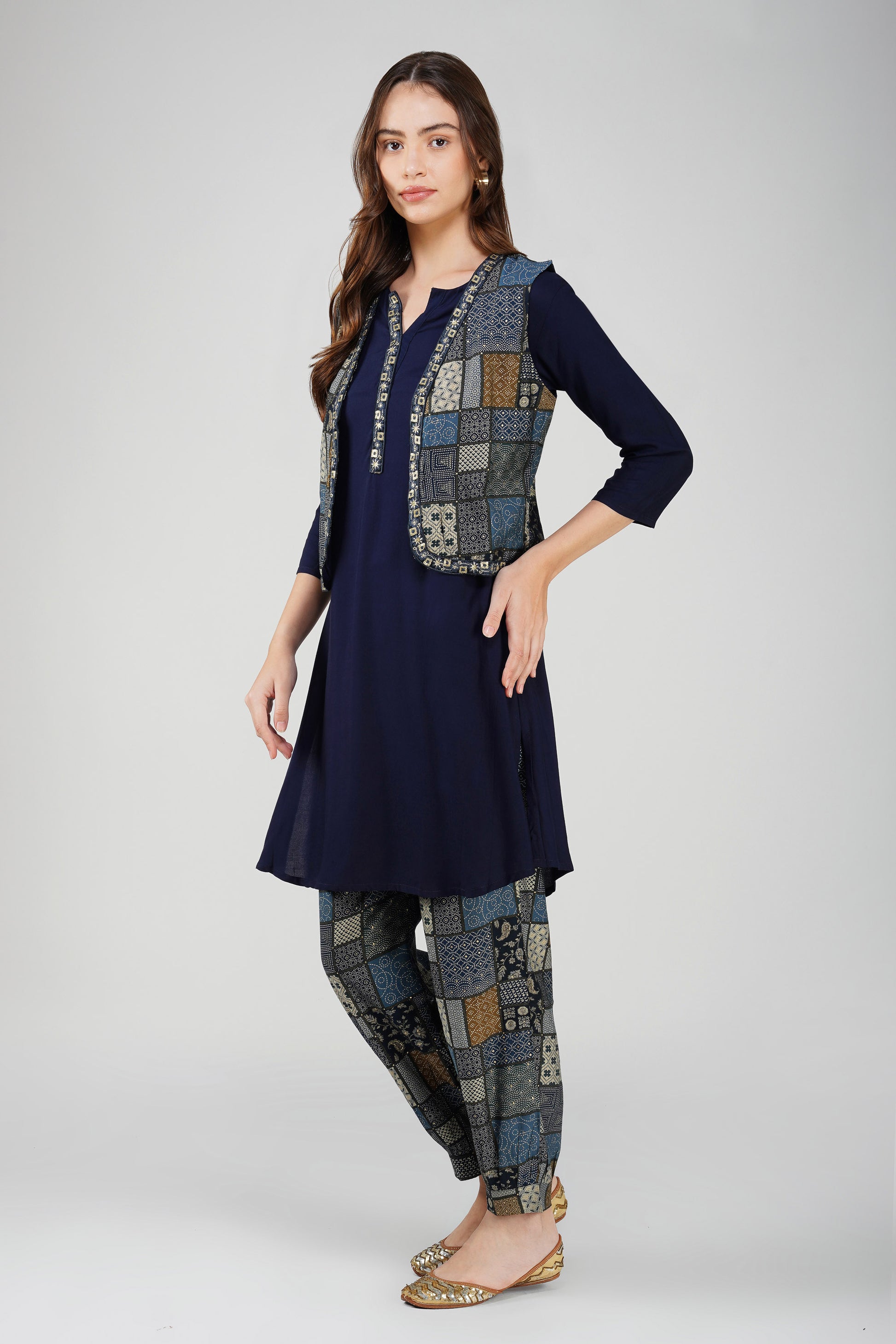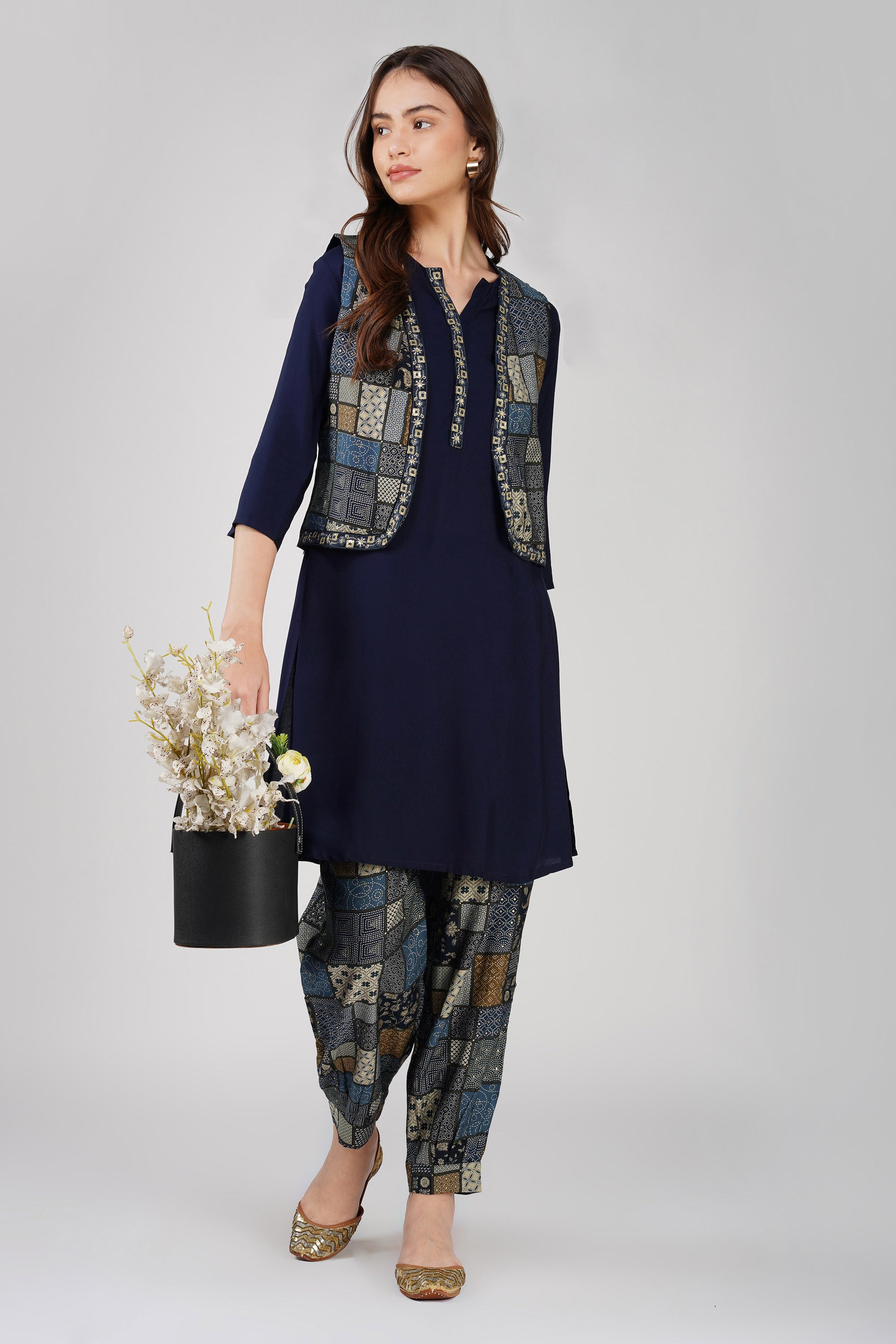 Afreen Afghani Set – Navy Kurta, Printed Dhoti Pants & Embellished Vest (3-Piece Set)