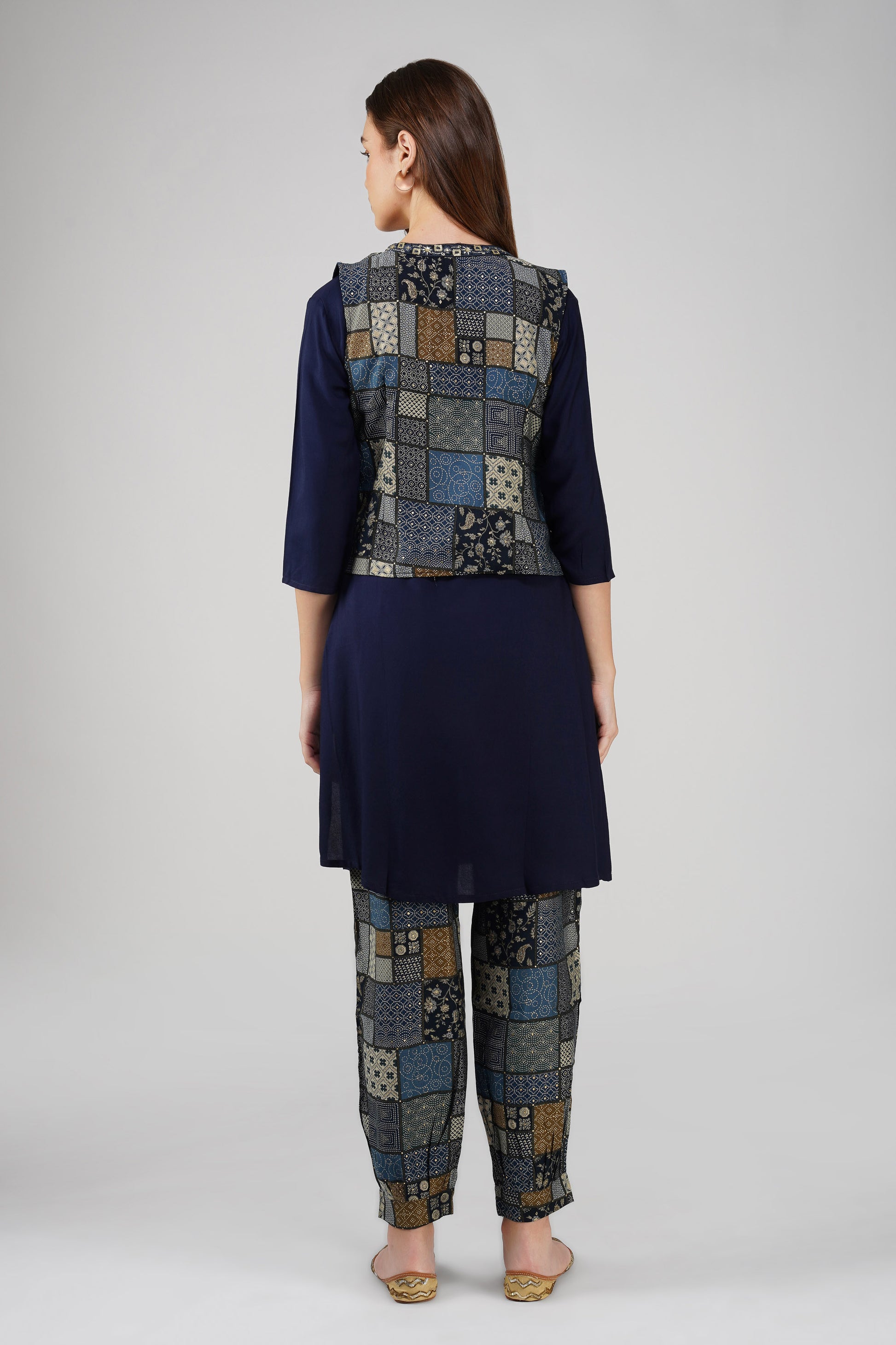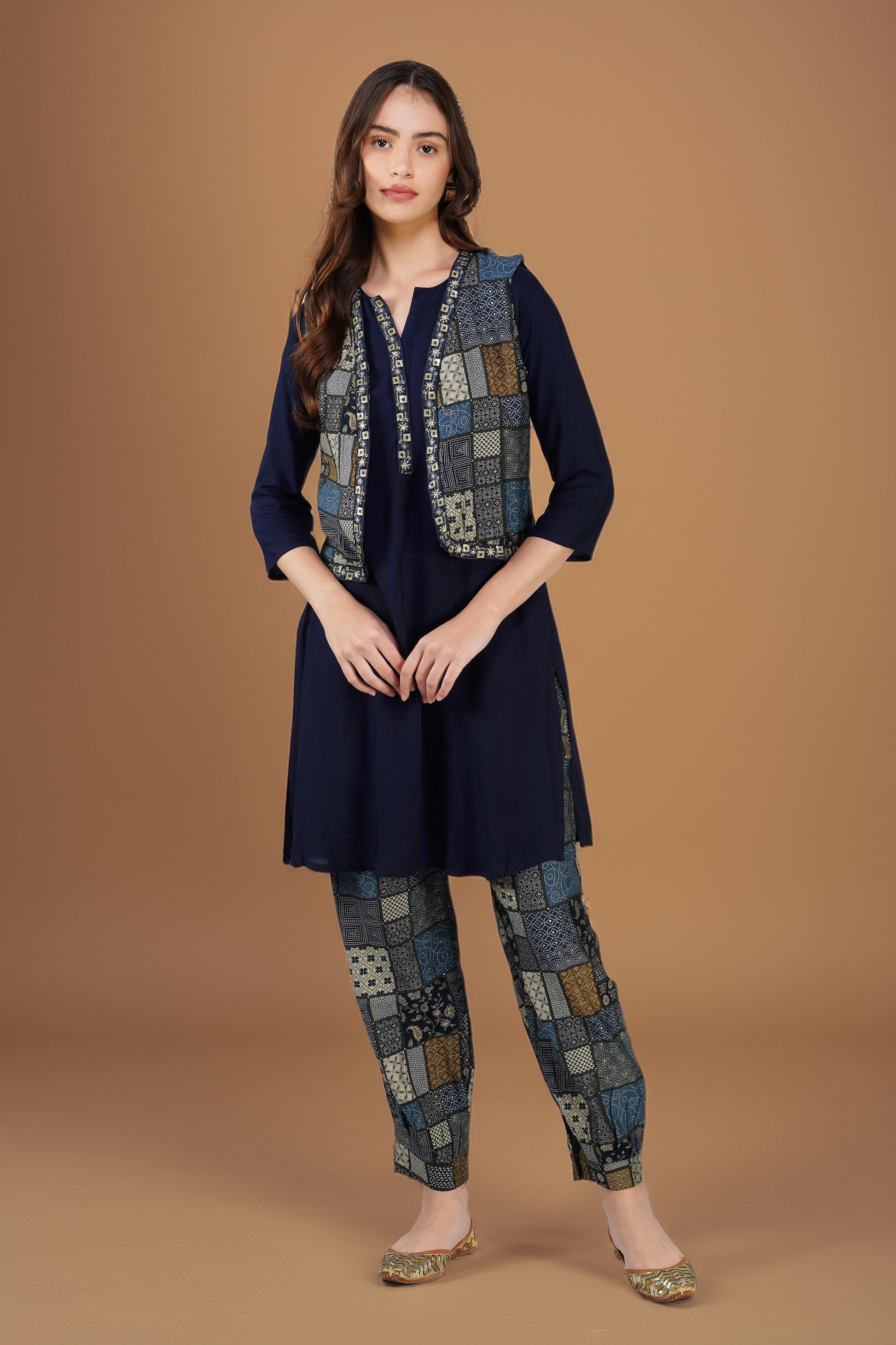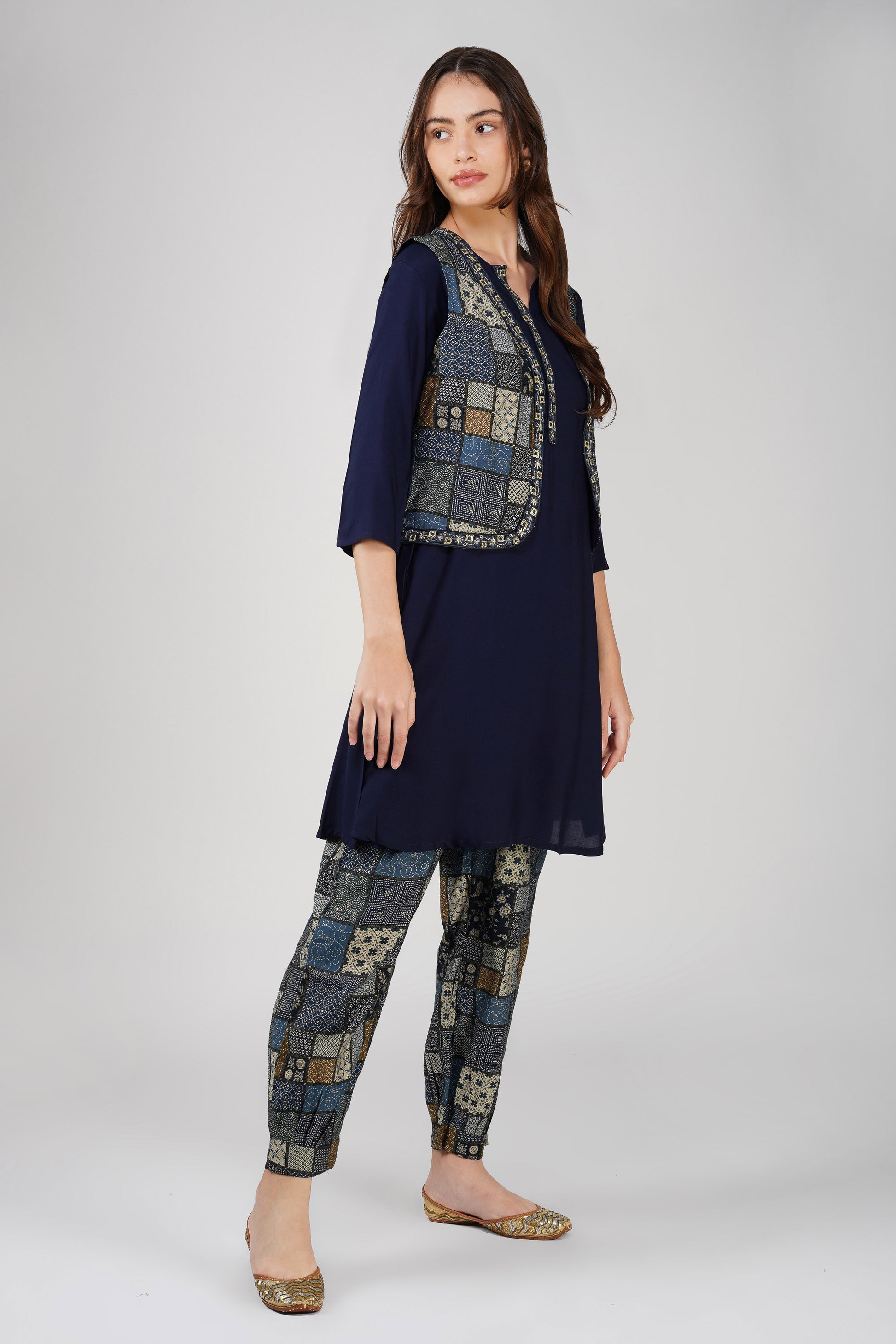 Afreen Afghani Set – Navy Kurta, Printed Dhoti Pants & Embellished Vest (3-Piece Set)