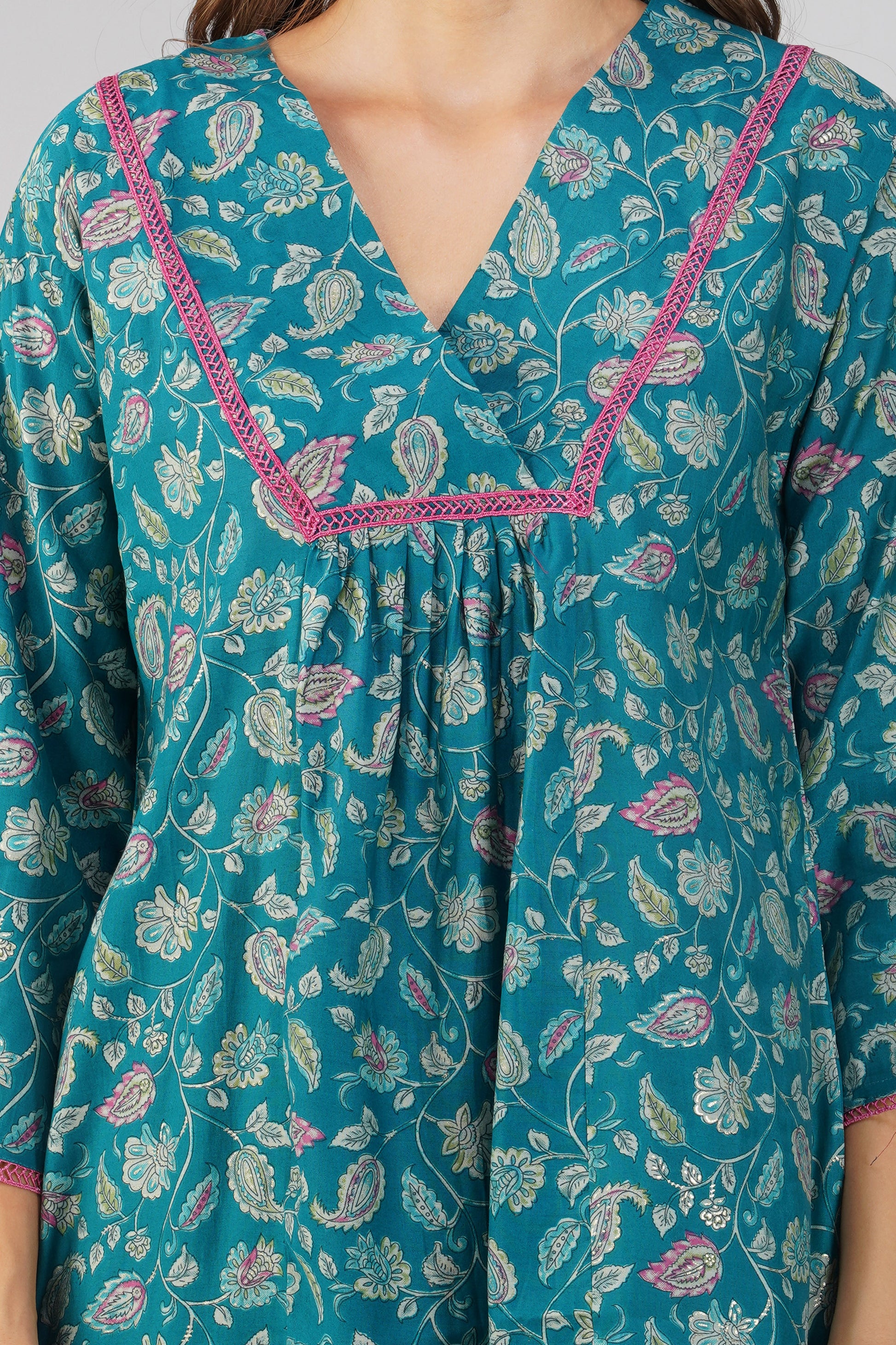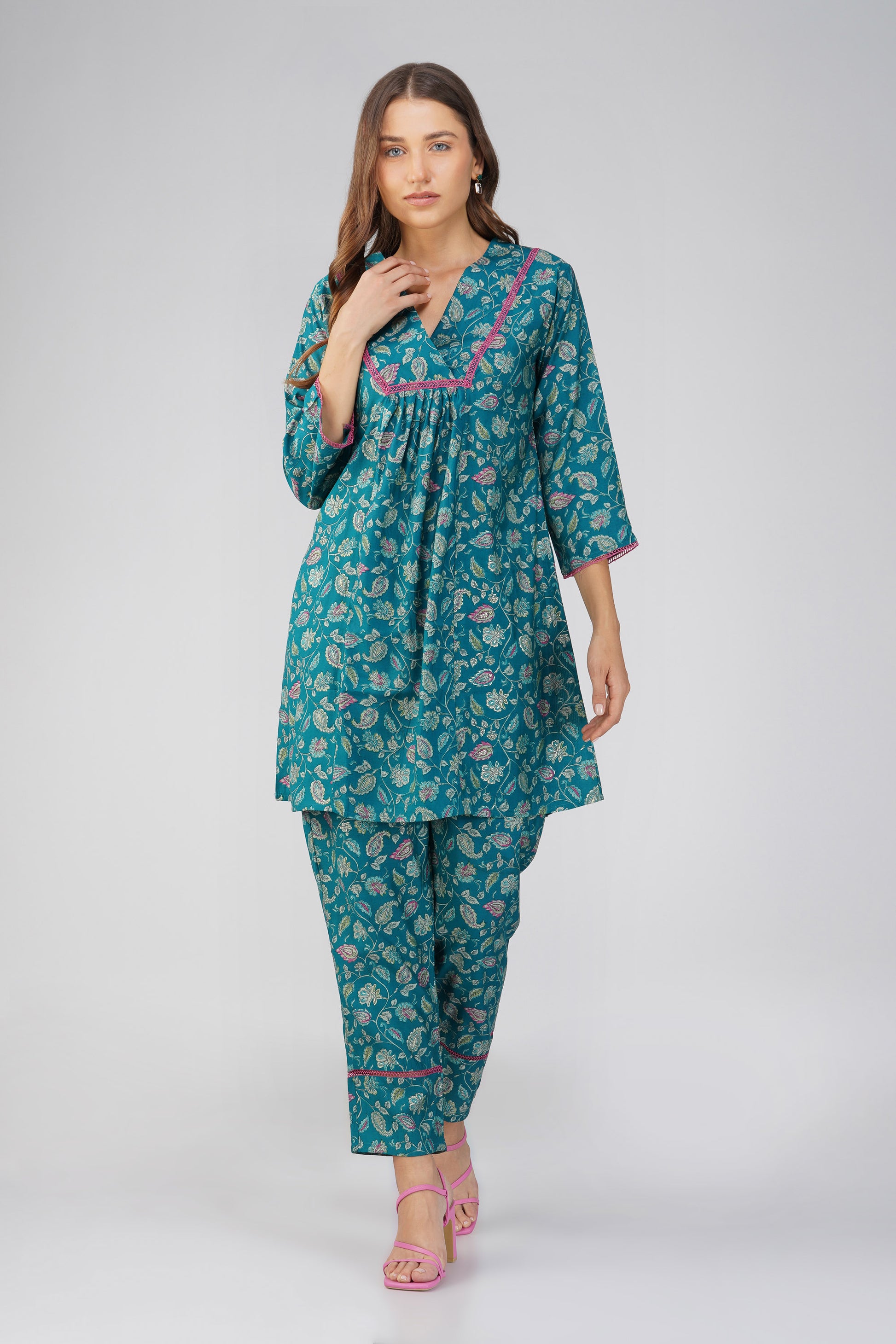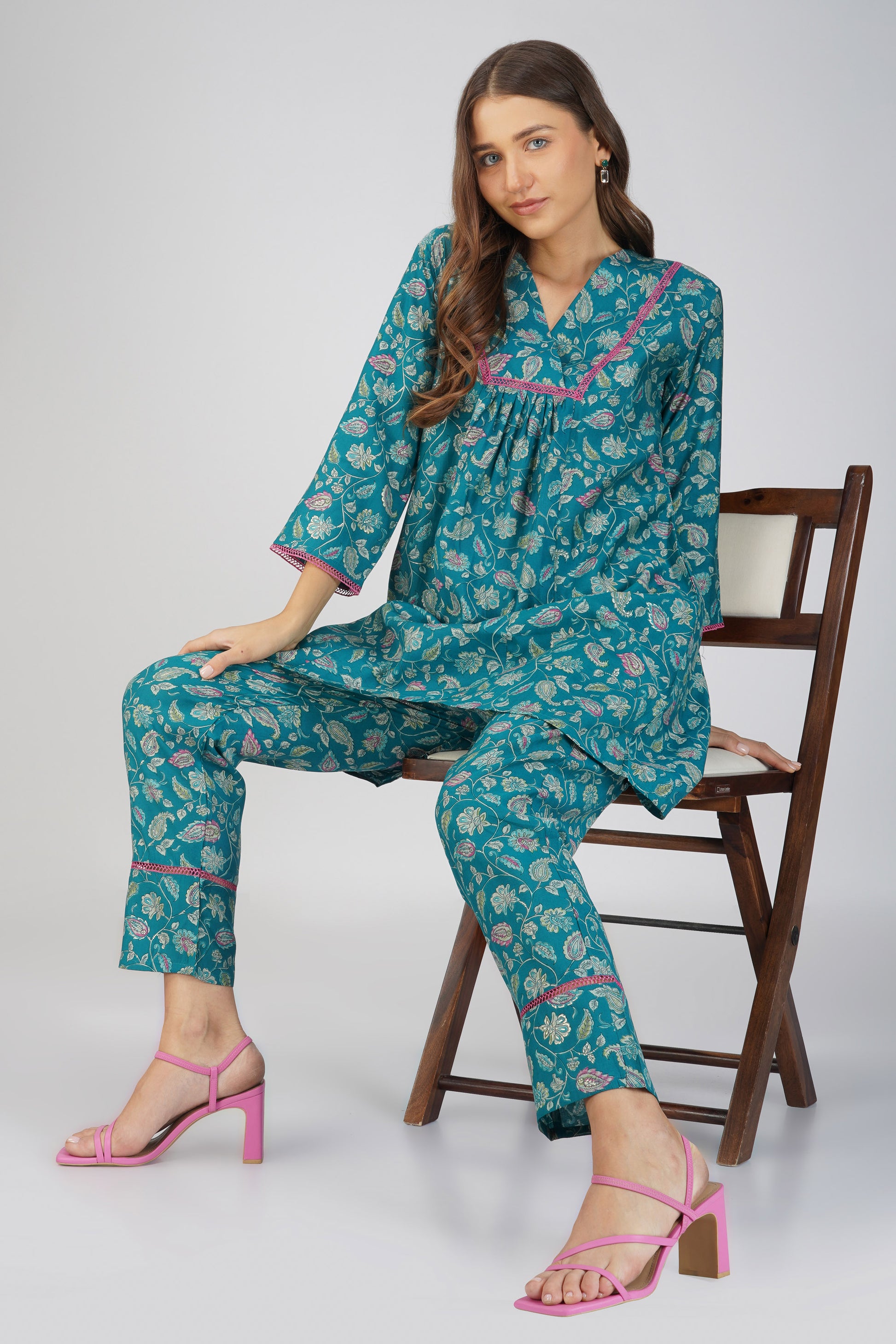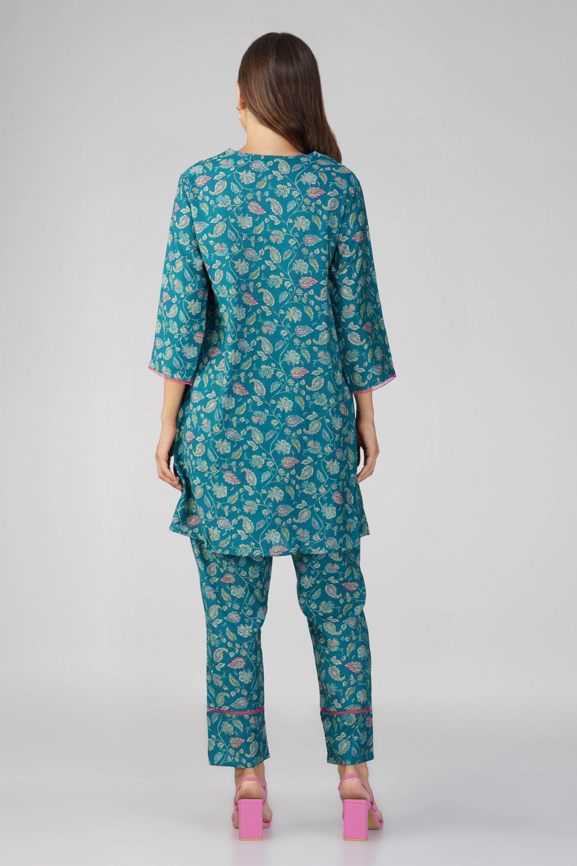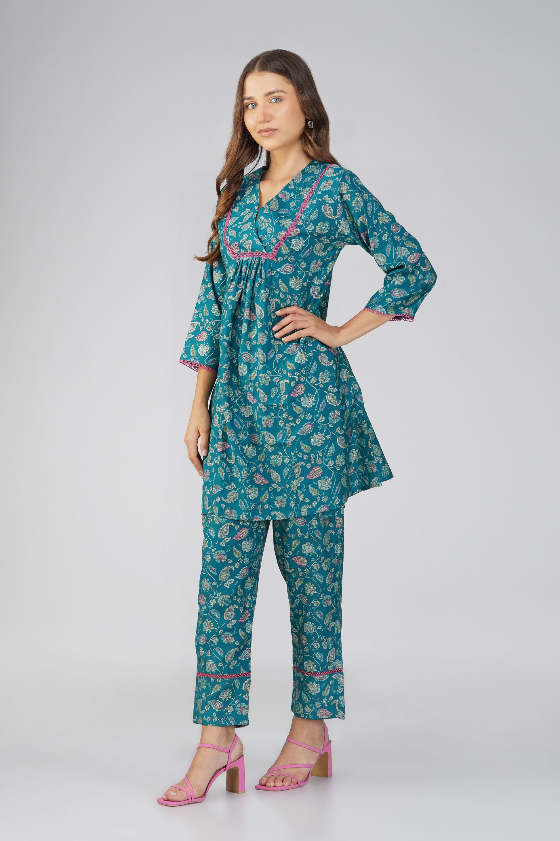 A traditional paisley flared tunic in elegant peacock green π¦ finished with jaali lace at the yoke, sleeves, and hemline. Paired with matching regular-fit pants and a functional pocket, this modal chanderi co-ord brings old-school charm to your modern everyday wardrobe β equal parts graceful and wearable.