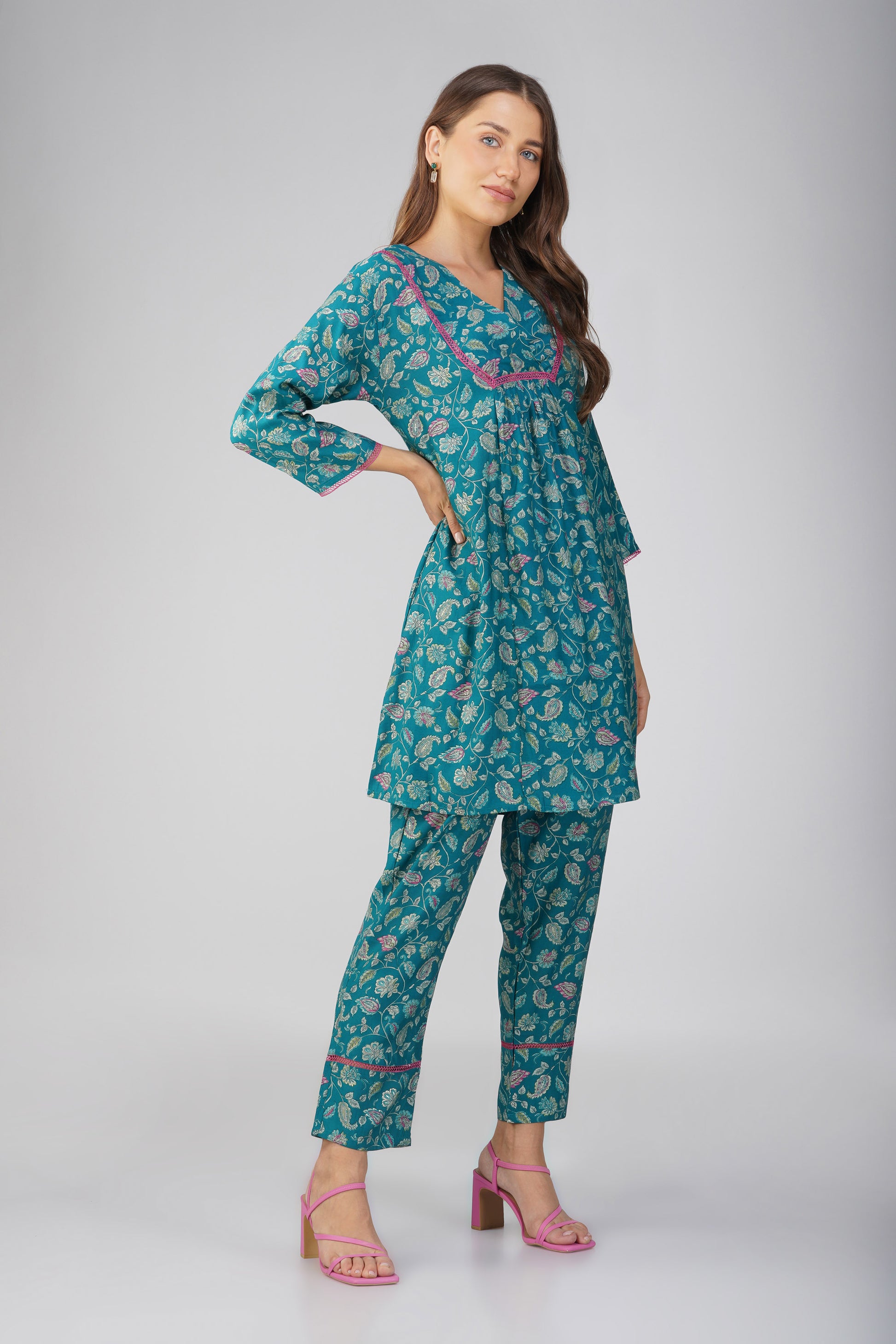 Peacock Green Paisley Co-ord Set β Flared Modal Chanderi Kurta with Pants