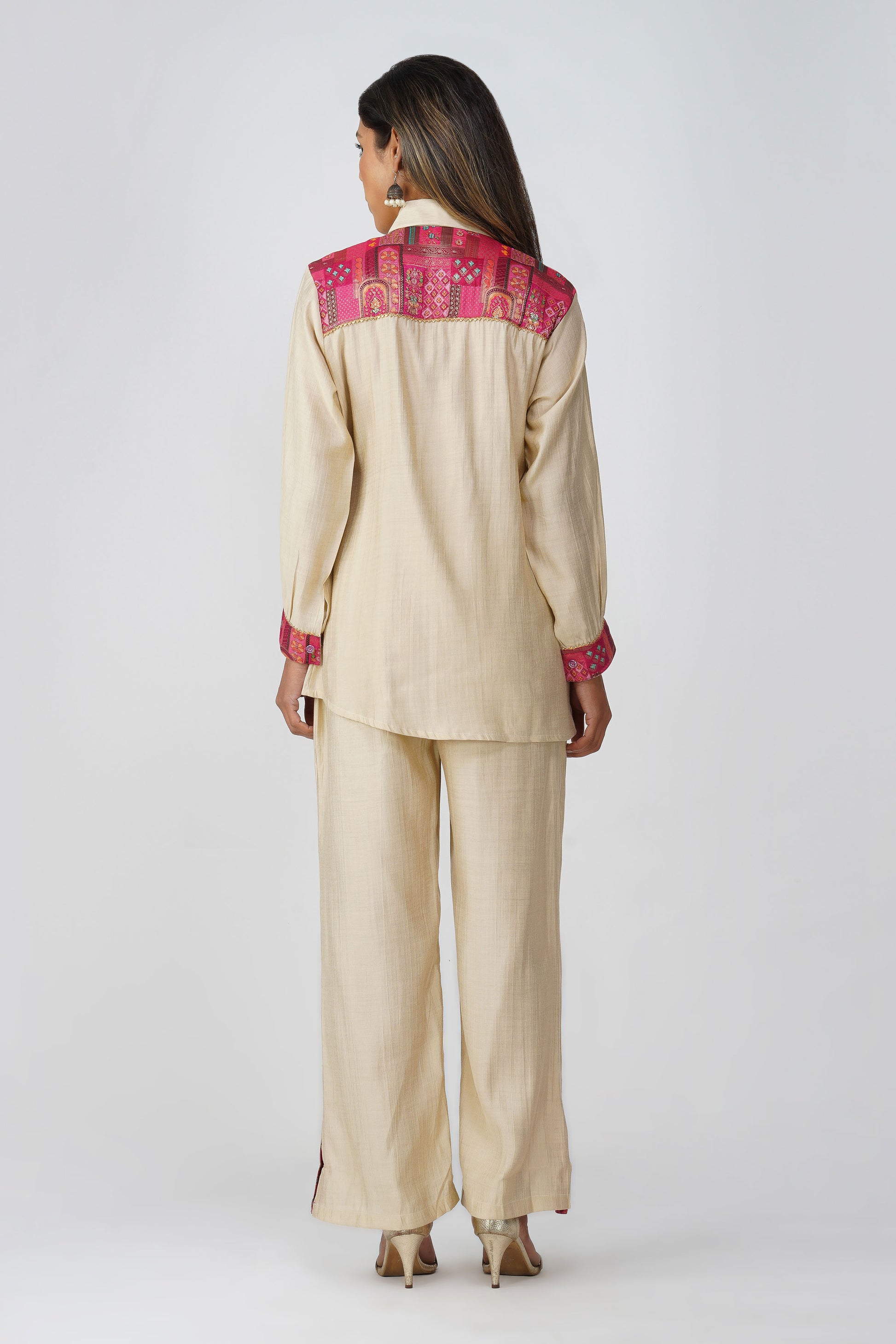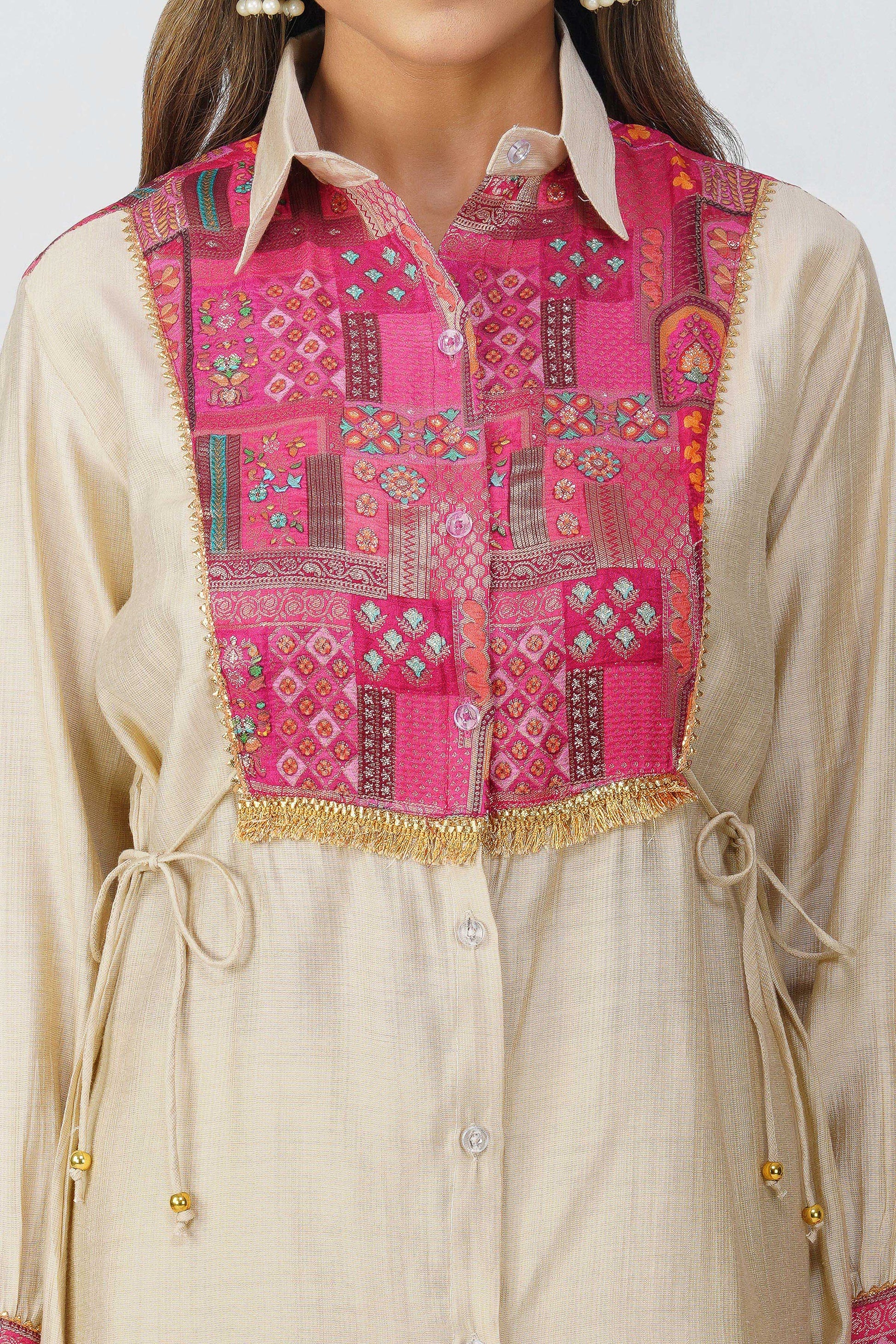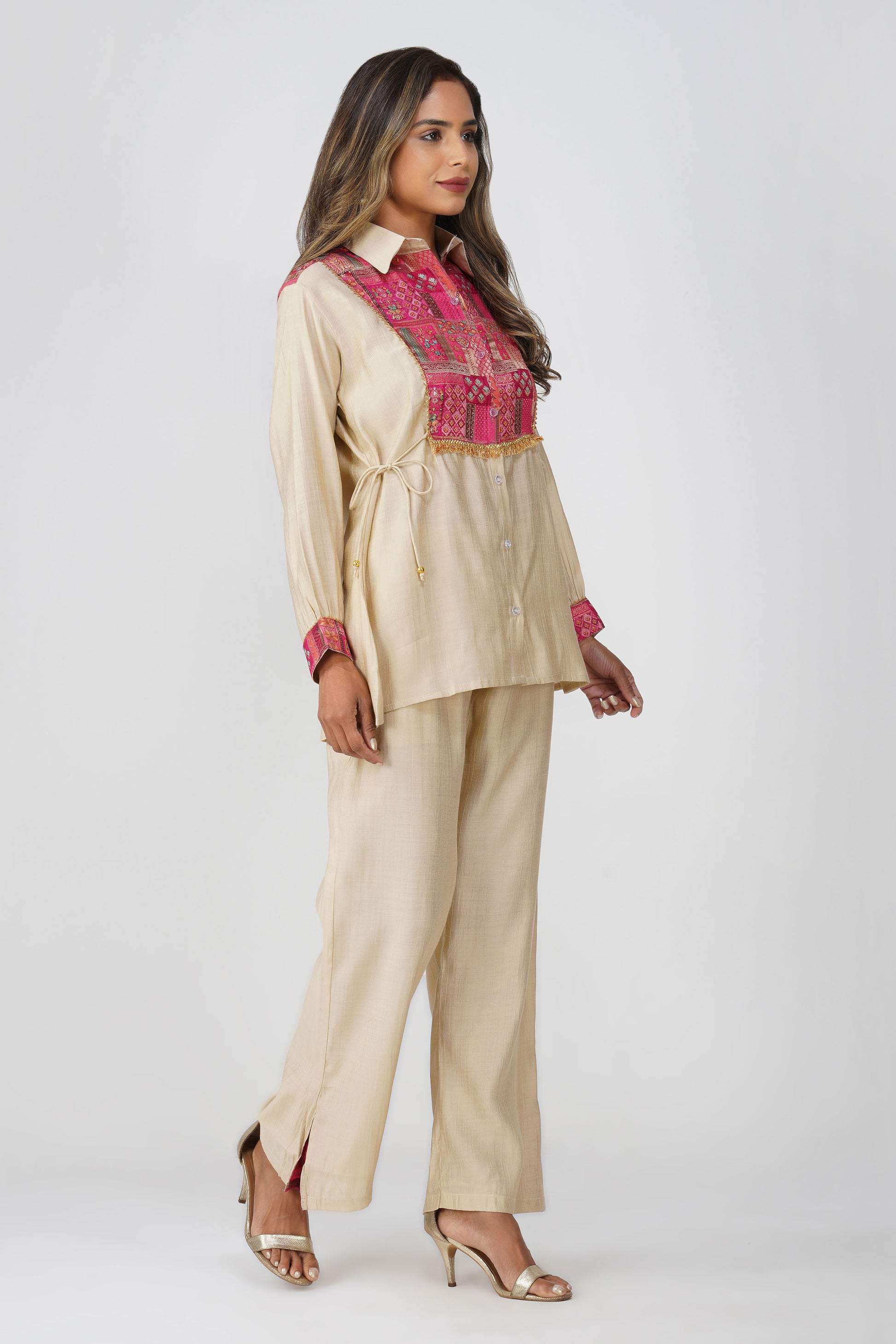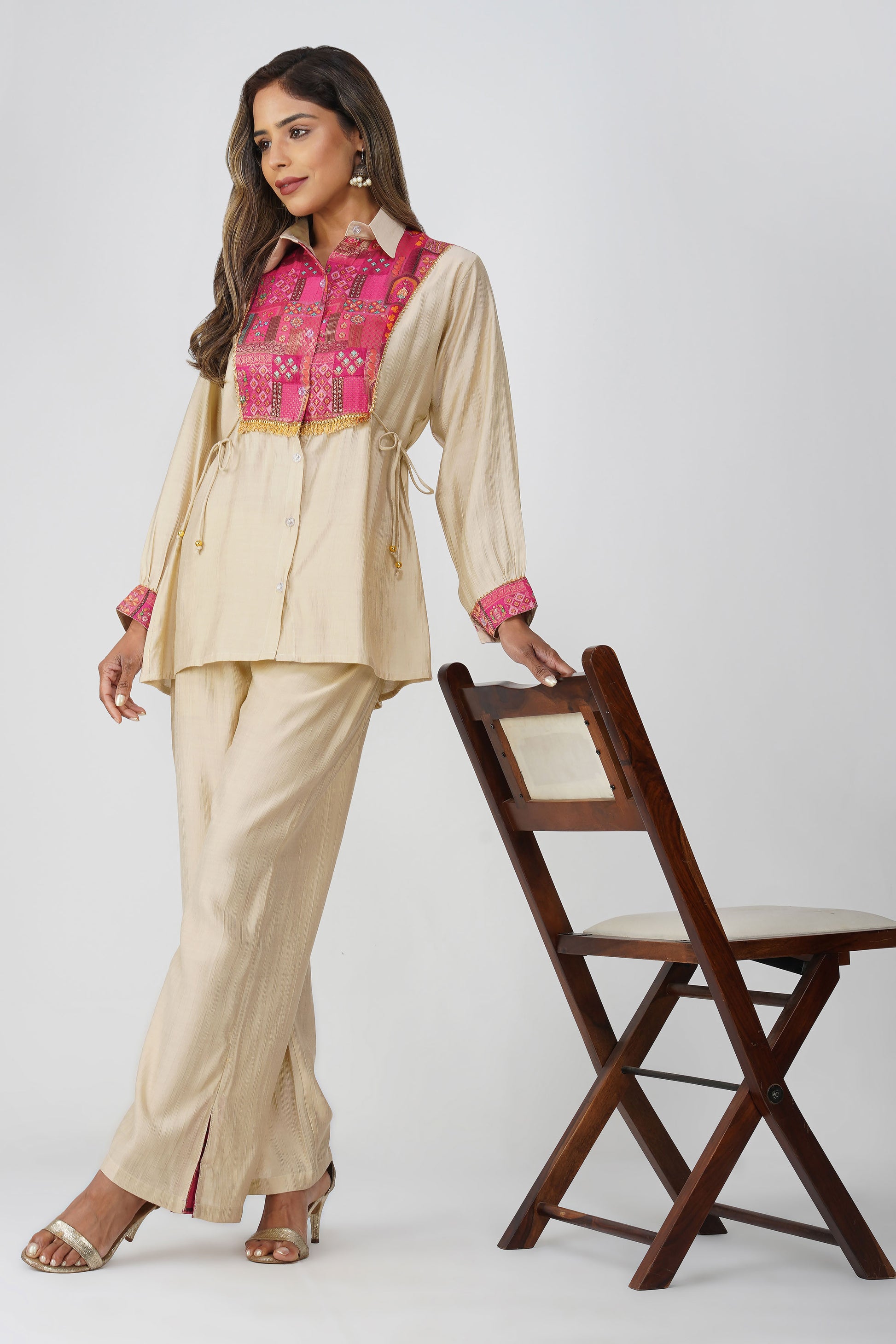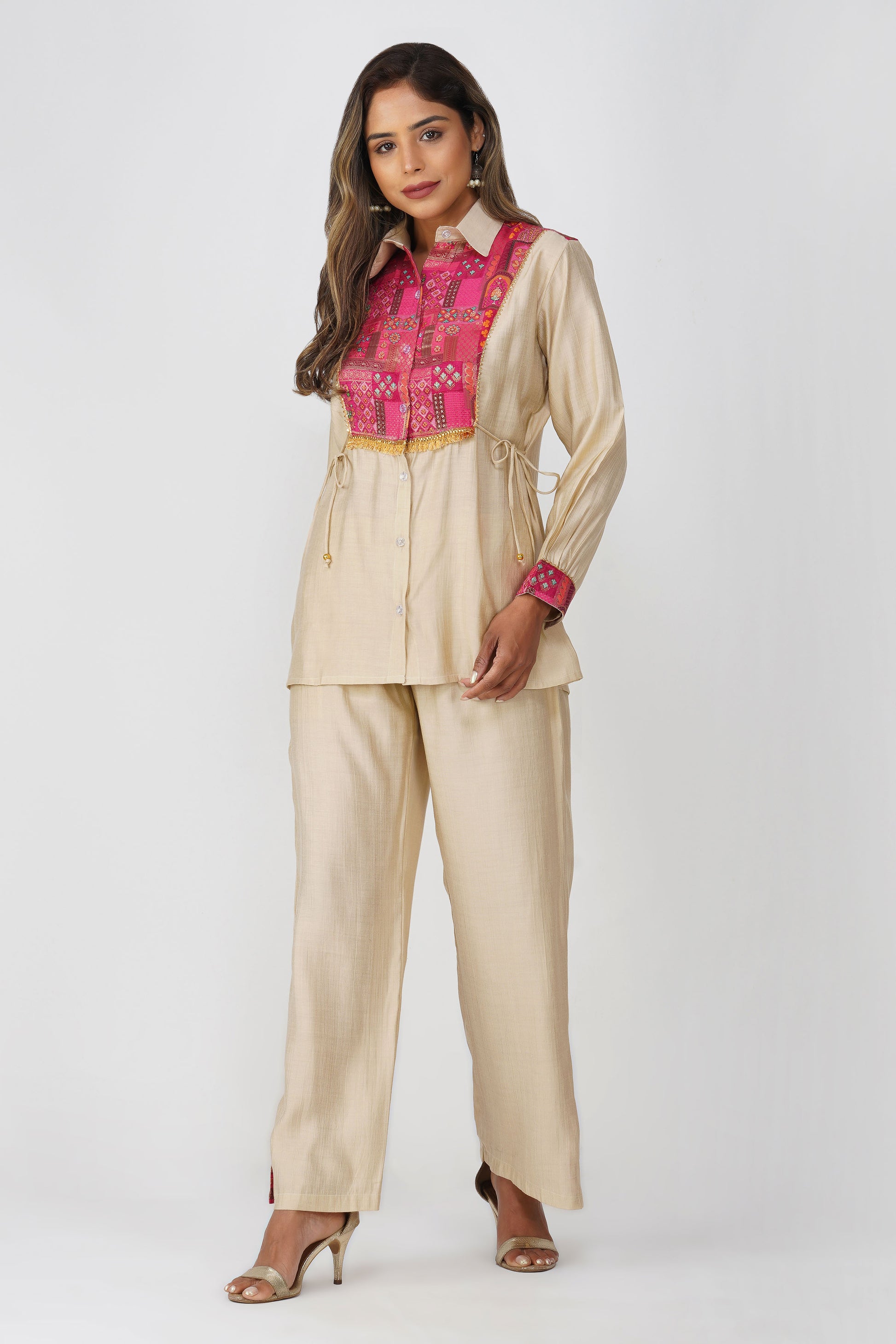 Elegance meets festive flair in this Indo-western co-ord set that’s perfect for special occasions, intimate gatherings, or when you want to show up with effortless grace 💫 Crafted in a rich silk blend with a natural sheen, this Set of 2 features a shirt with a bold Banarasi Dola Silk placket yoke in vibrant rani pink 💖, finished with golden fringe lace for that extra glam 💛 The shirt cuffs and palazzo hems mirror the Banarasi accents, tying the look together with luxe symmetry. The palazzo pants include a pocket and are tailored for a comfort fit — your go-to festive dressing sorted ✔️ The tie-up yokes make the fitting a perfect situation.