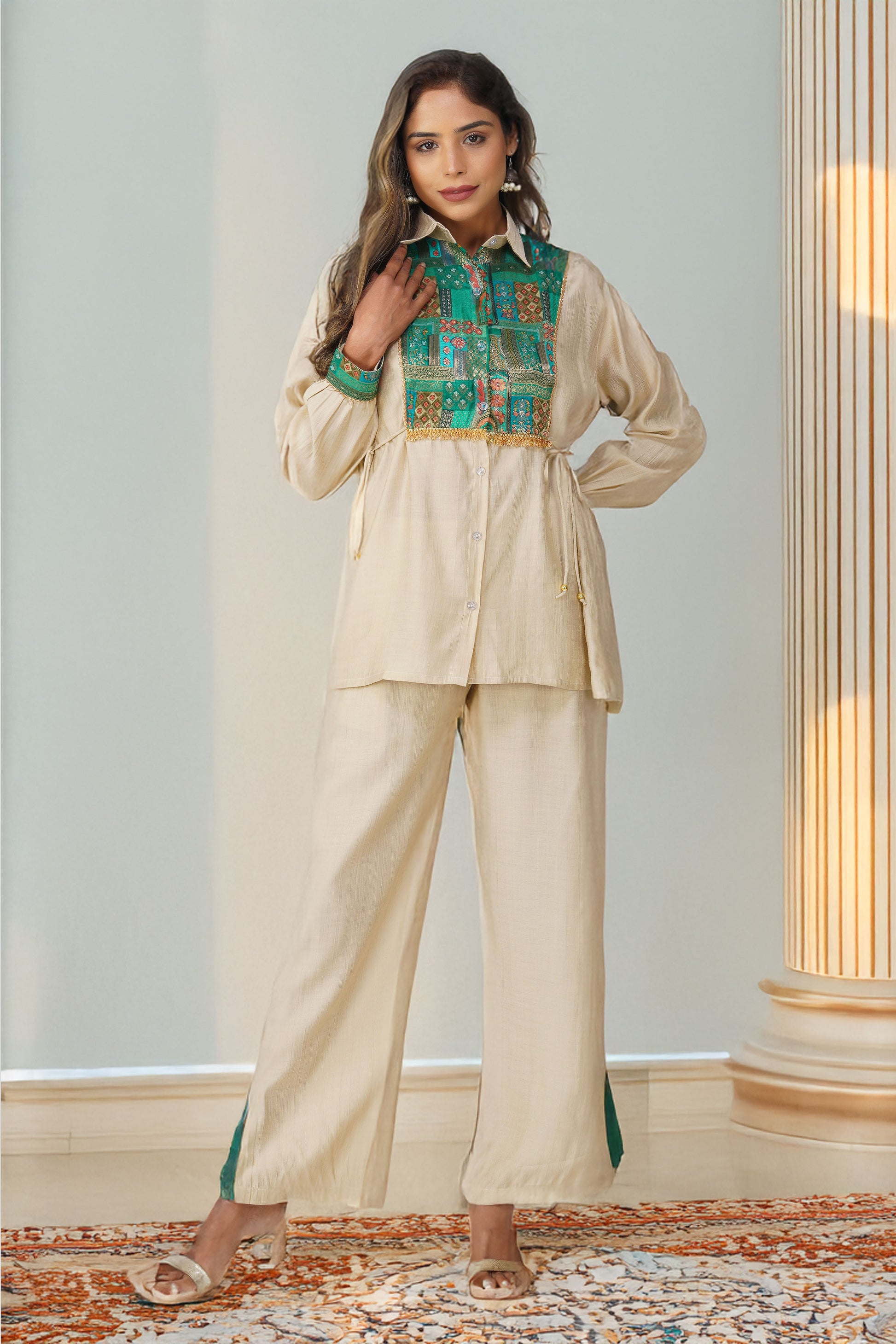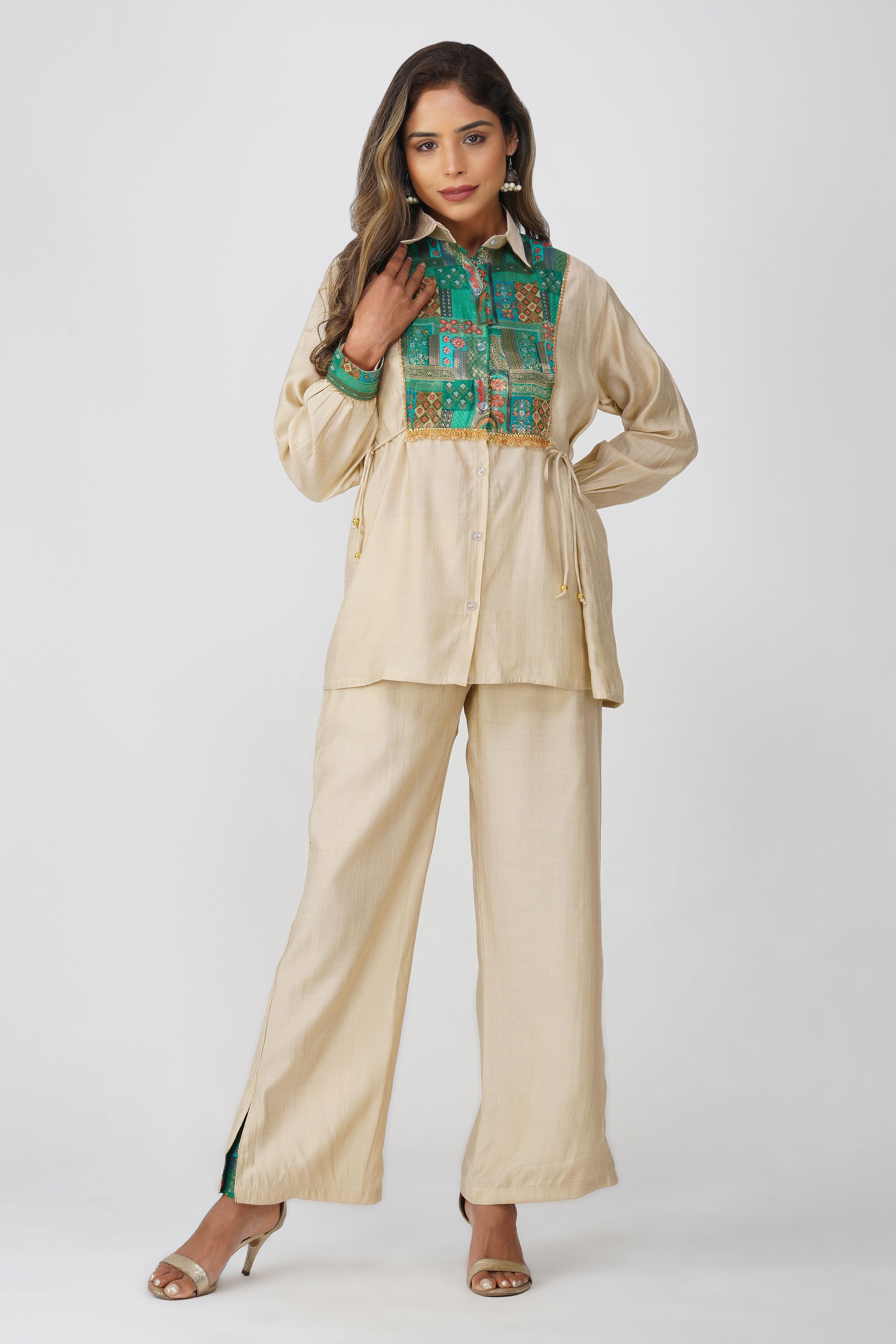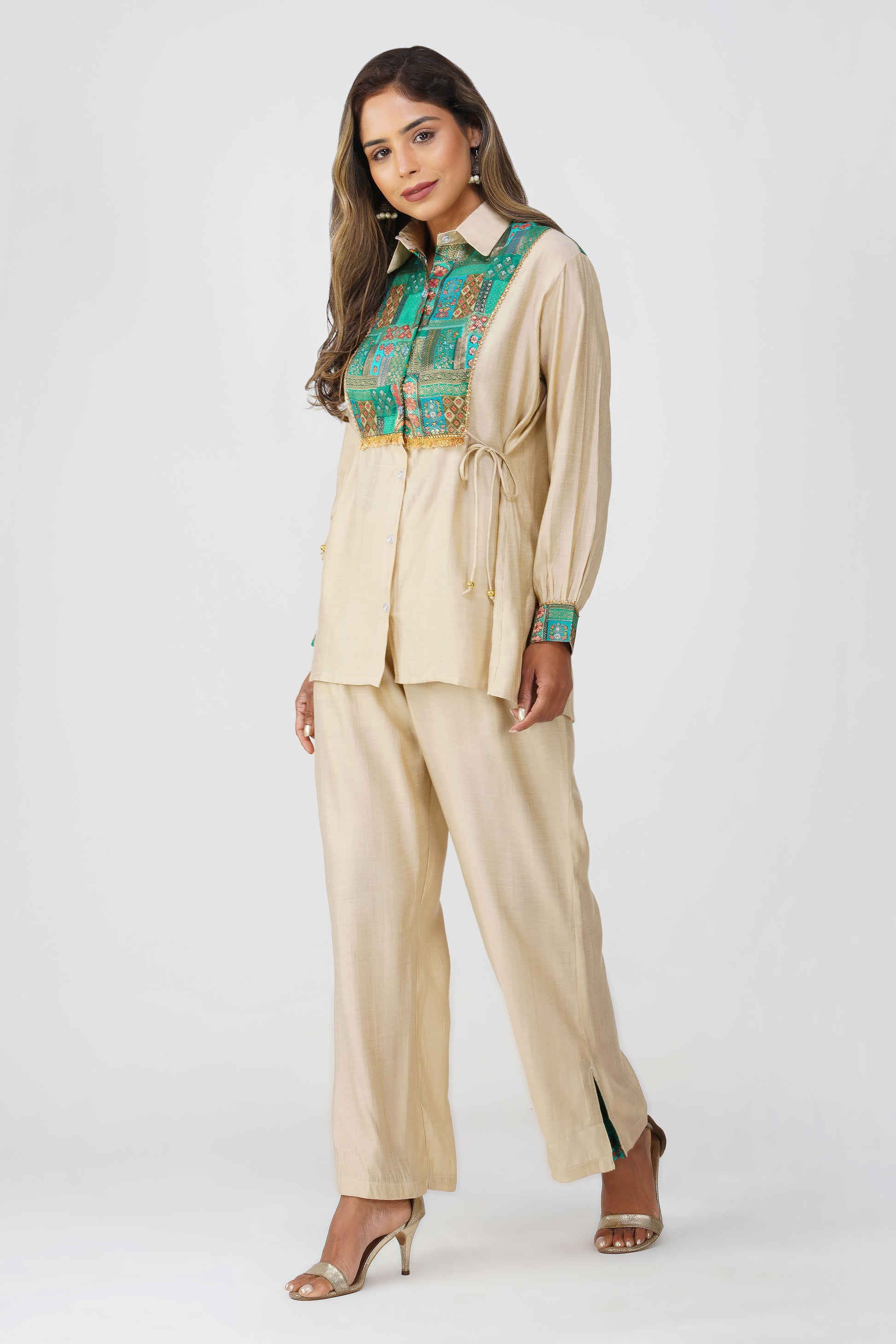 This elegant fusion coord set is designed to bring just the right amount of glam to your festivities and soirées 💚 Crafted in a glossy silk blend, this Set of 2 features a relaxed shirt with a striking emerald green Banarasi Dola Silk placket yoke — accentuated with a delicate fringe lace that adds regal charm 💛 Banarasi details on the cuffs and palazzo hem tie the look together for a stunning, coordinated vibe. The tie-up yokes make the fitting a perfect situation.