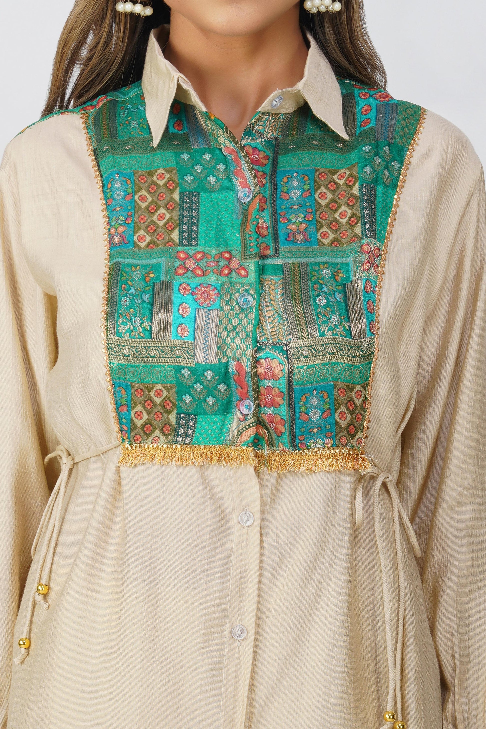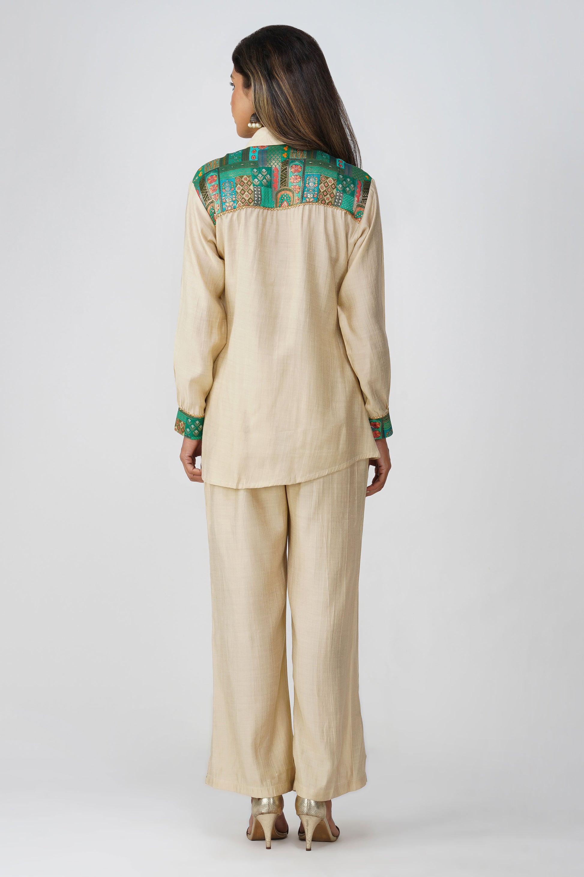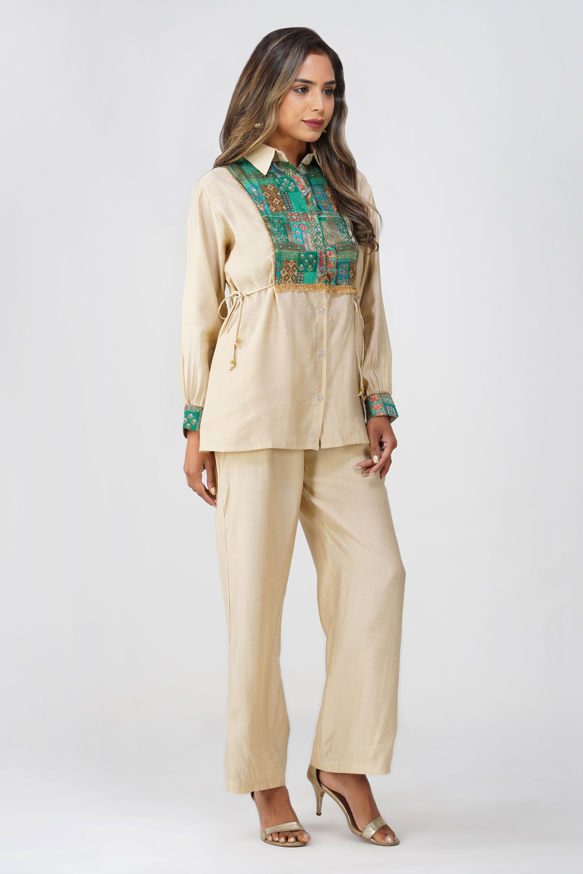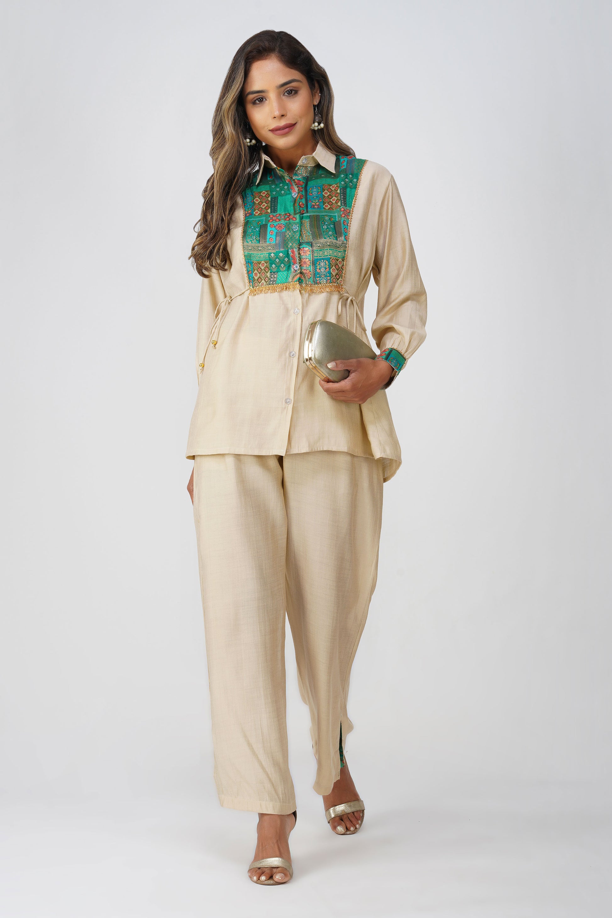 This elegant fusion coord set is designed to bring just the right amount of glam to your festivities and soirées 💚 Crafted in a glossy silk blend, this Set of 2 features a relaxed shirt with a striking emerald green Banarasi Dola Silk placket yoke — accentuated with a delicate fringe lace that adds regal charm 💛 Banarasi details on the cuffs and palazzo hem tie the look together for a stunning, coordinated vibe. The tie-up yokes make the fitting a perfect situation.