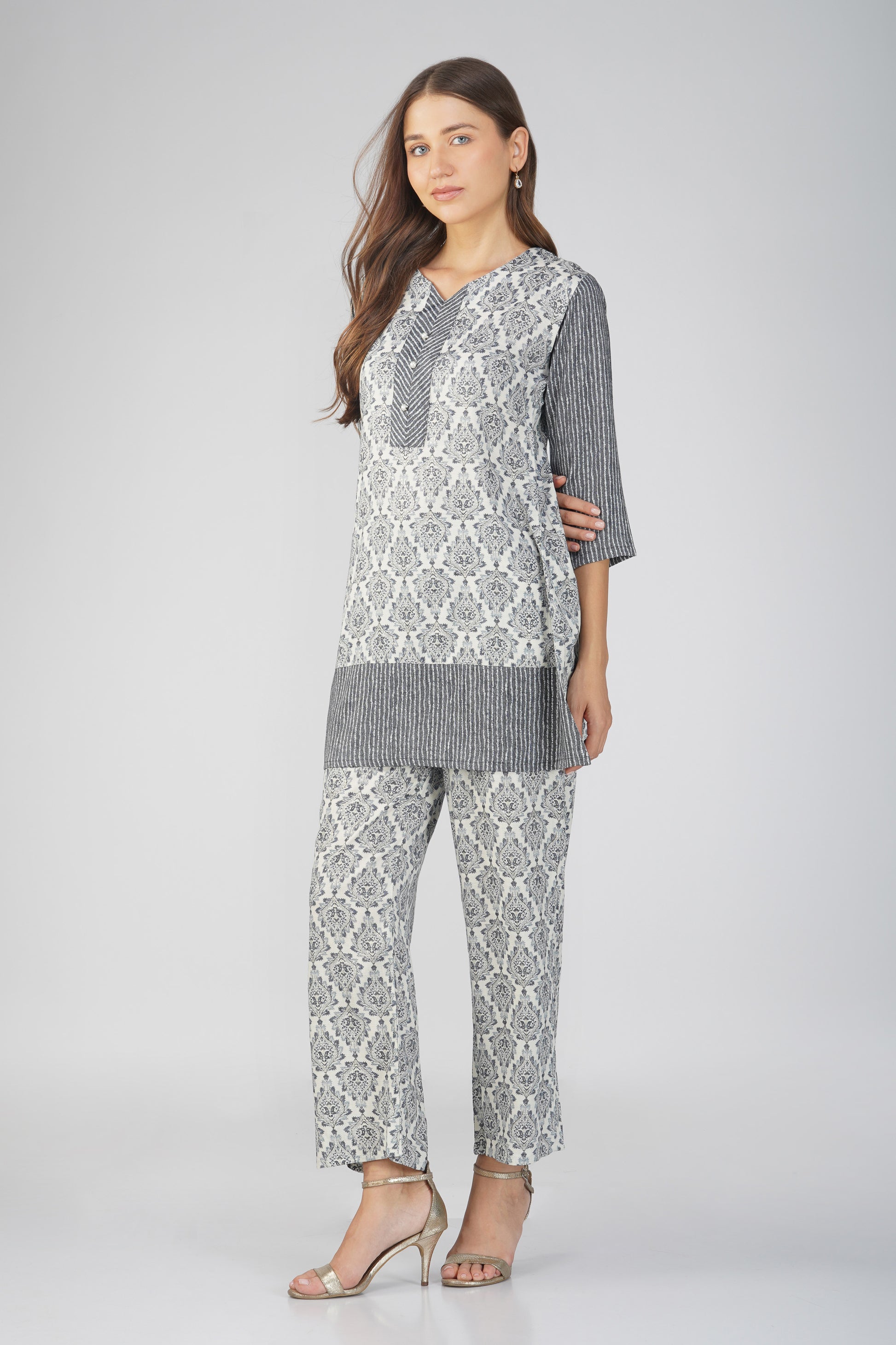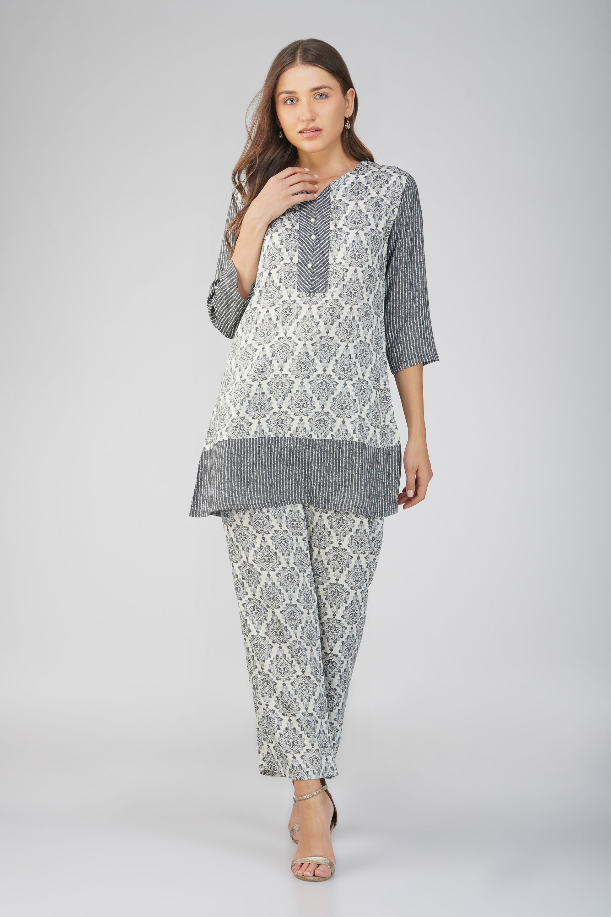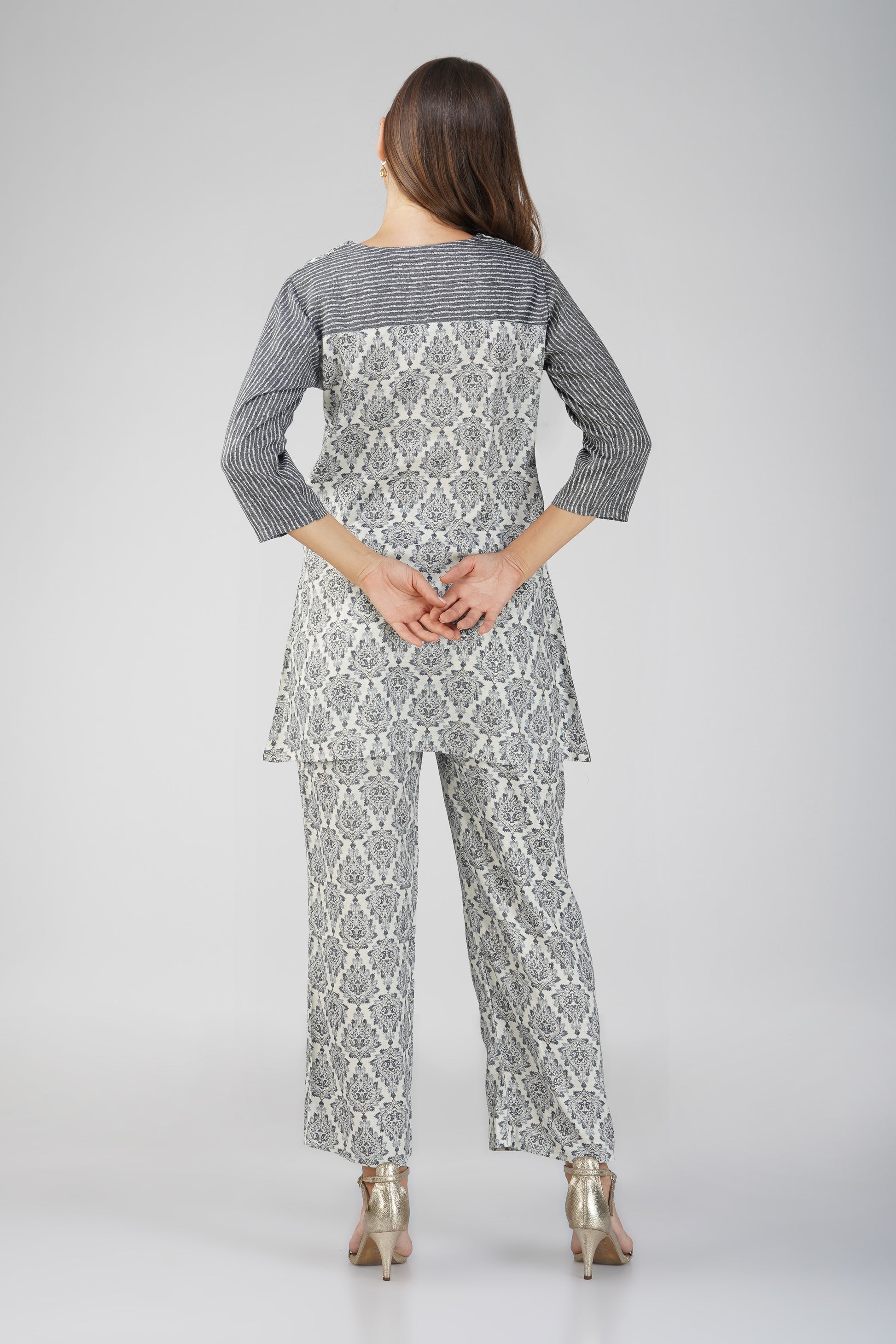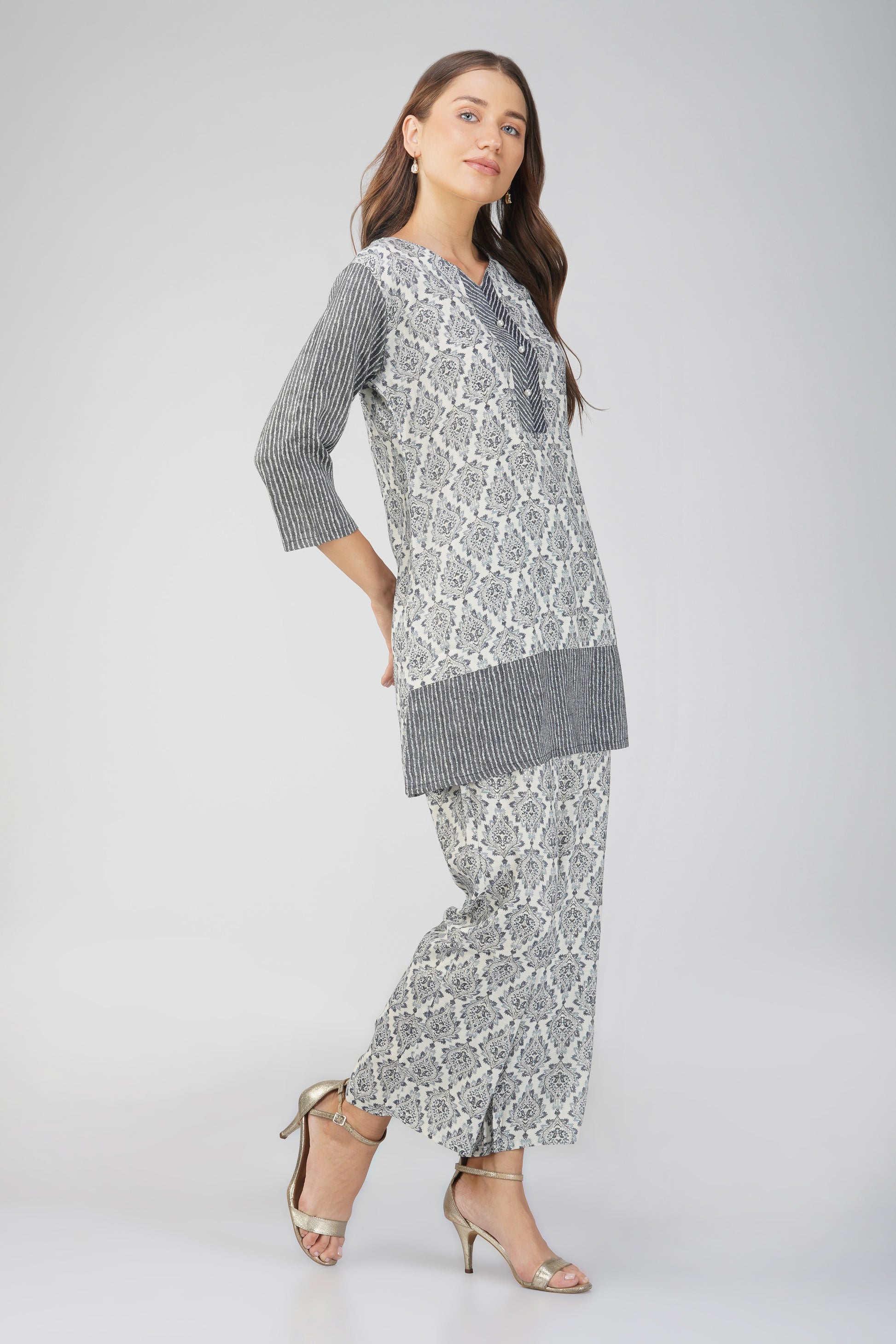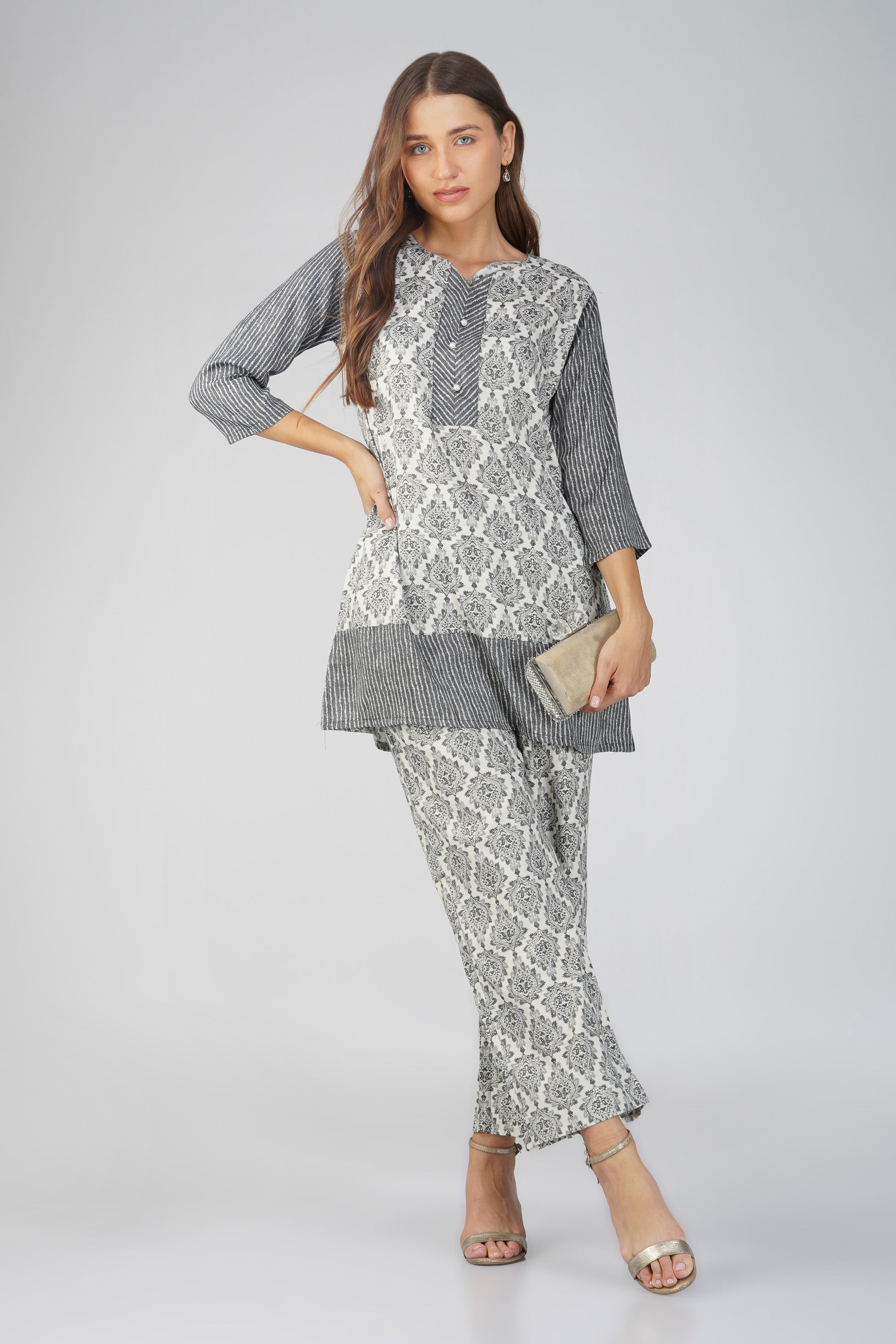 Indigo Lines Black Co-ord Set β Block Print Tunic with Striped Pants & Pearl Buttons