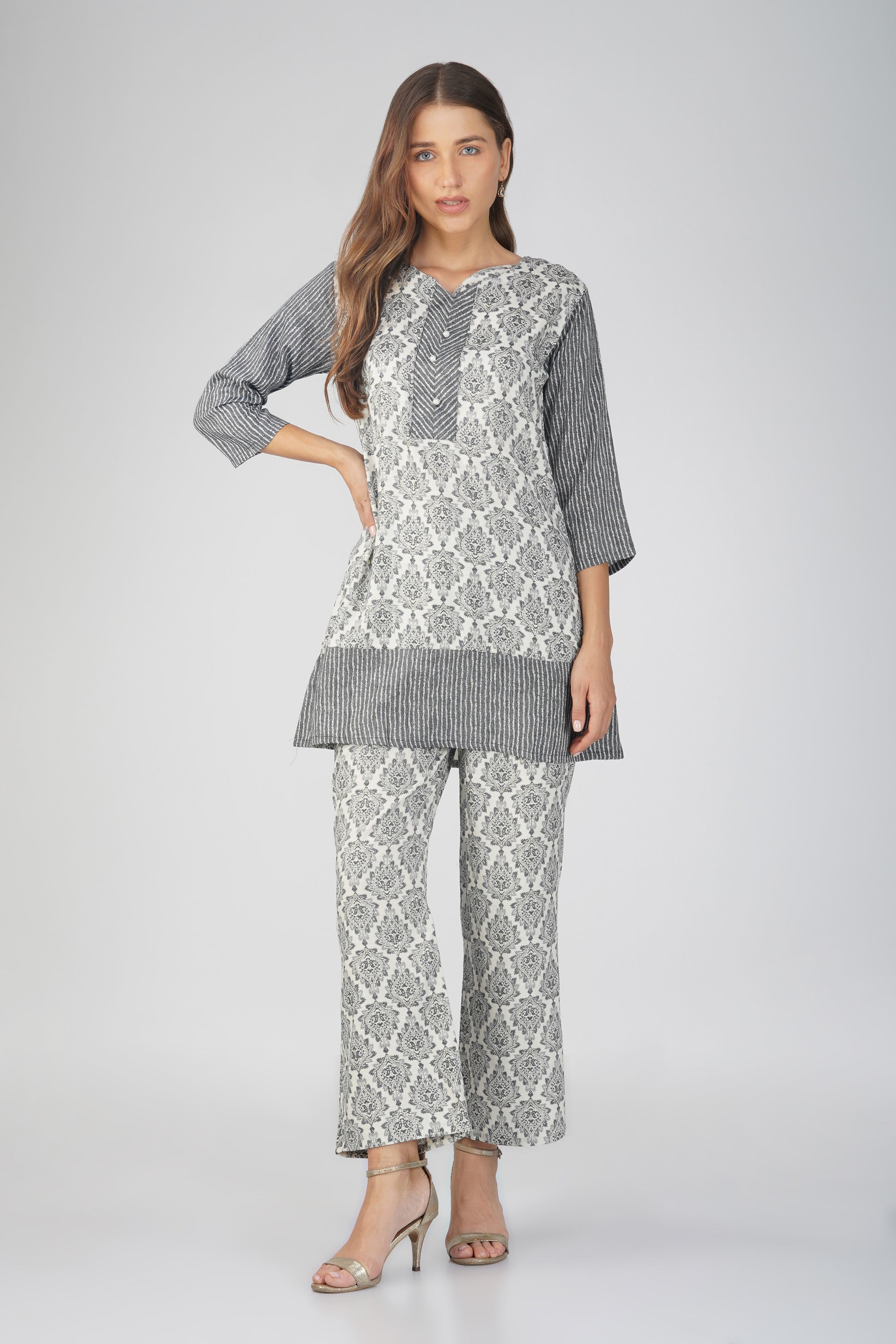 Subtle stripes, soft structure ๐ โ Indigo Lines is a beautifully balanced tunic co-ord crafted for the everyday. Featuring classic block prints with striped panels and pearl buttons at the V-neck, it pairs with regular-fit striped bottoms that include a functional pocket. Itโs tailored comfort with a touch of quiet elegance.