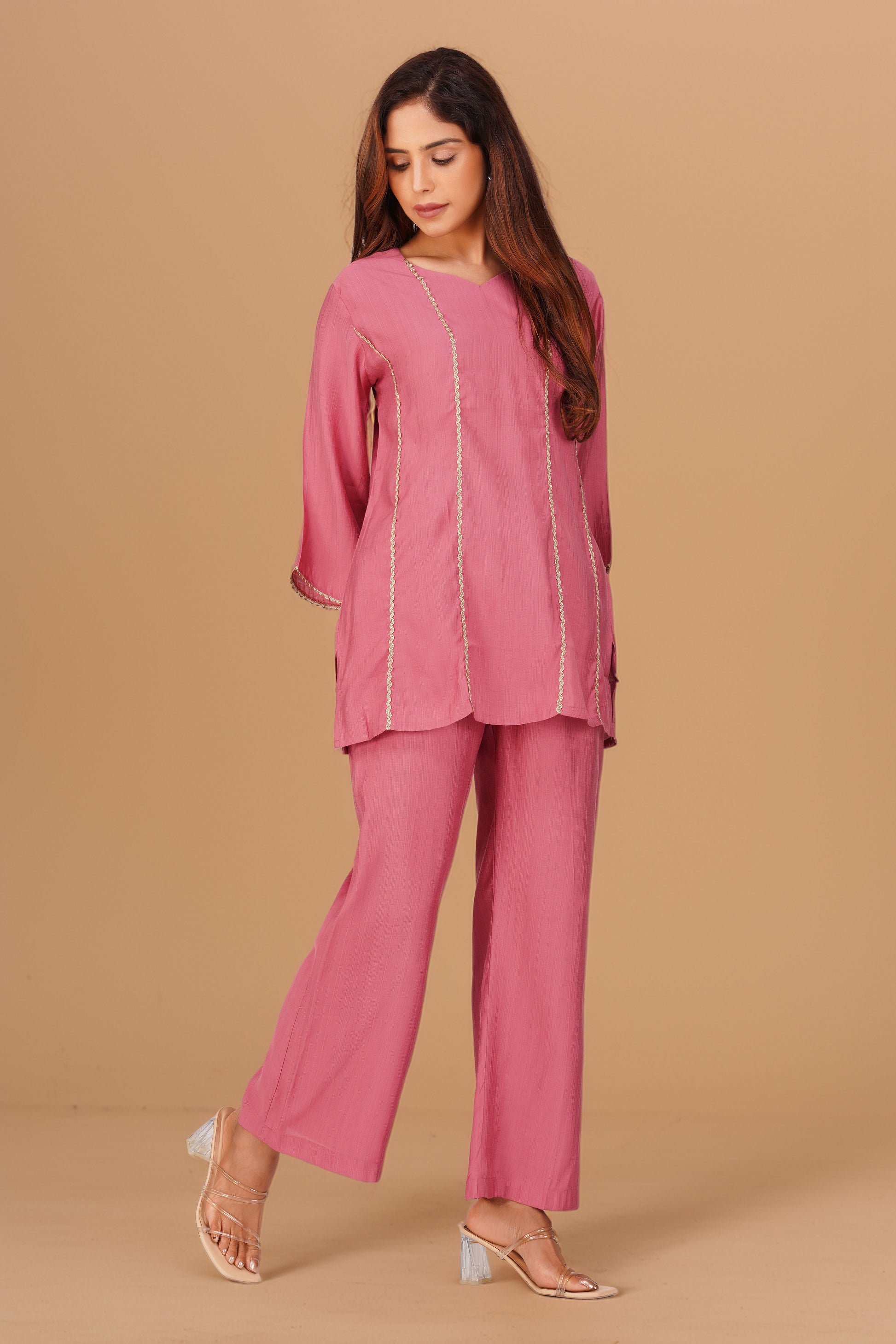 Cham Cham Co-ord Set – Onion Pink | Elegant V-Neck Short Kurta with Gold Threads – Bindigasm