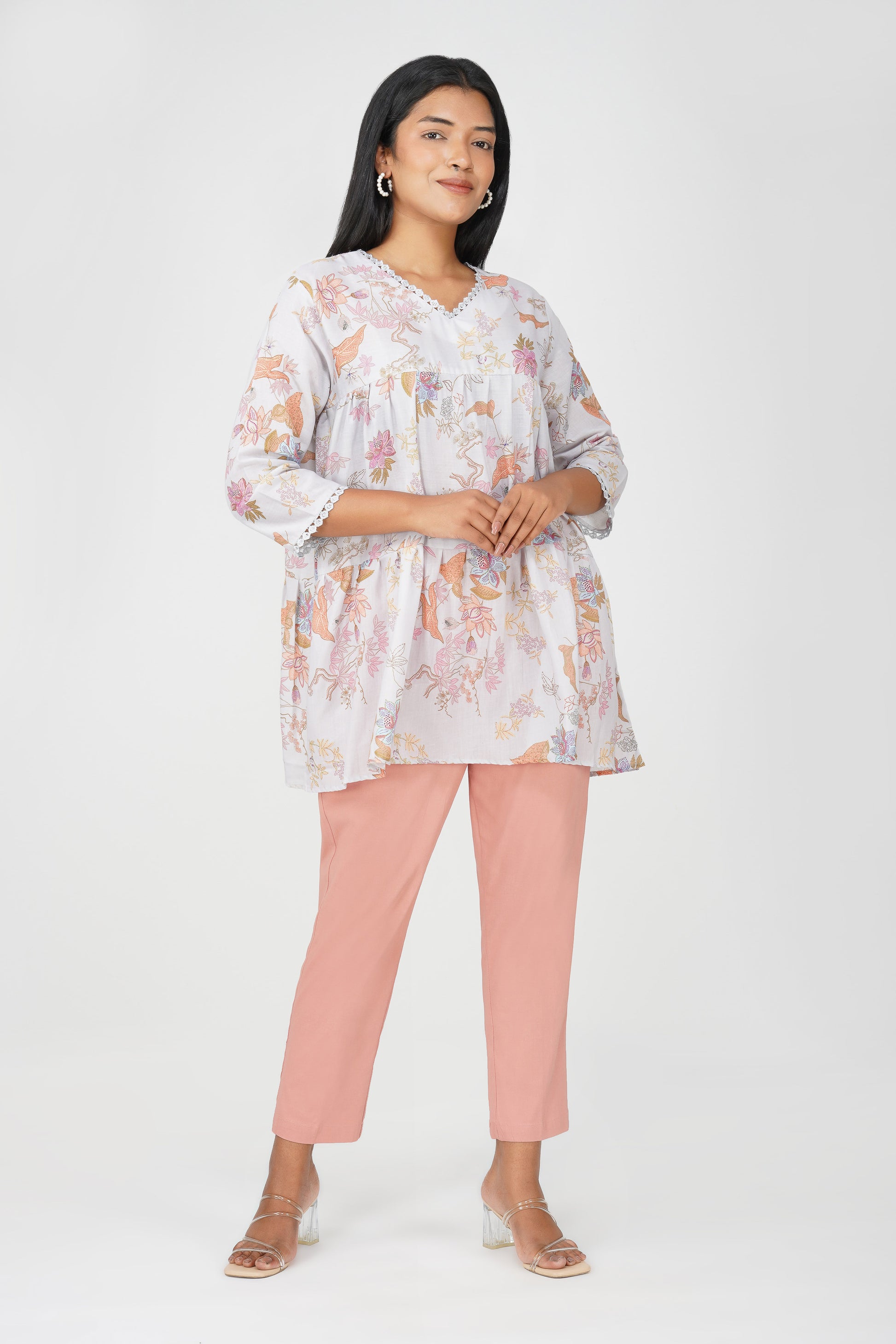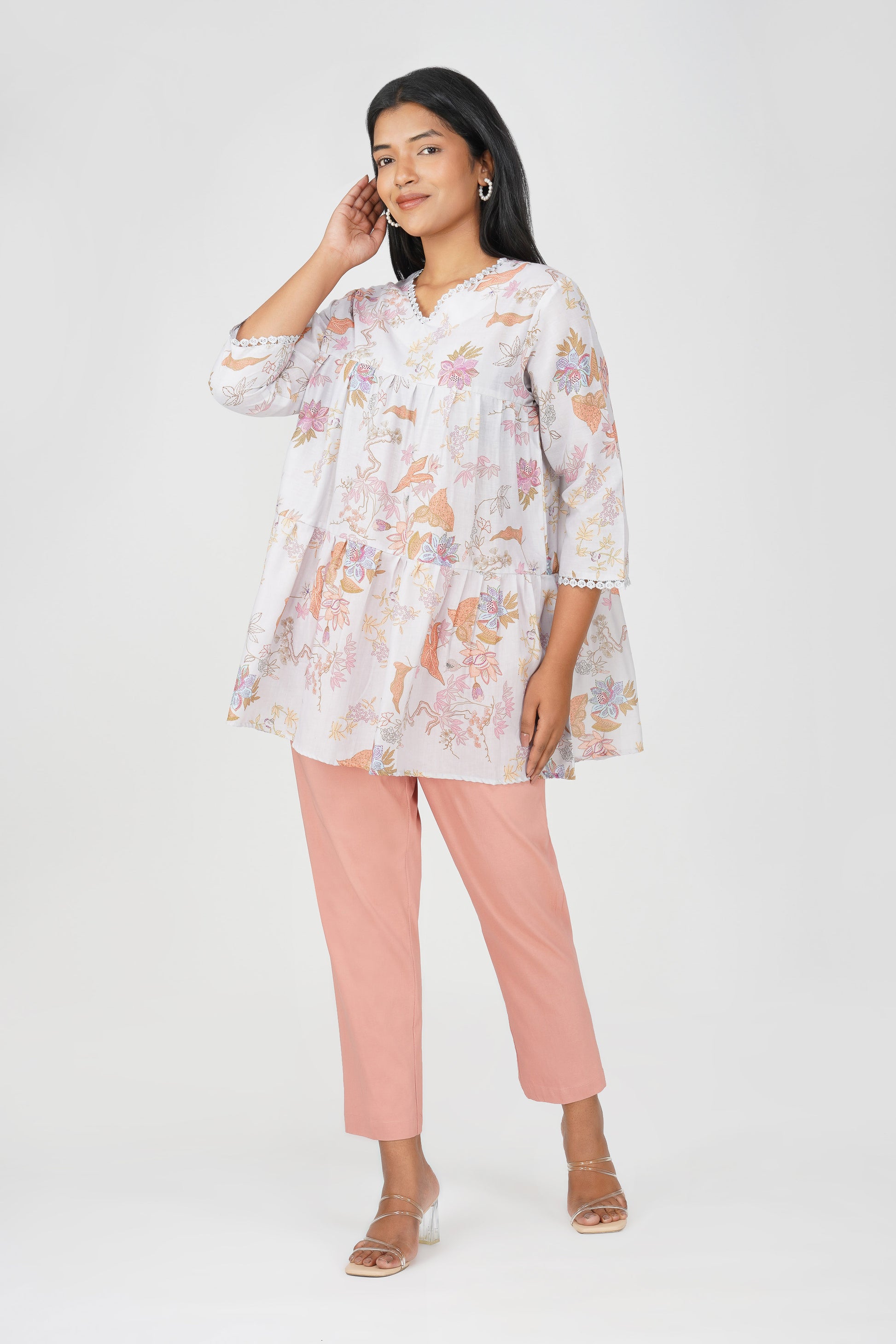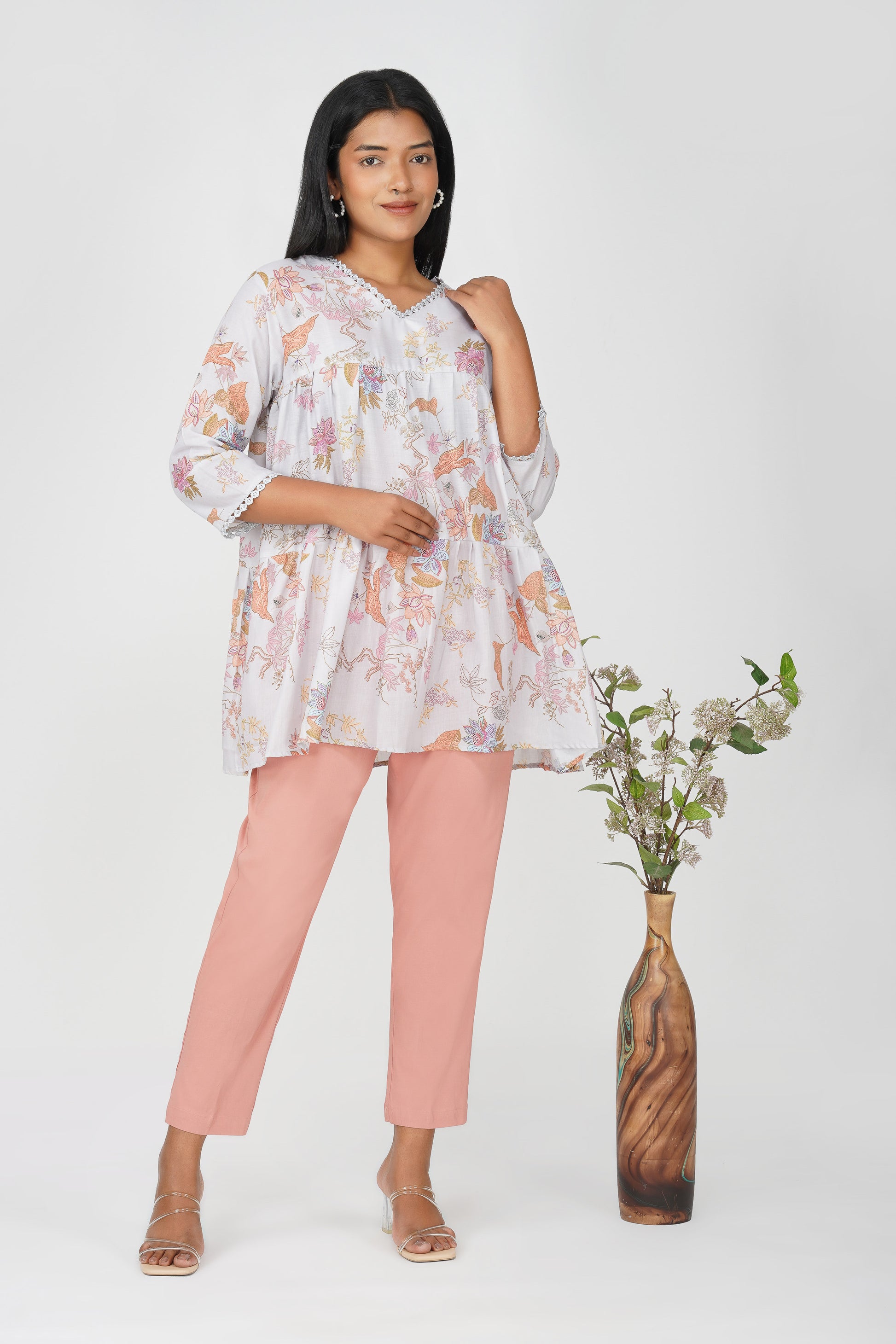 An airy cotton peplum top 🌿 in muted foliage print, tiered and trimmed with lace for a hint of detail. Paired with solid peach straight-fit trousers, this co-ord set brings softness, shape, and structure — a fresh pick for days when comfort and charm need to coexist.