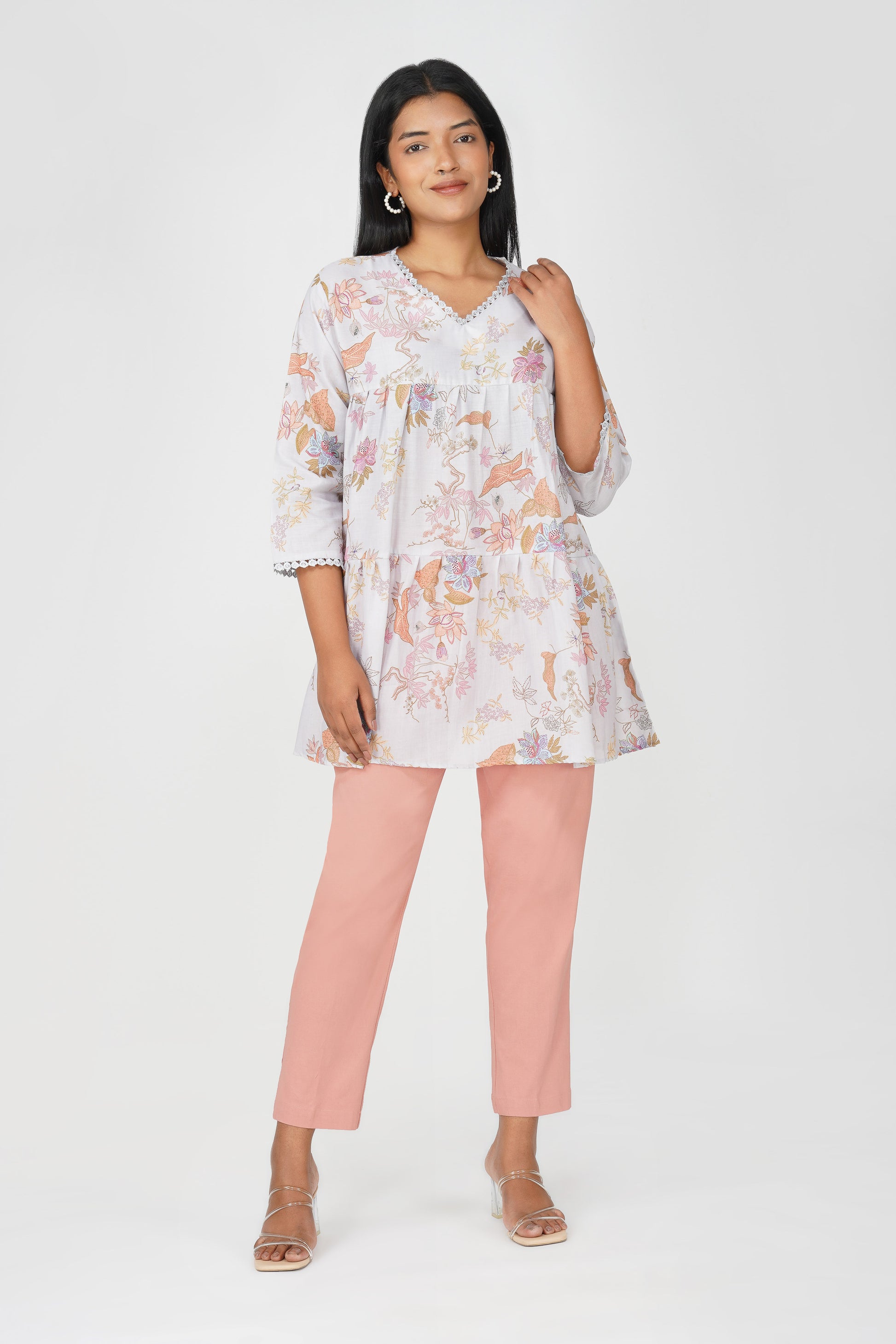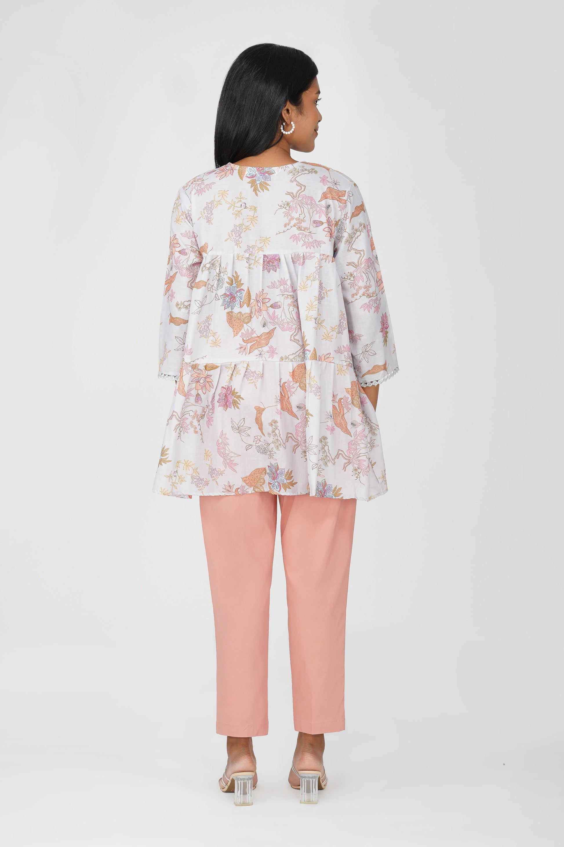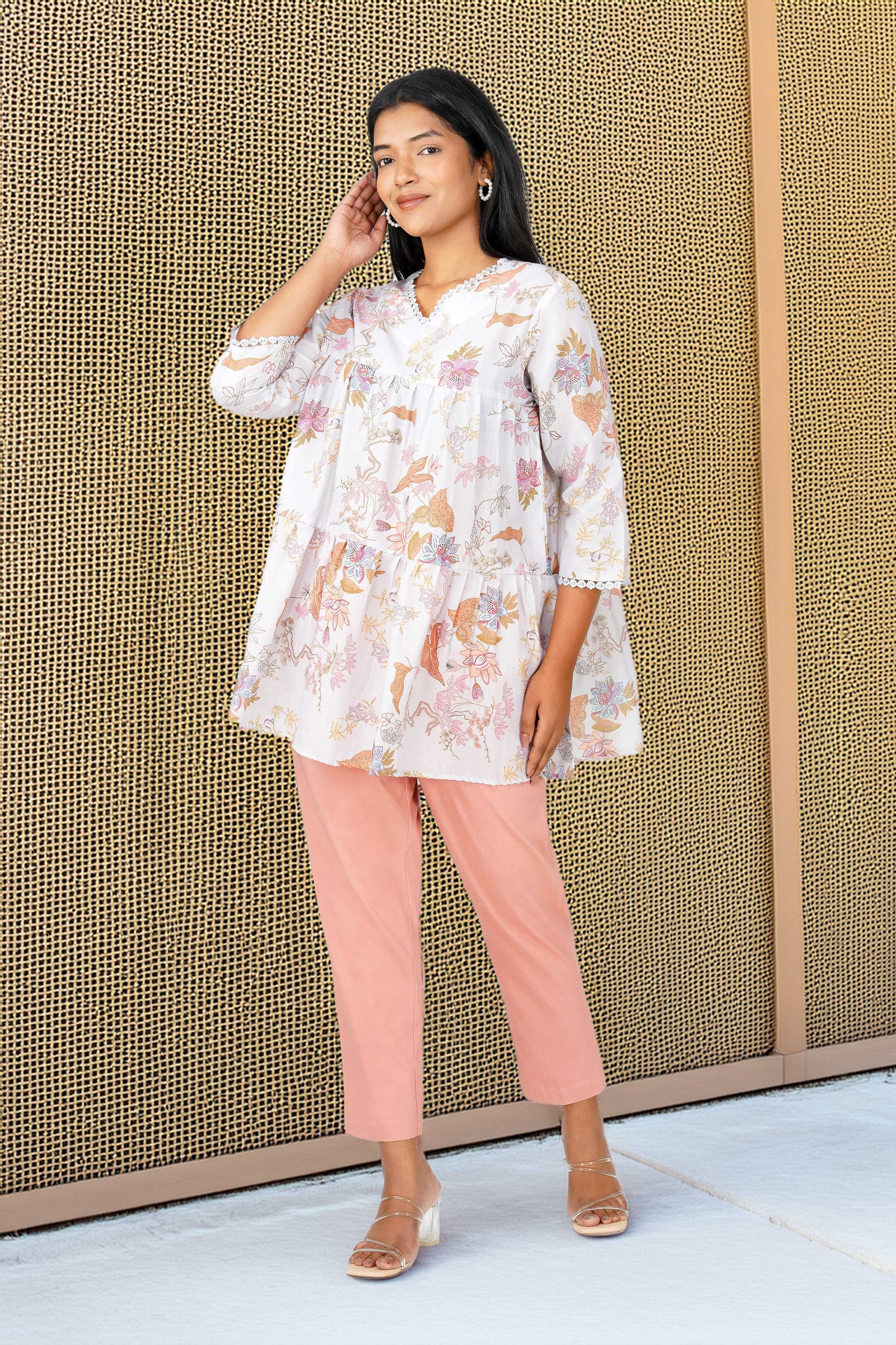 An airy cotton peplum top 🌿 in muted foliage print, tiered and trimmed with lace for a hint of detail. Paired with solid peach straight-fit trousers, this co-ord set brings softness, shape, and structure — a fresh pick for days when comfort and charm need to coexist.