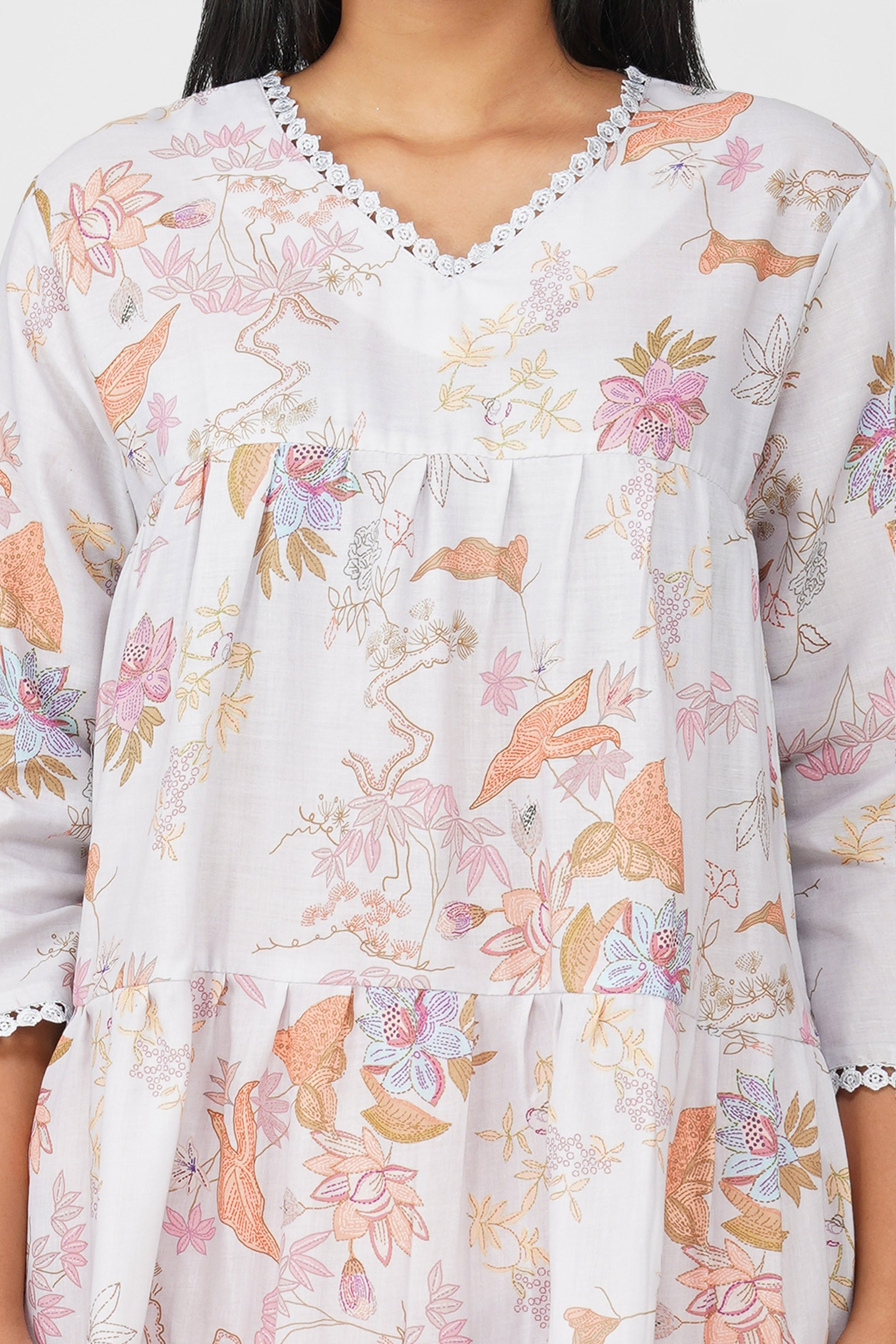 Grey Foliage Peplum Co-ord Set – Tiered Cotton Top with Moss Green Pants