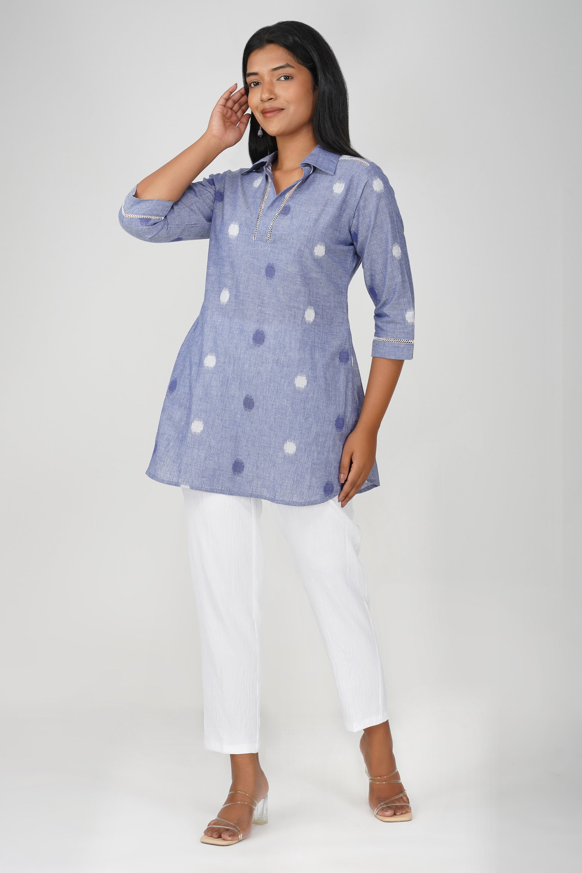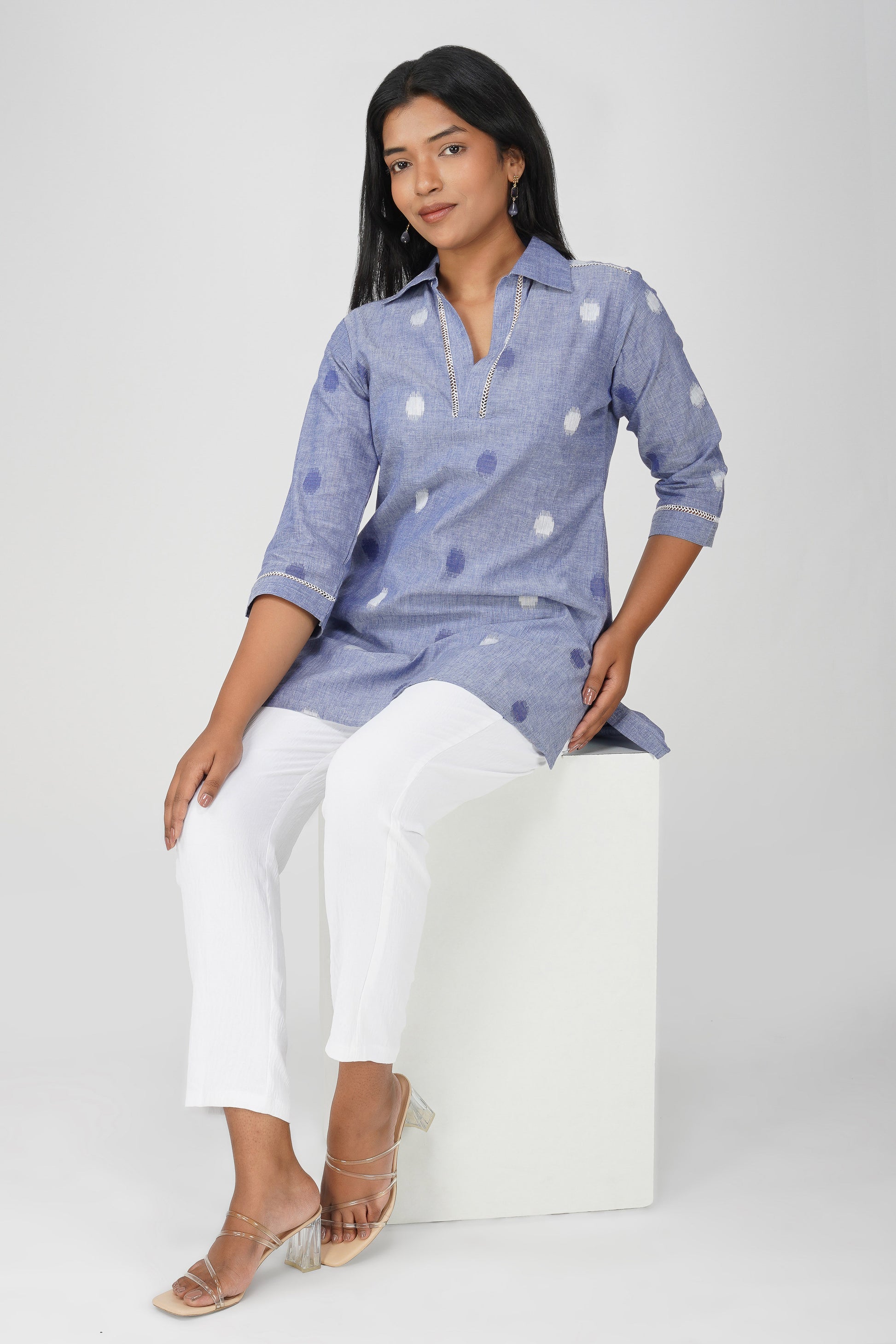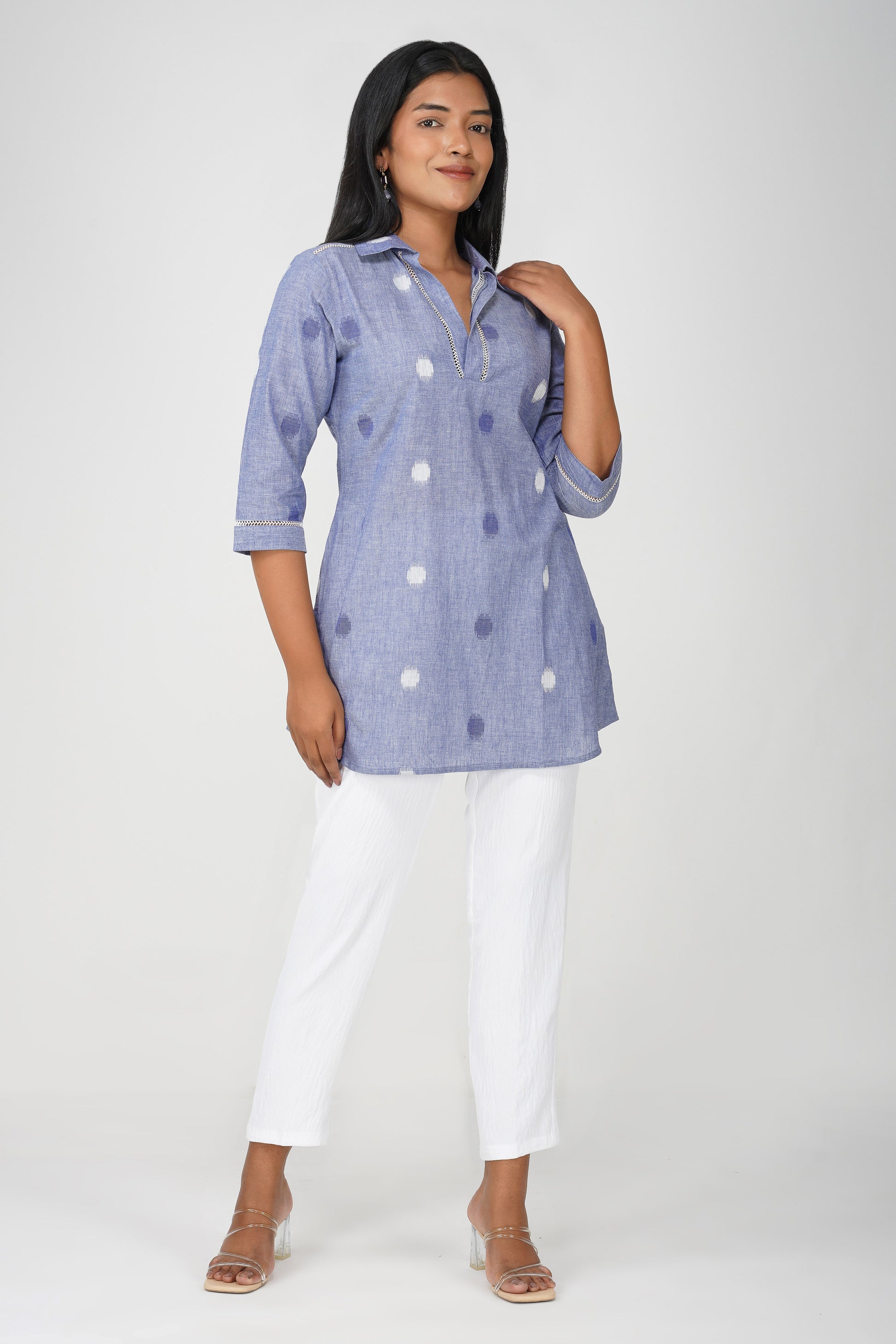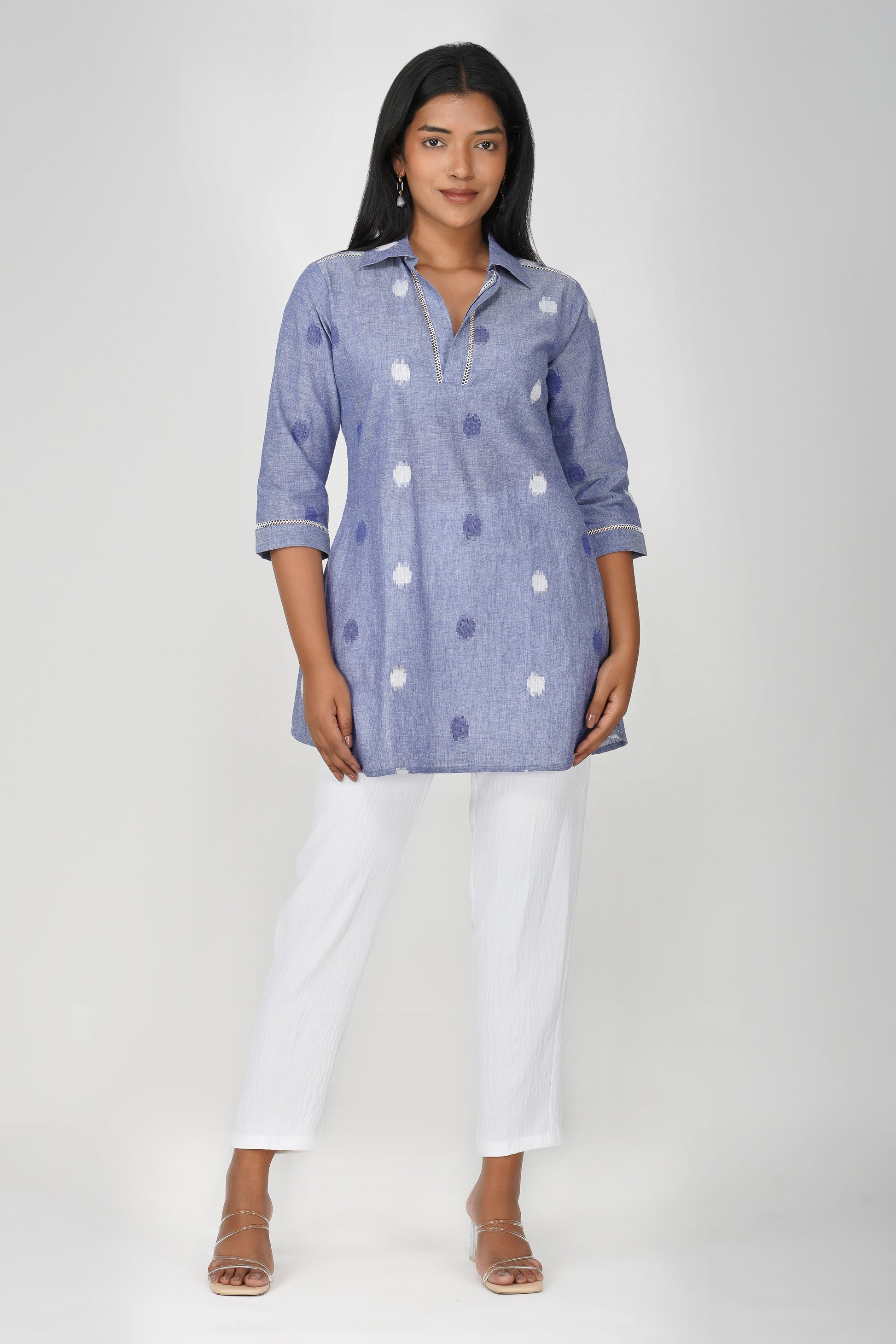 Blue Buti Cotton Co-ord Set – Shirt Collar Tunic with White Relaxed Pants