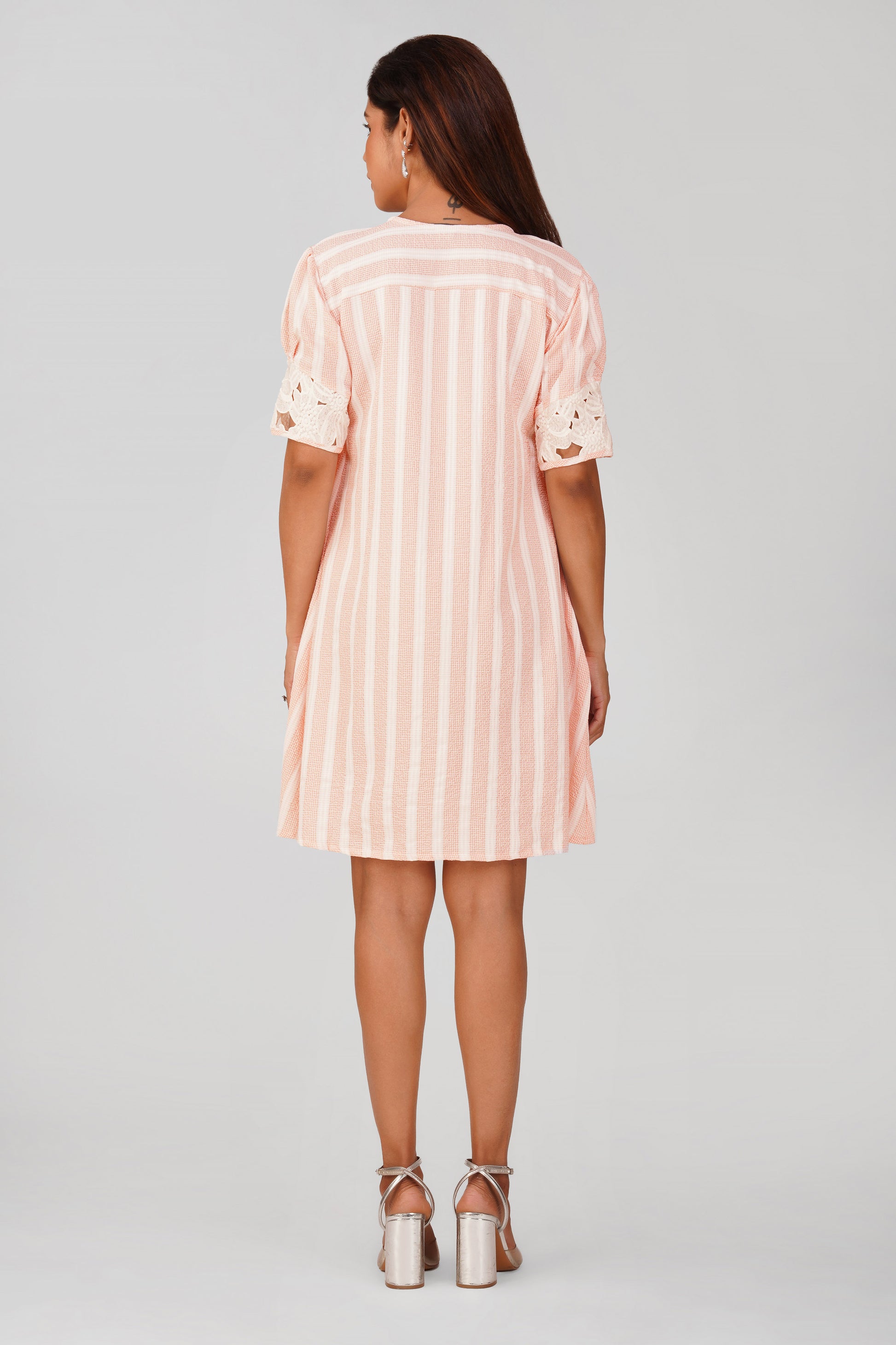 Flowy, fun and feminine — the Soft Peach Glaze version of our Diti Dress is made for dreamy days. Crafted in a textured cotton stripe fabric, it features a handcrafted crochet flower at the bust and puff sleeves with tonal embroidered lace.