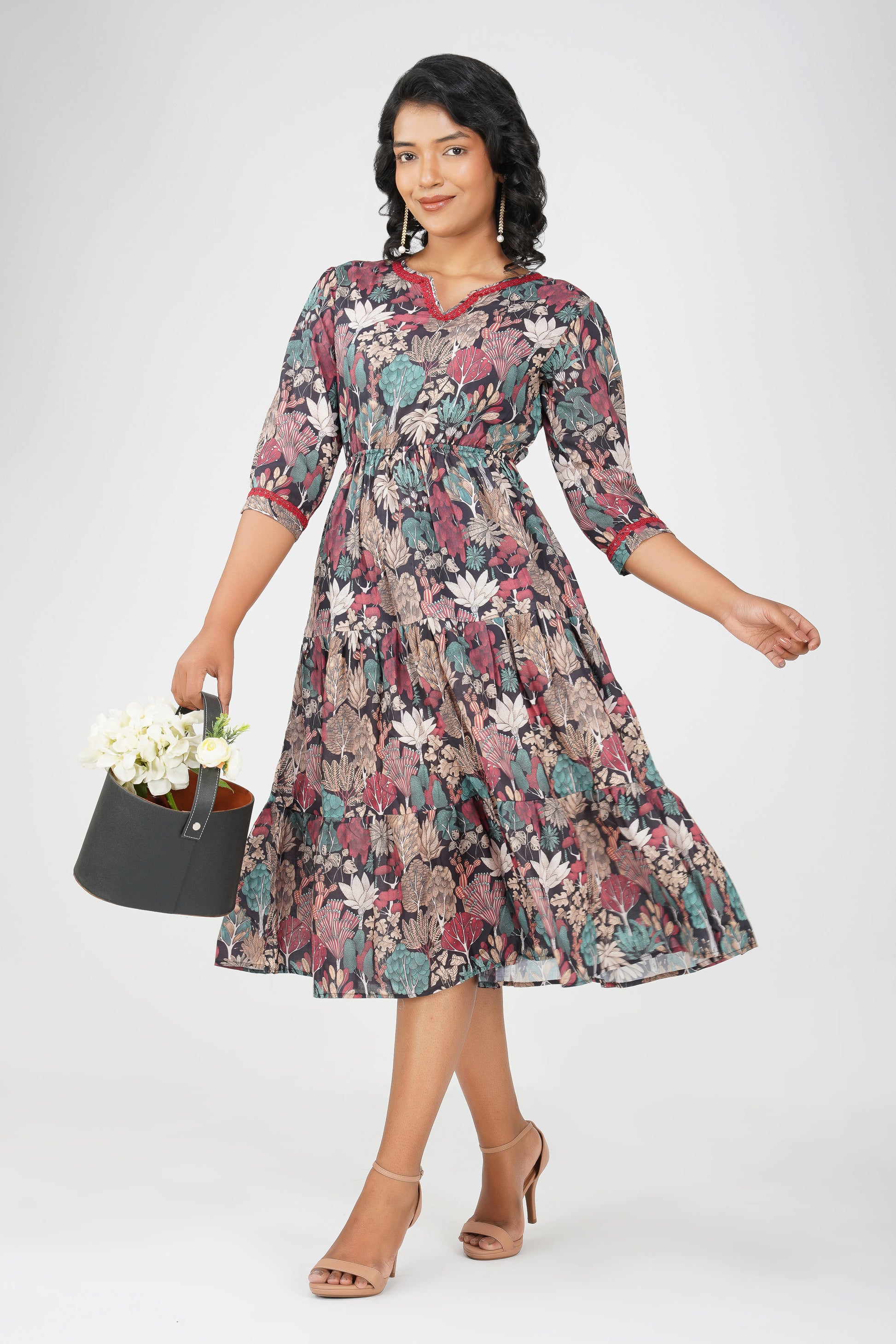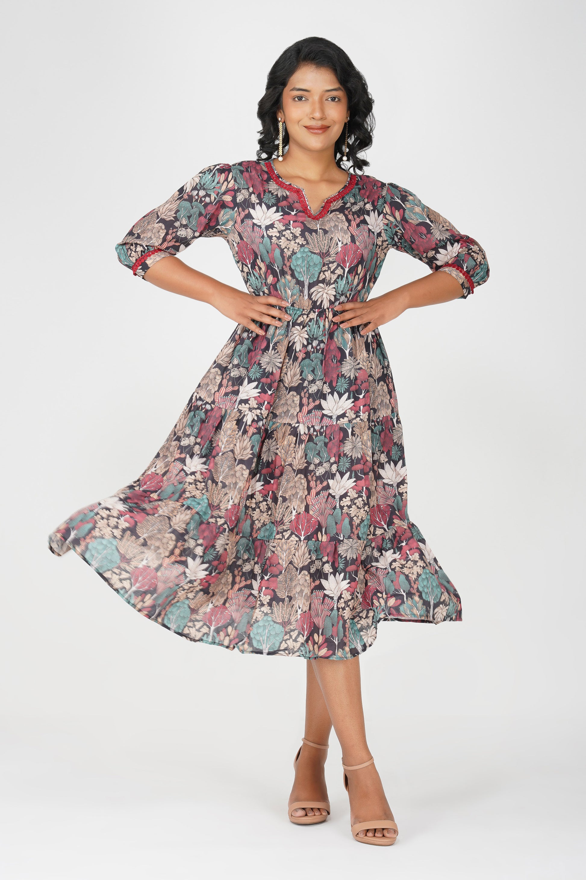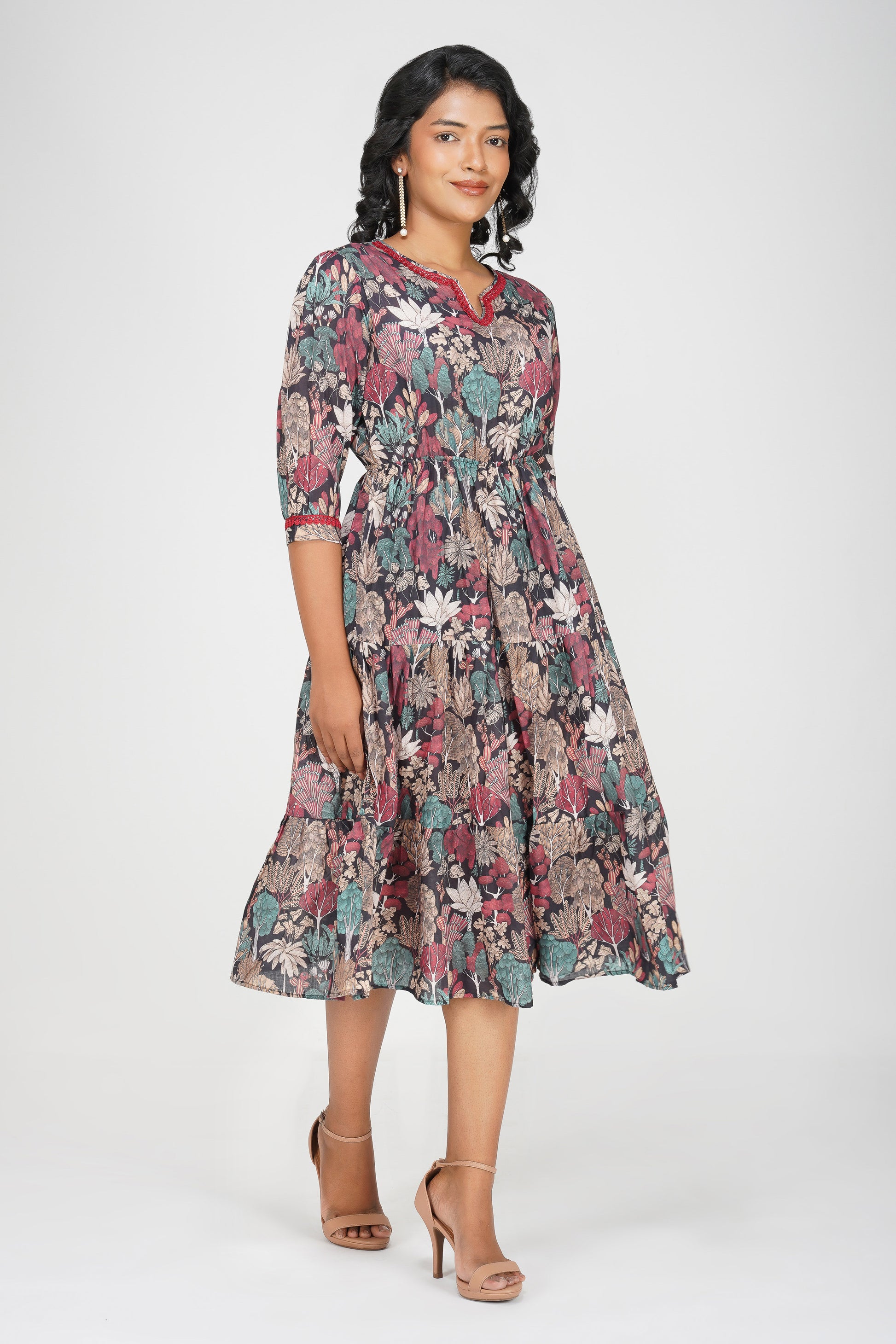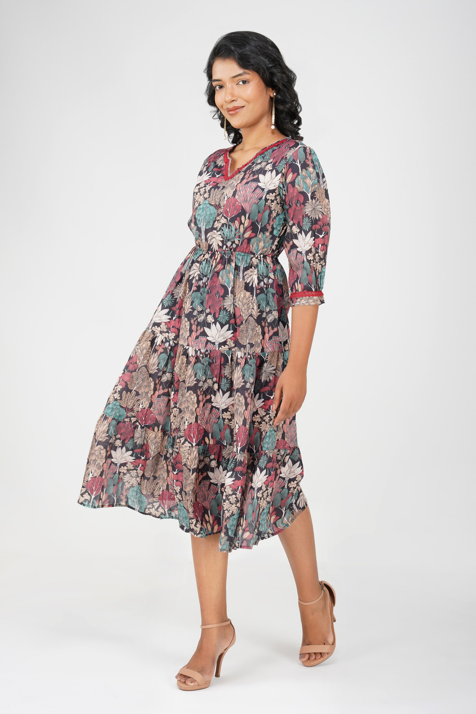 Eva Black Forest Print Cotton Blend Tier Midi Dress
