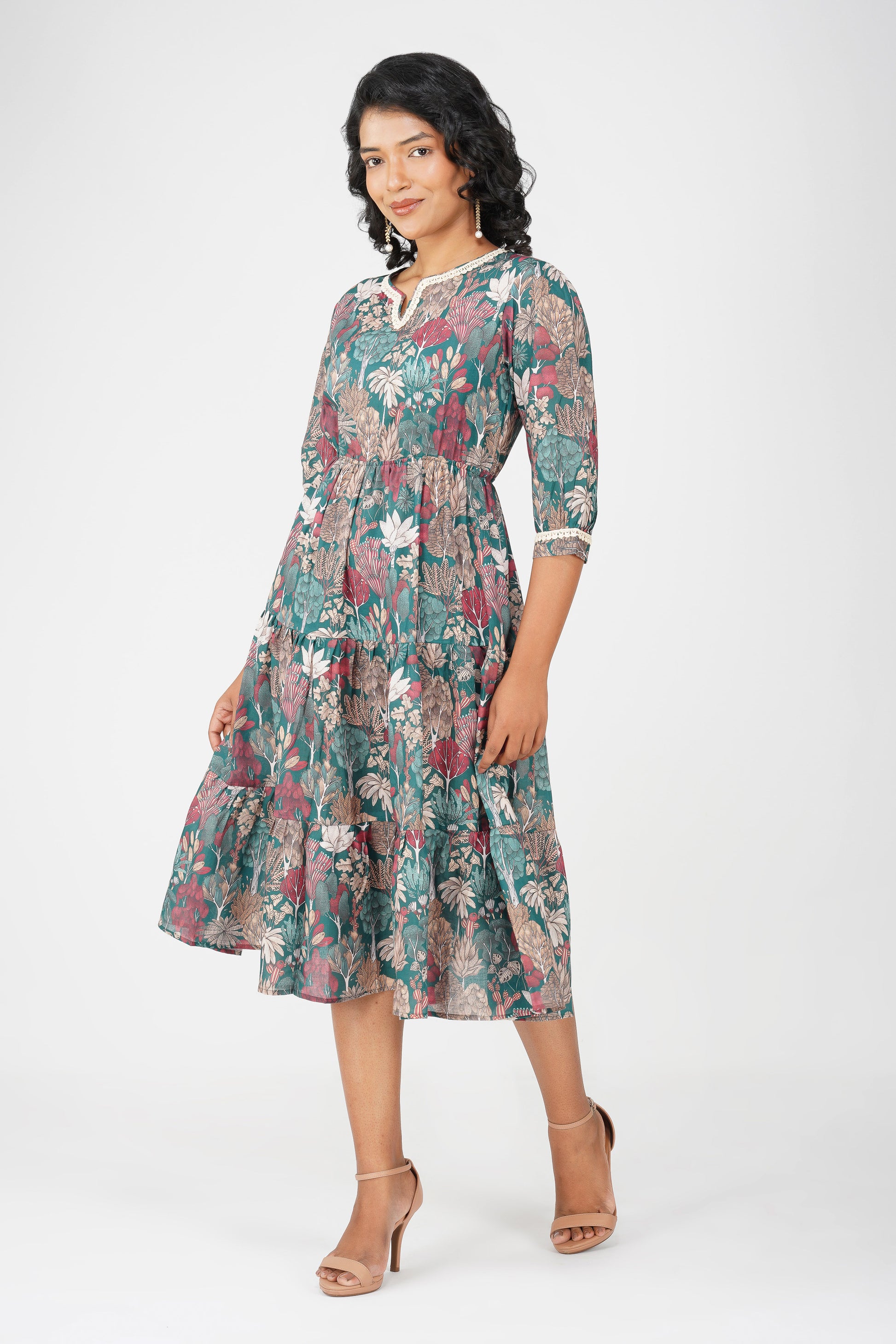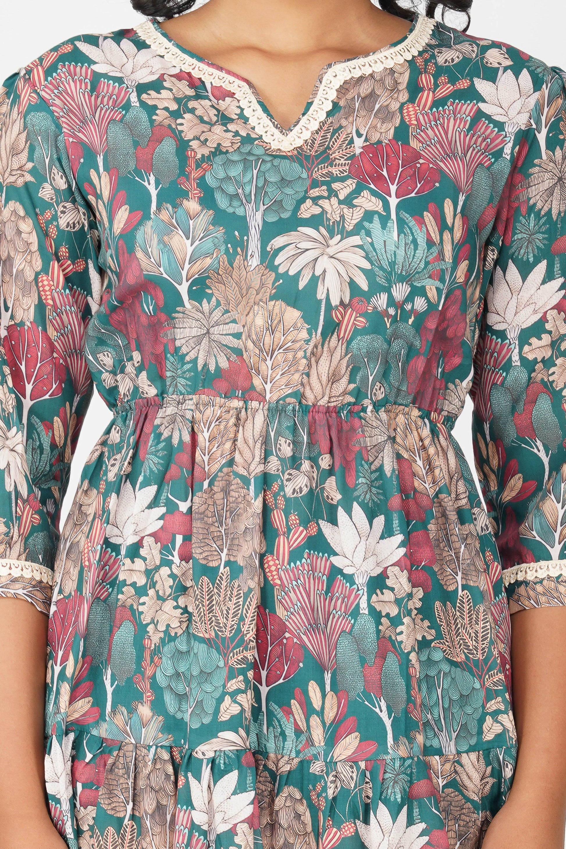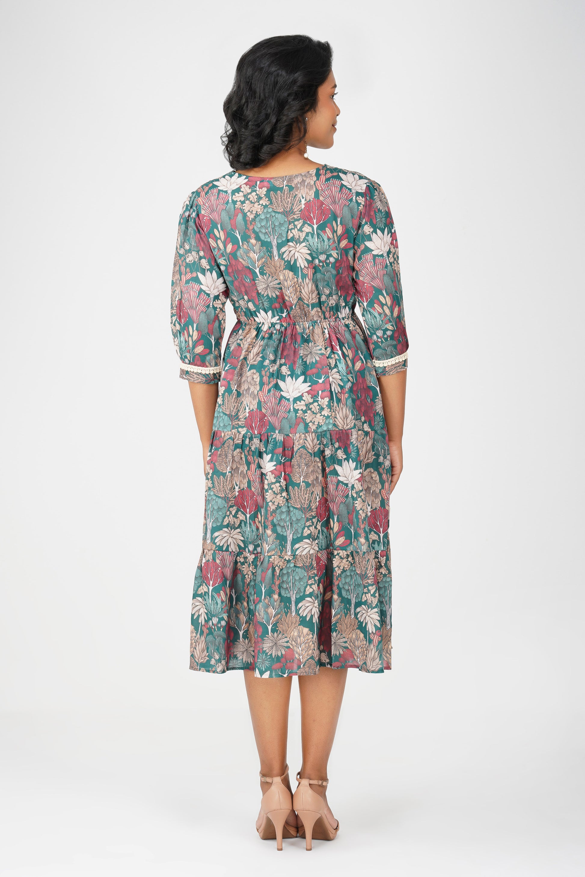 Eva Green Forest Print Cotton Blend Tier Midi Dress