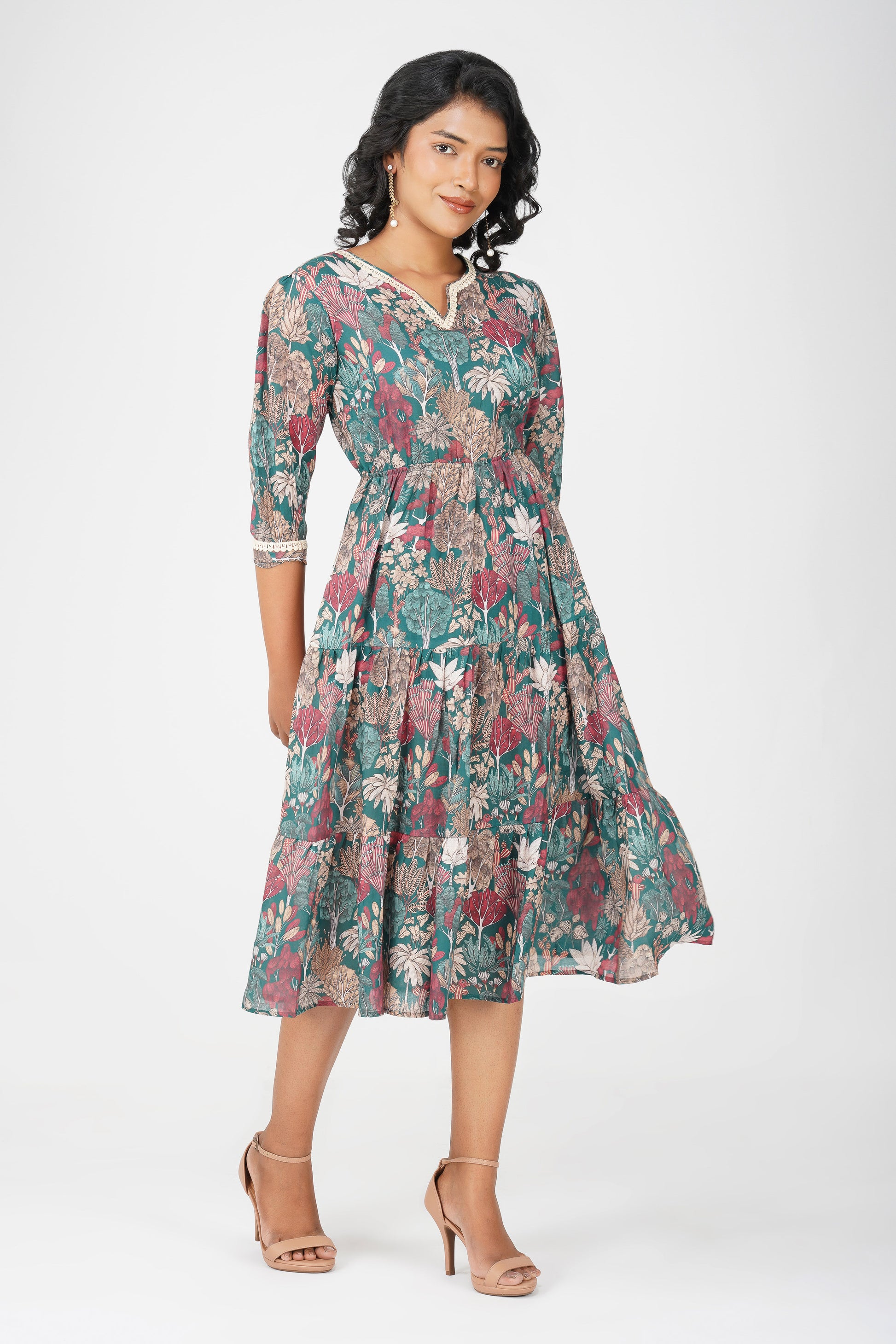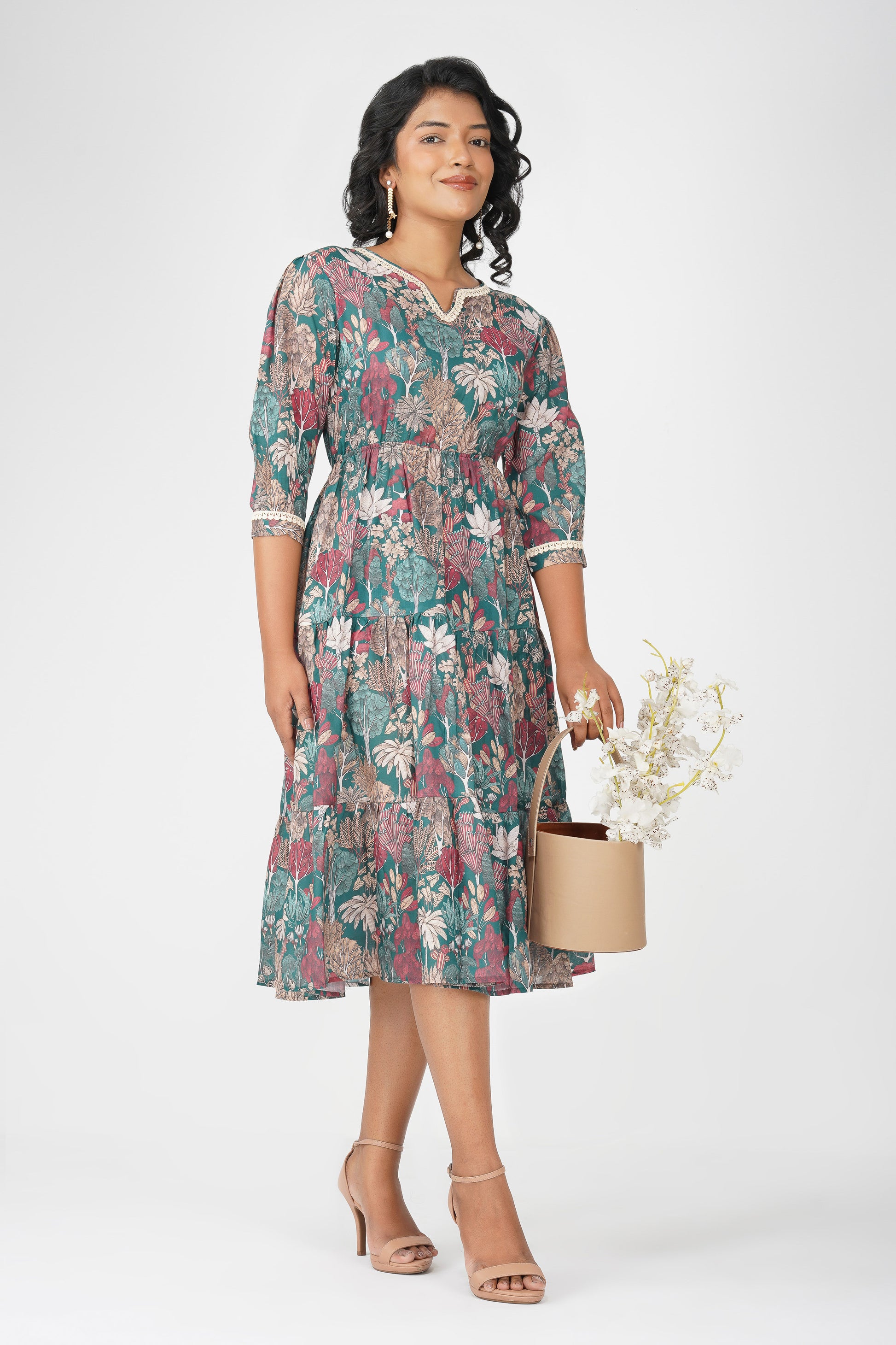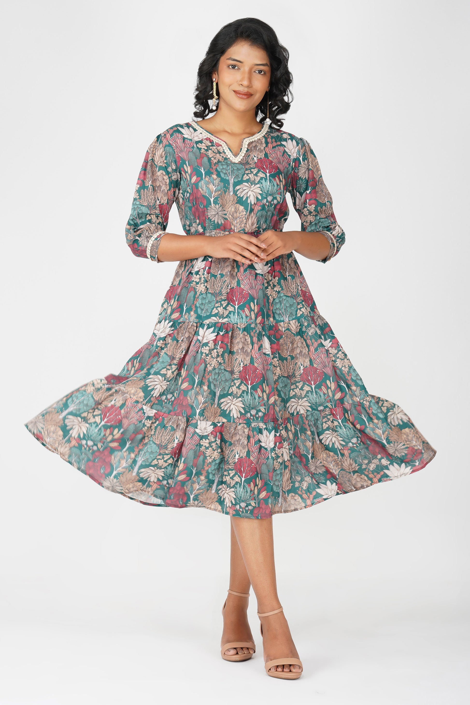 Eva Green Forest Print Cotton Blend Tier Midi Dress