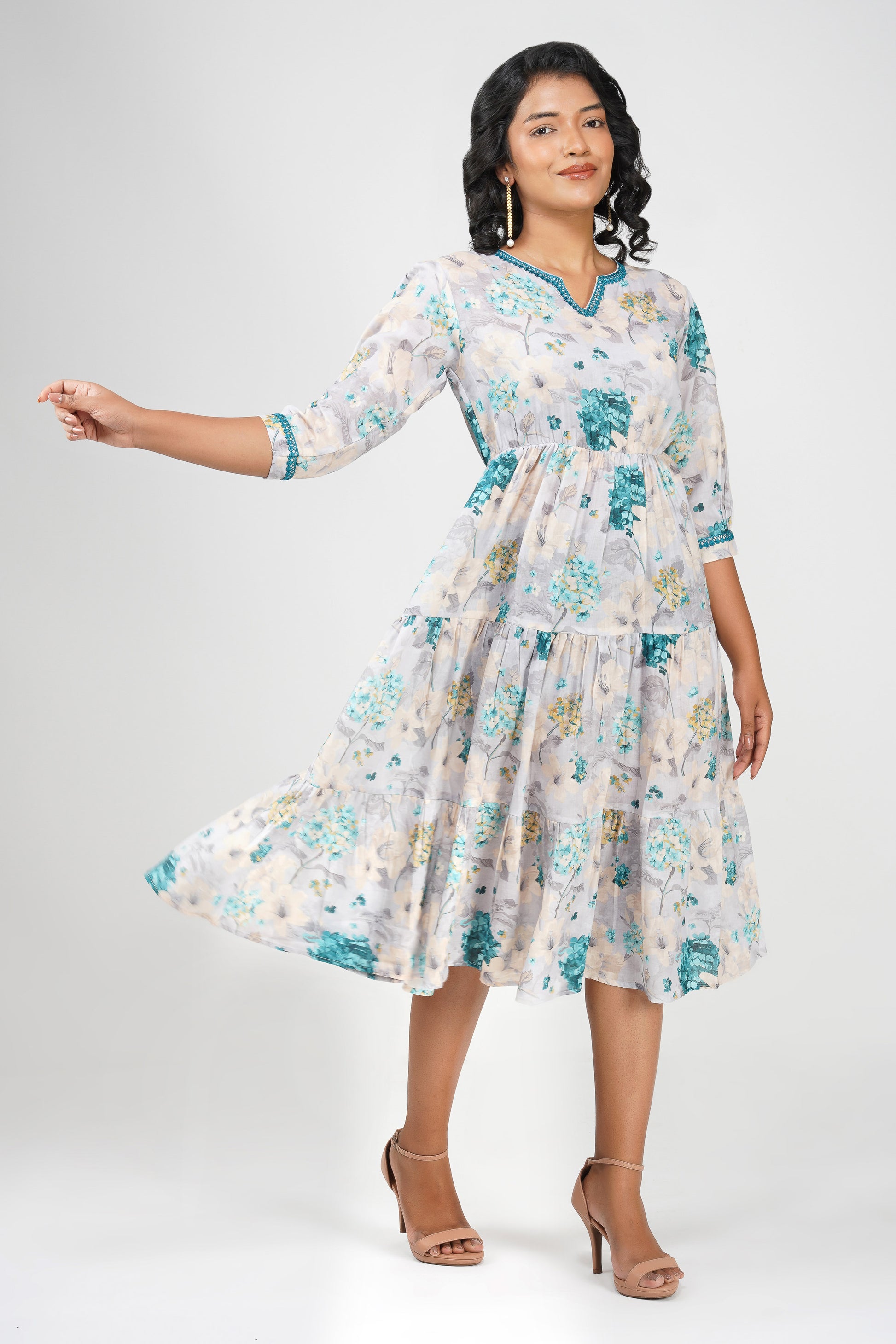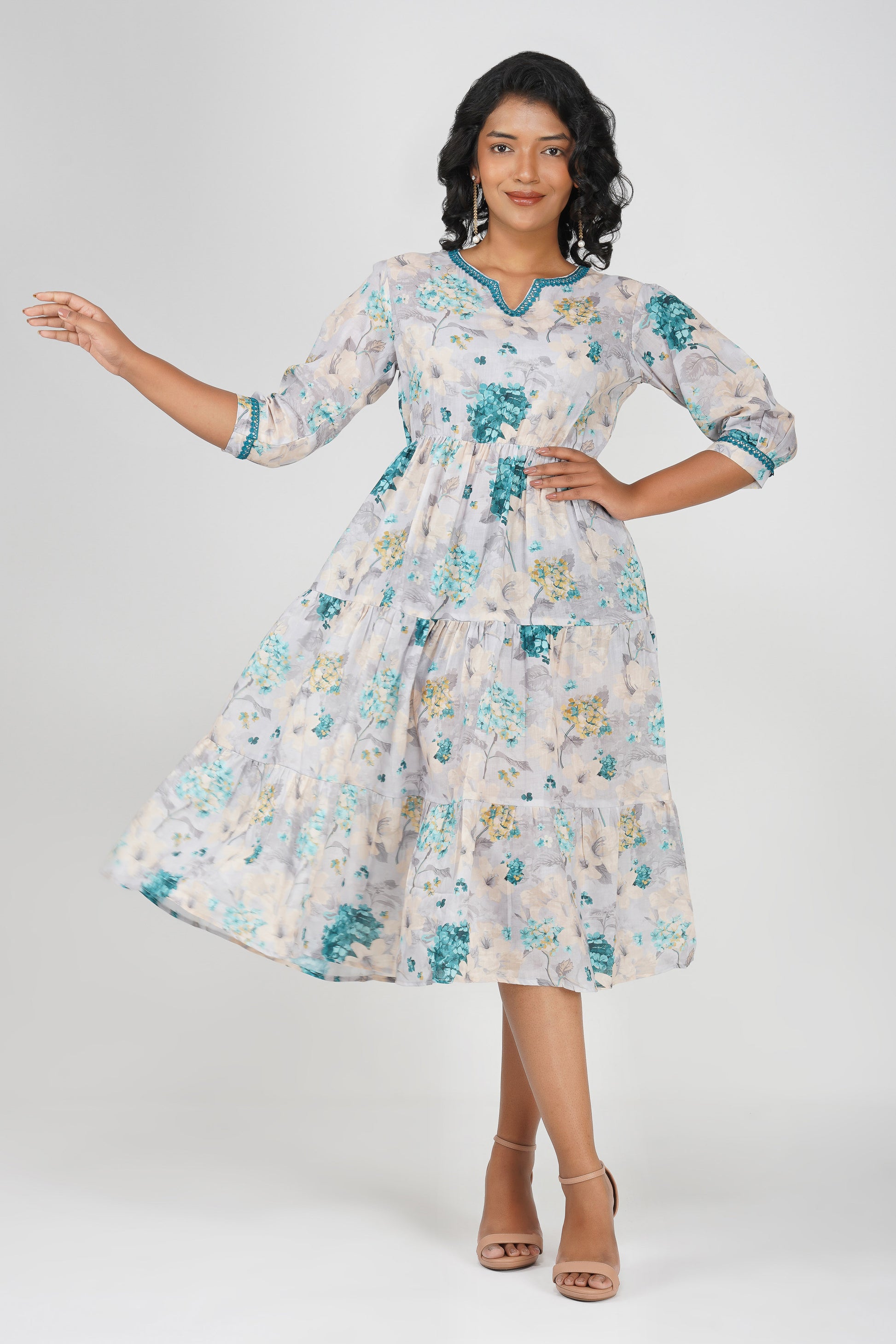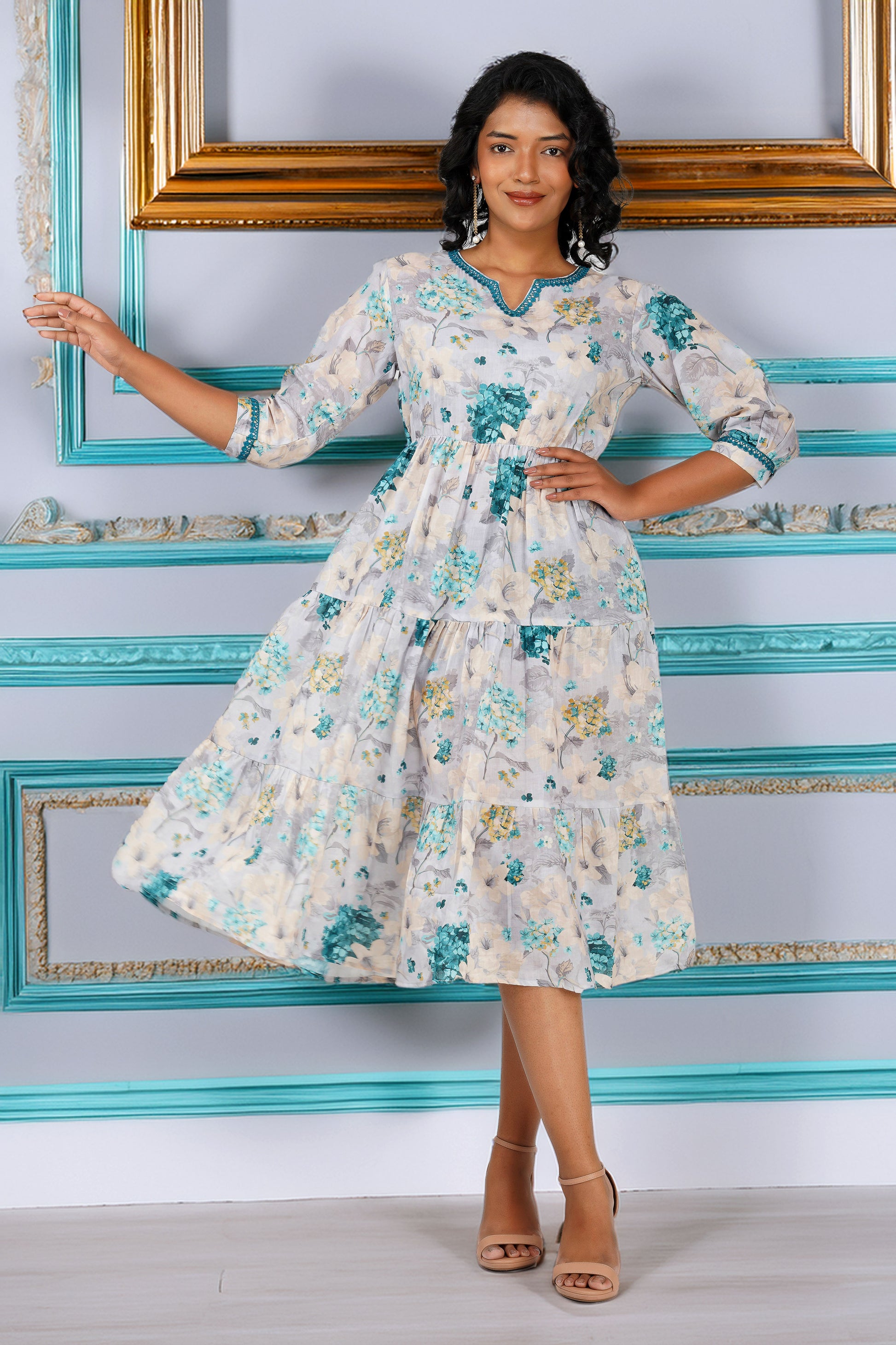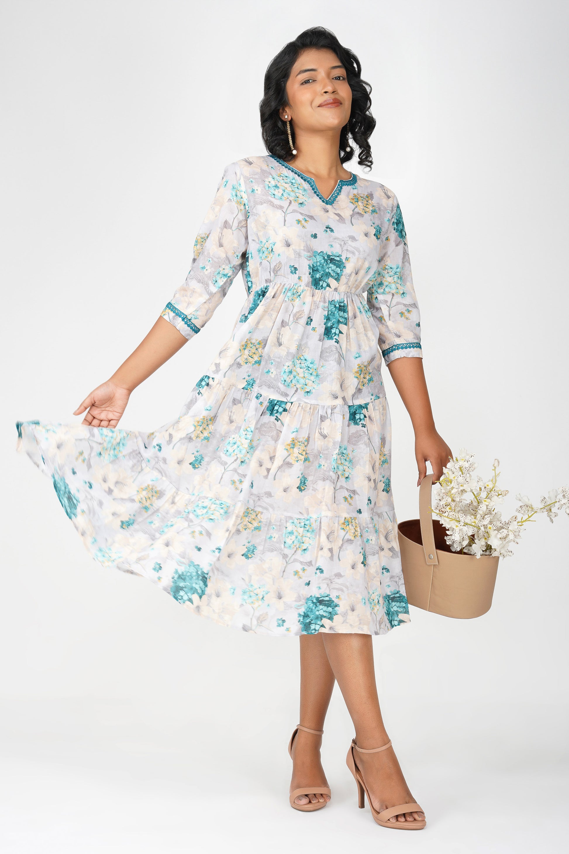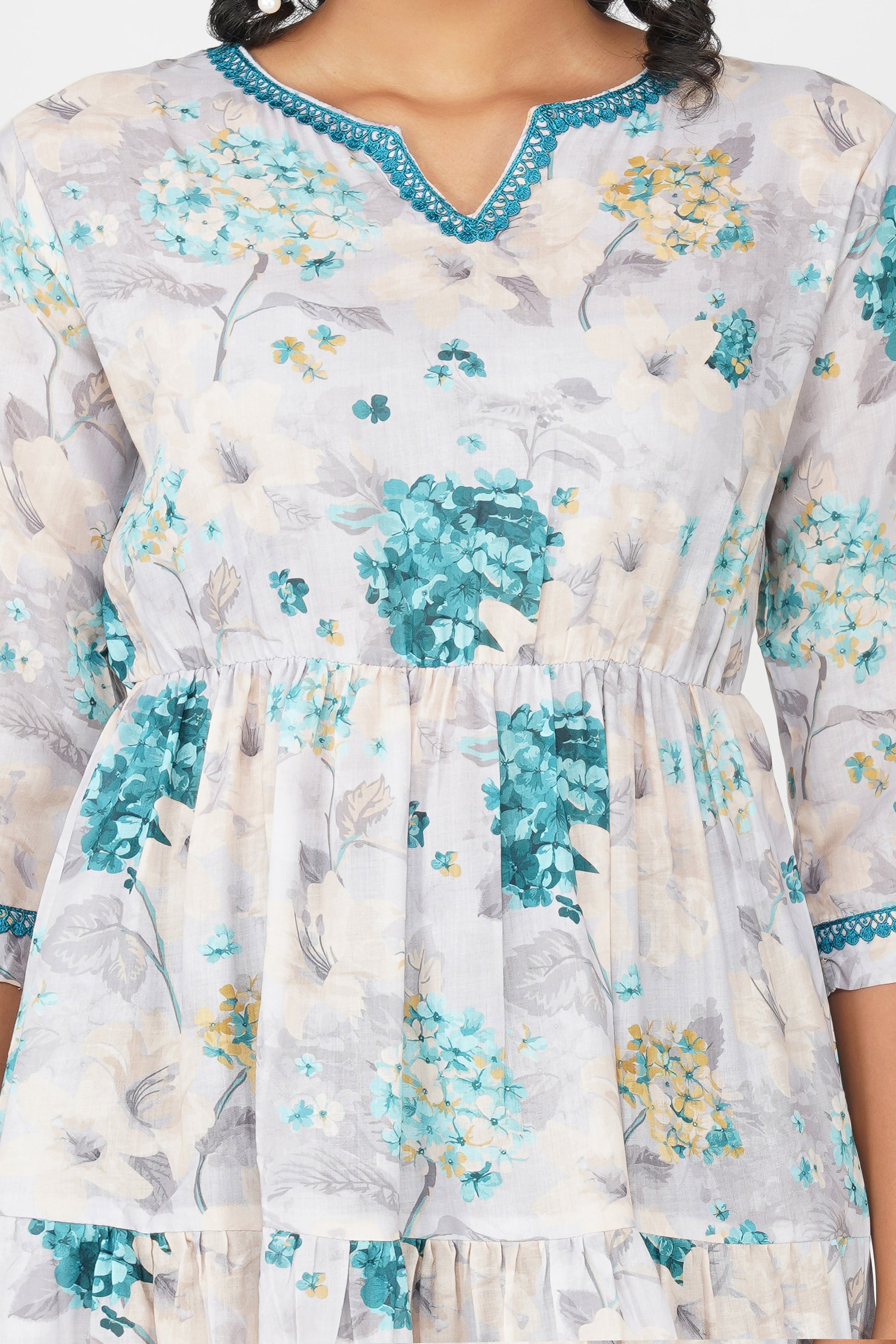 🌸 A breath of fresh elegance, the Eva Hydrangea dress is made for dreamy days and mood-lifting moments. Crafted in a soft cotton blend, it features a beautiful hand-drawn hydrangea print in hues of aqua, ivory, and soft yellow. The gathered waist enhances the silhouette without clinging, while the contrast lace at neckline and sleeves adds a polished feminine touch. The tiered flare gives it a graceful swish—perfect for everything from summer brunches to family celebrations.