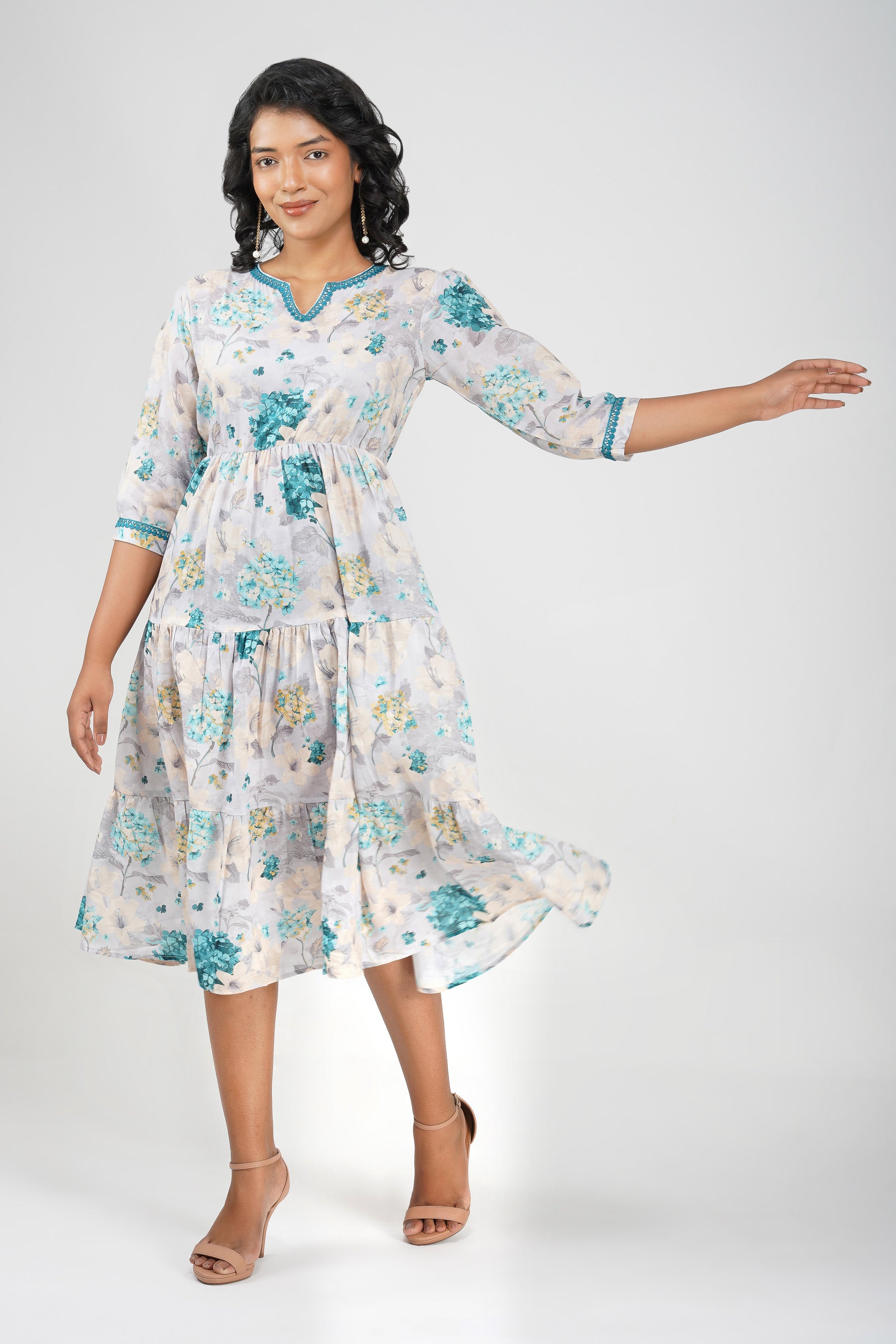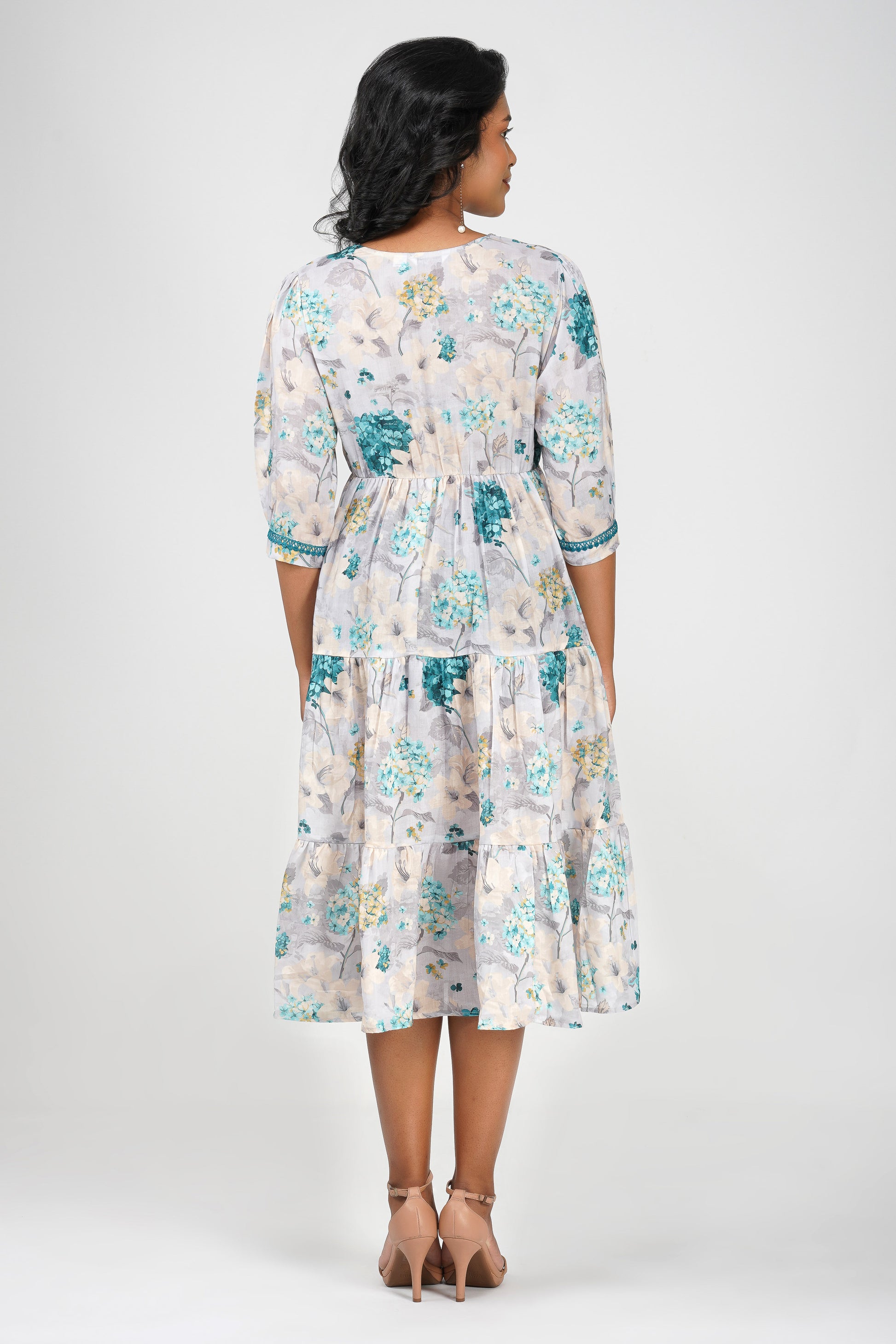 Eva Hydrangea Cotton Printed Gathered Tiered Midi Dress