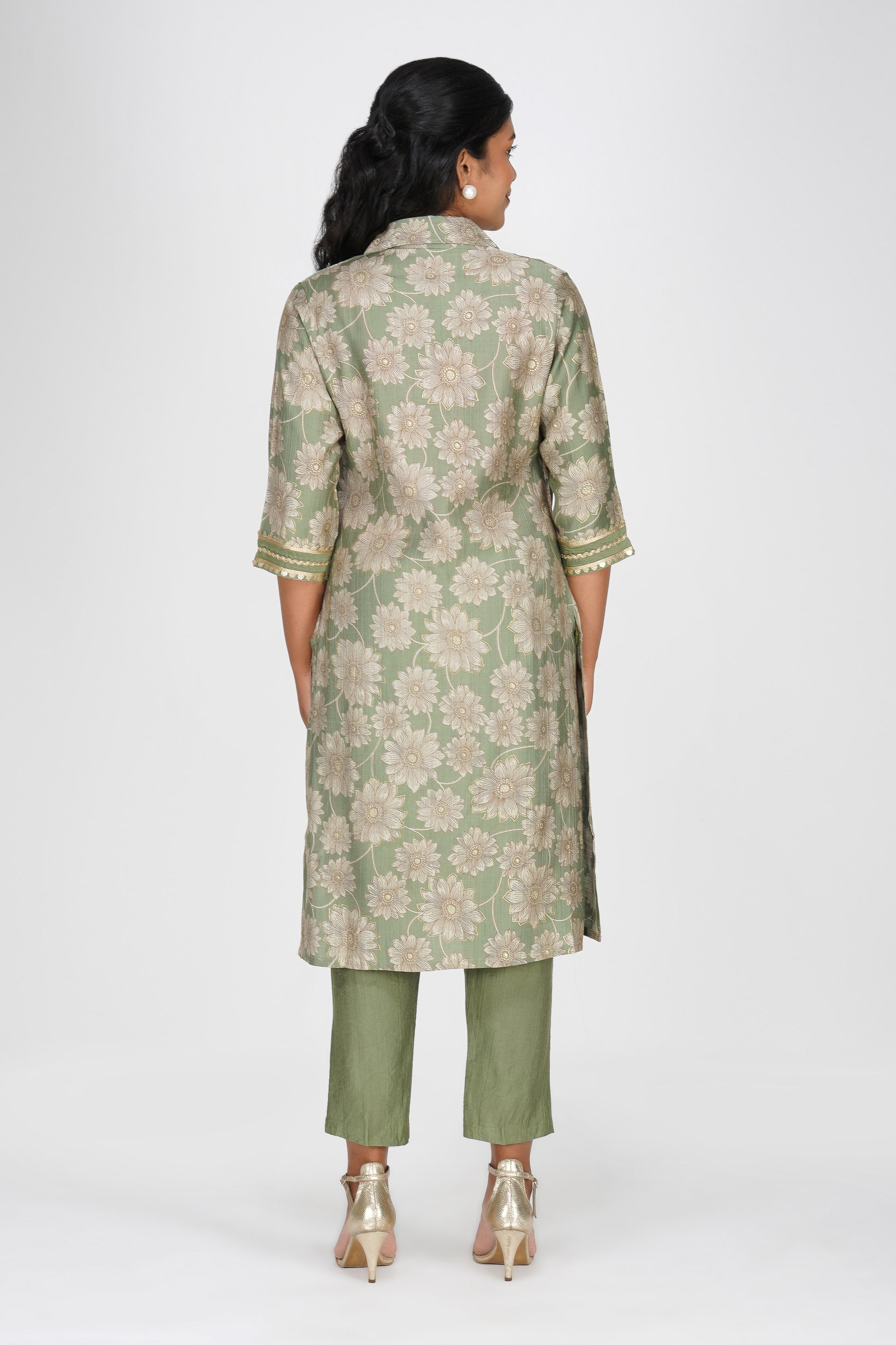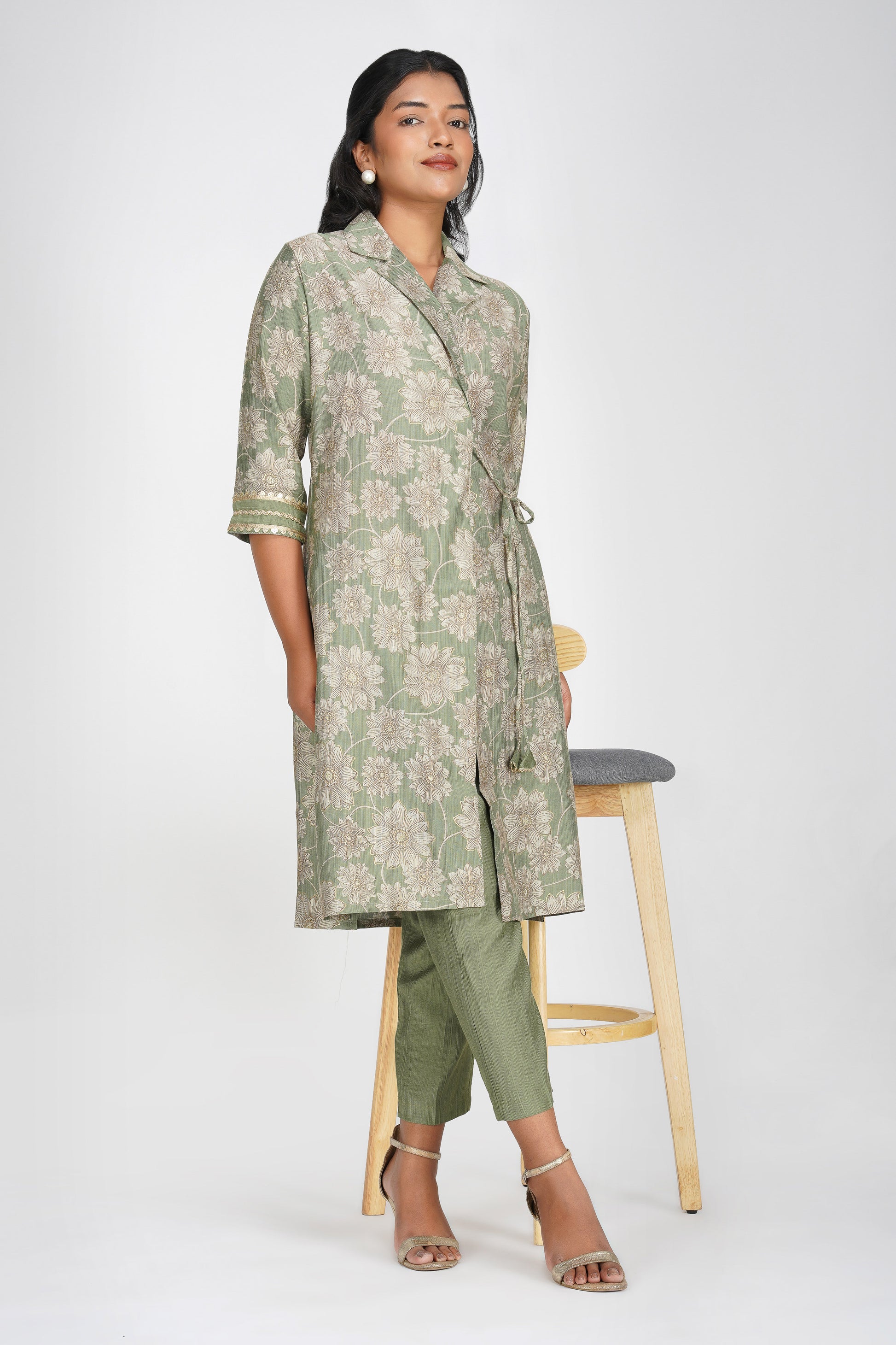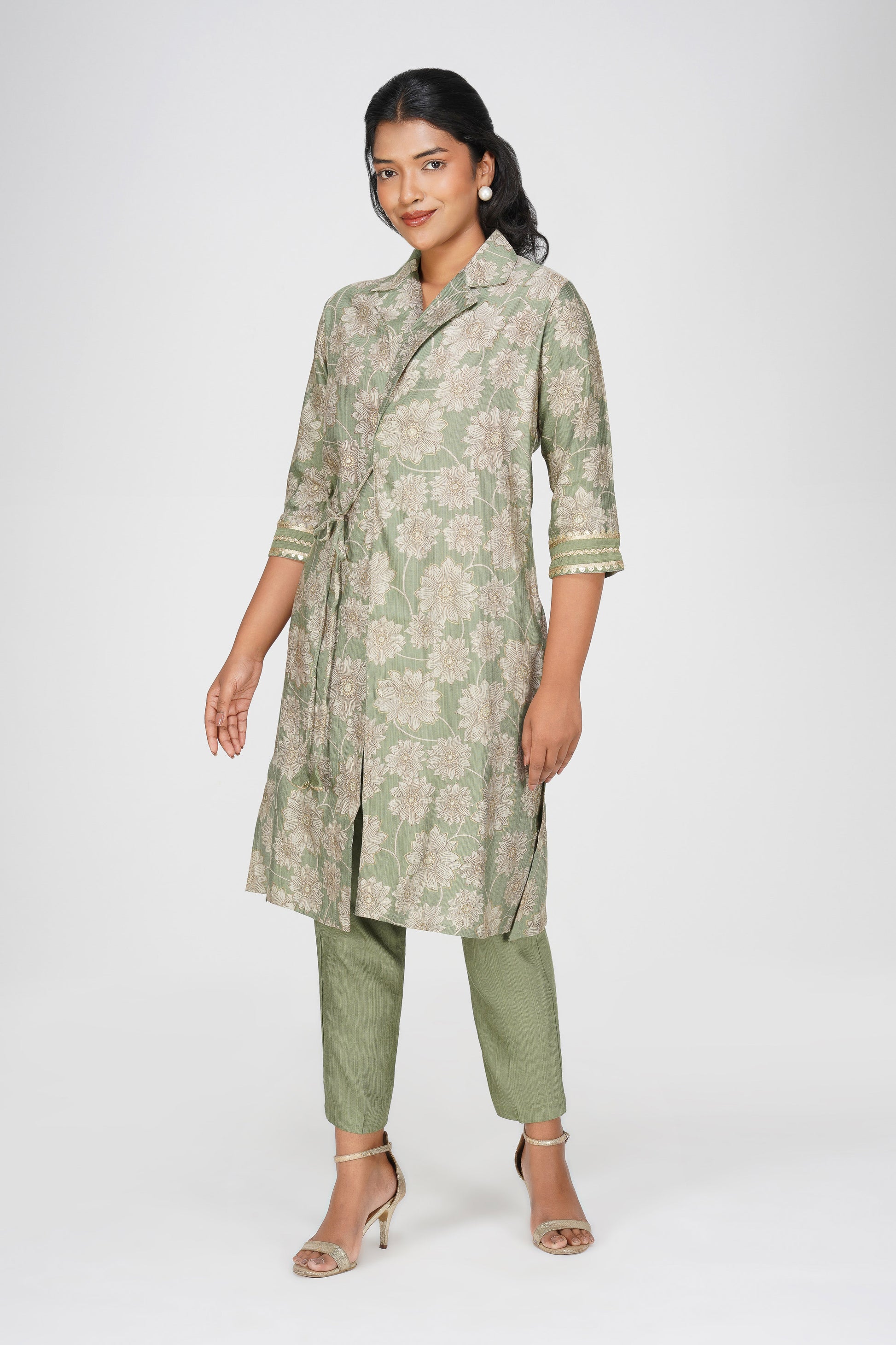 Laila Co-ord Set – Sage Green Floral Jacket Style Top with Solid Pants (2-Piece Set)