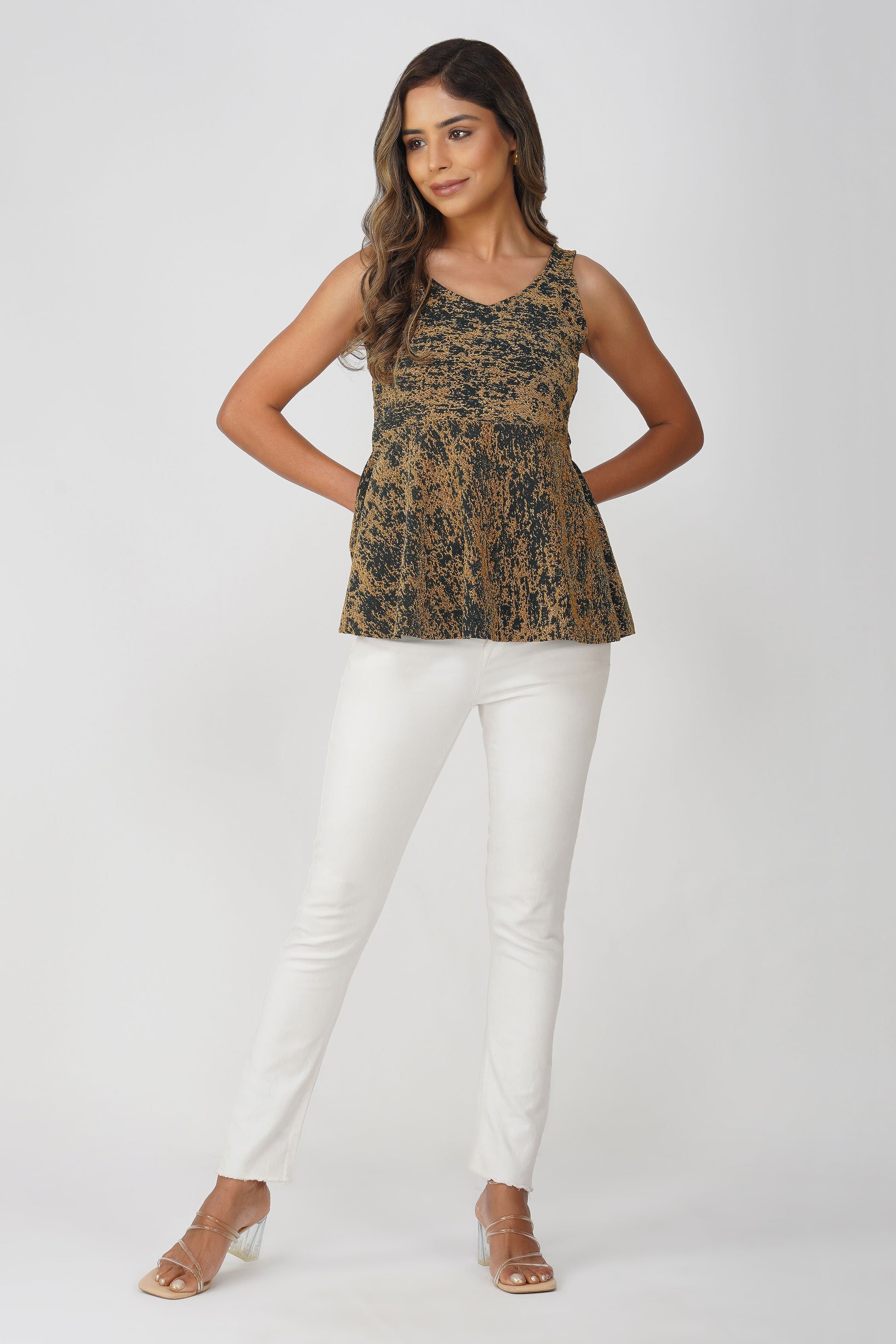Turn heads in this richly textured peacock green peplum top, delicately woven with shimmering gold lurex accents. Featuring a flattering V-neckline, sleeveless silhouette, and a softly flared hem, this party-ready piece combines comfort with high-shine appeal. Made with stretchable fabric for a snug fit at the bust and an elegant flare below, it’s a go-to for cocktail nights, festive brunches, or fusion wedding looks.