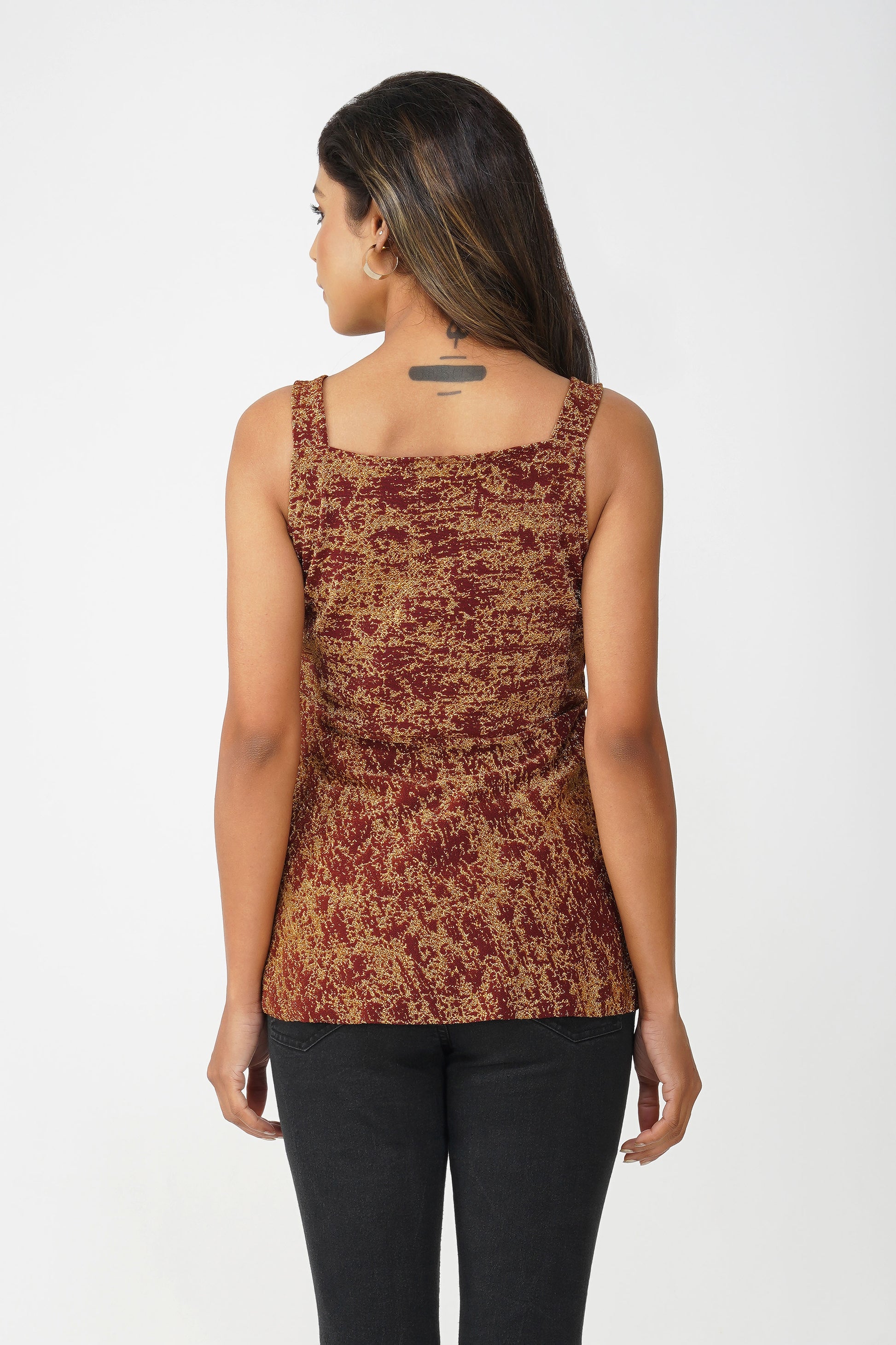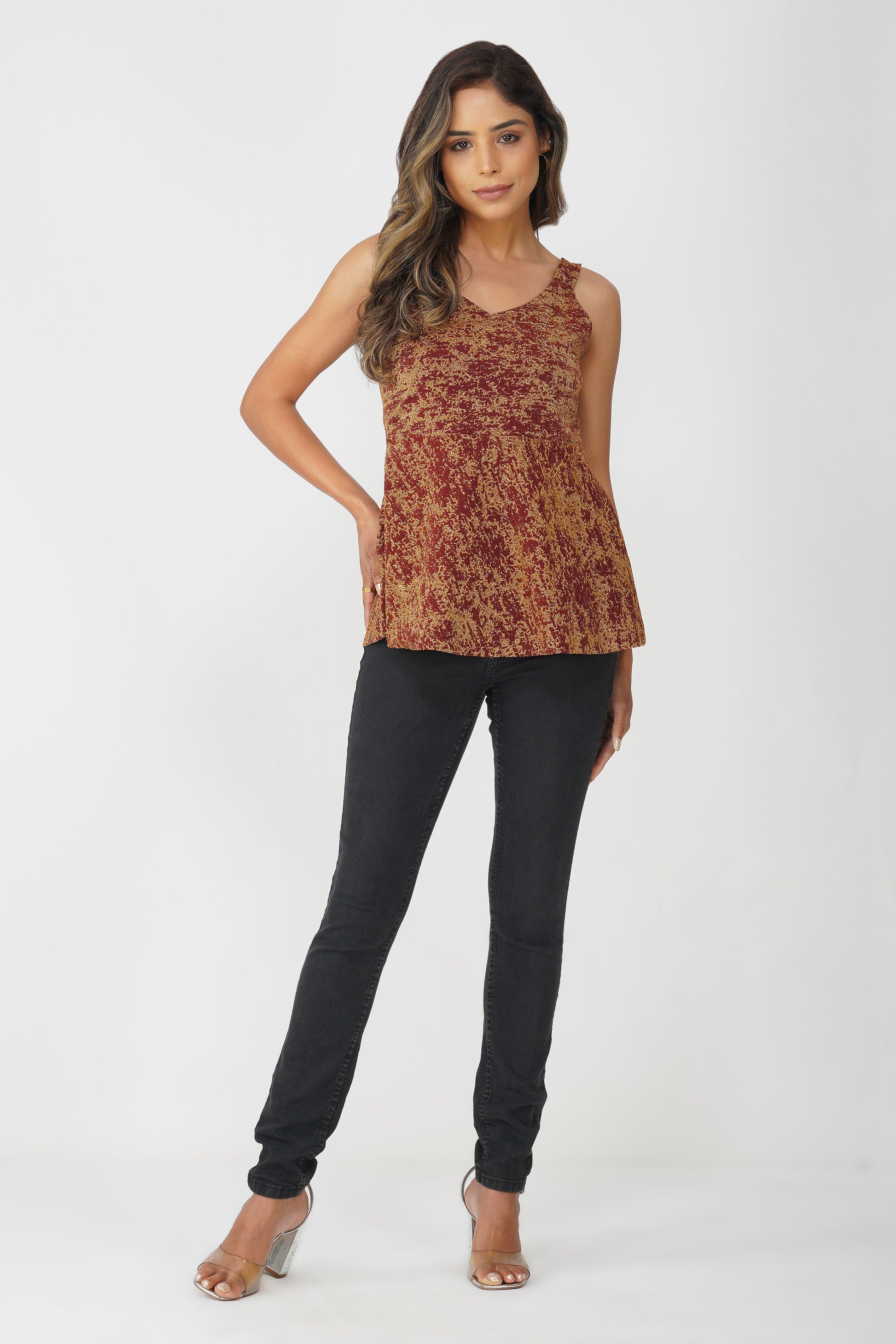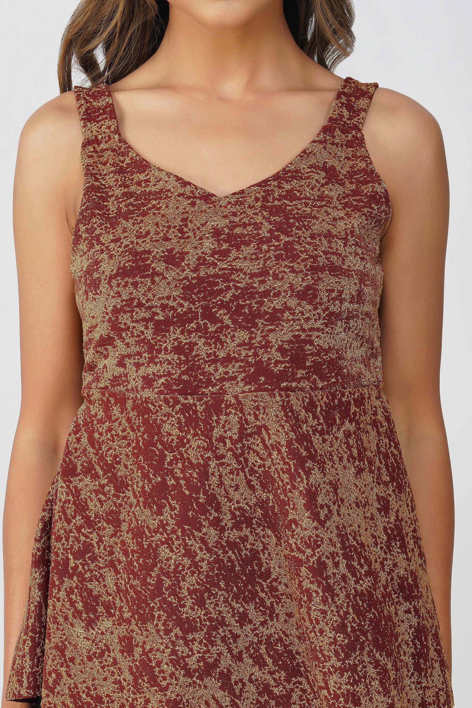 Turn heads in this rich maroon wine peplum top, woven with shimmering gold lurex threads that create a luxurious textured finish. The stretchable knit fabric hugs the bust while the flared hem adds effortless elegance. The V-neckline and sleeveless cut make it a versatile choice for layering or standing out solo at parties, wedding functions, or festive nights.