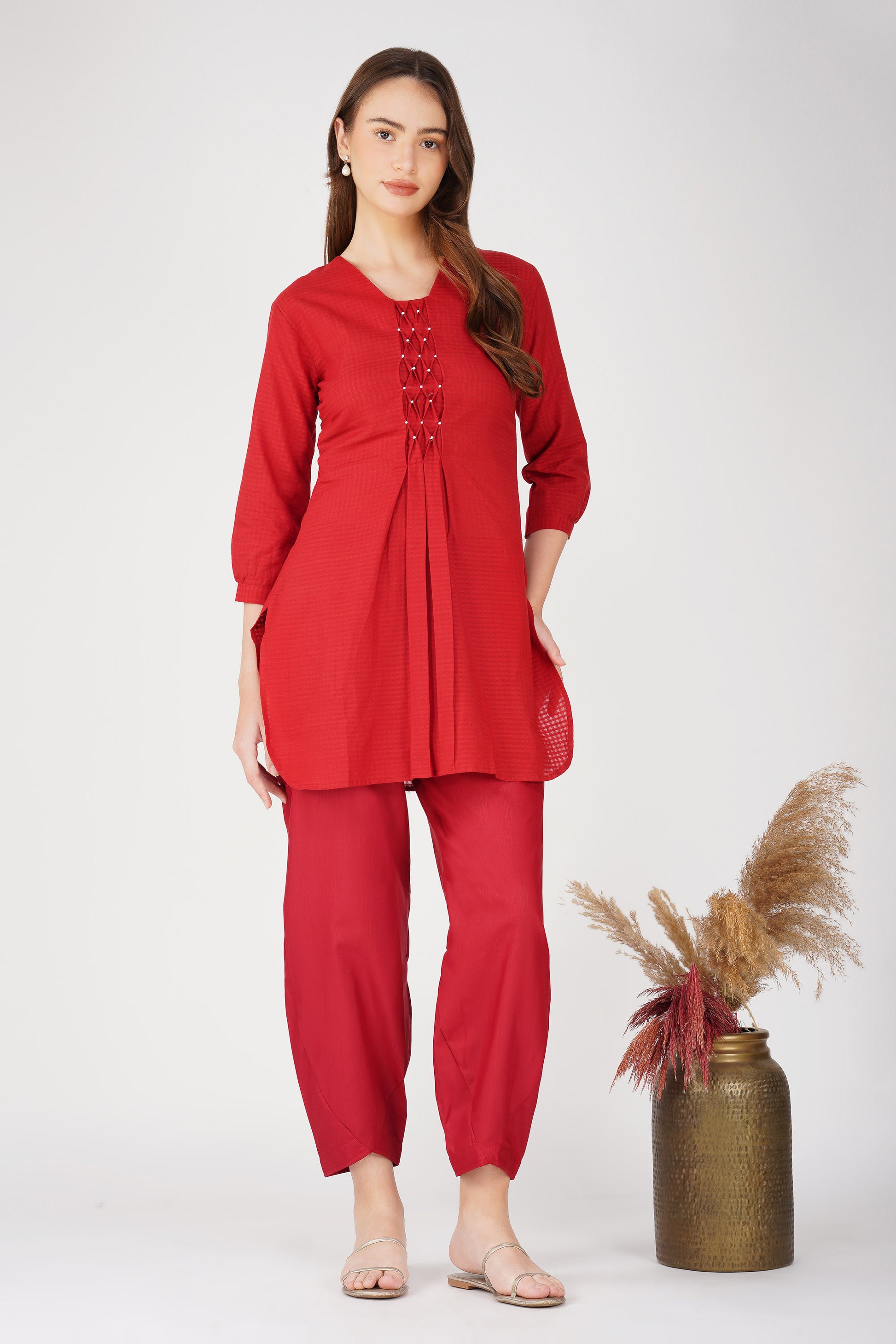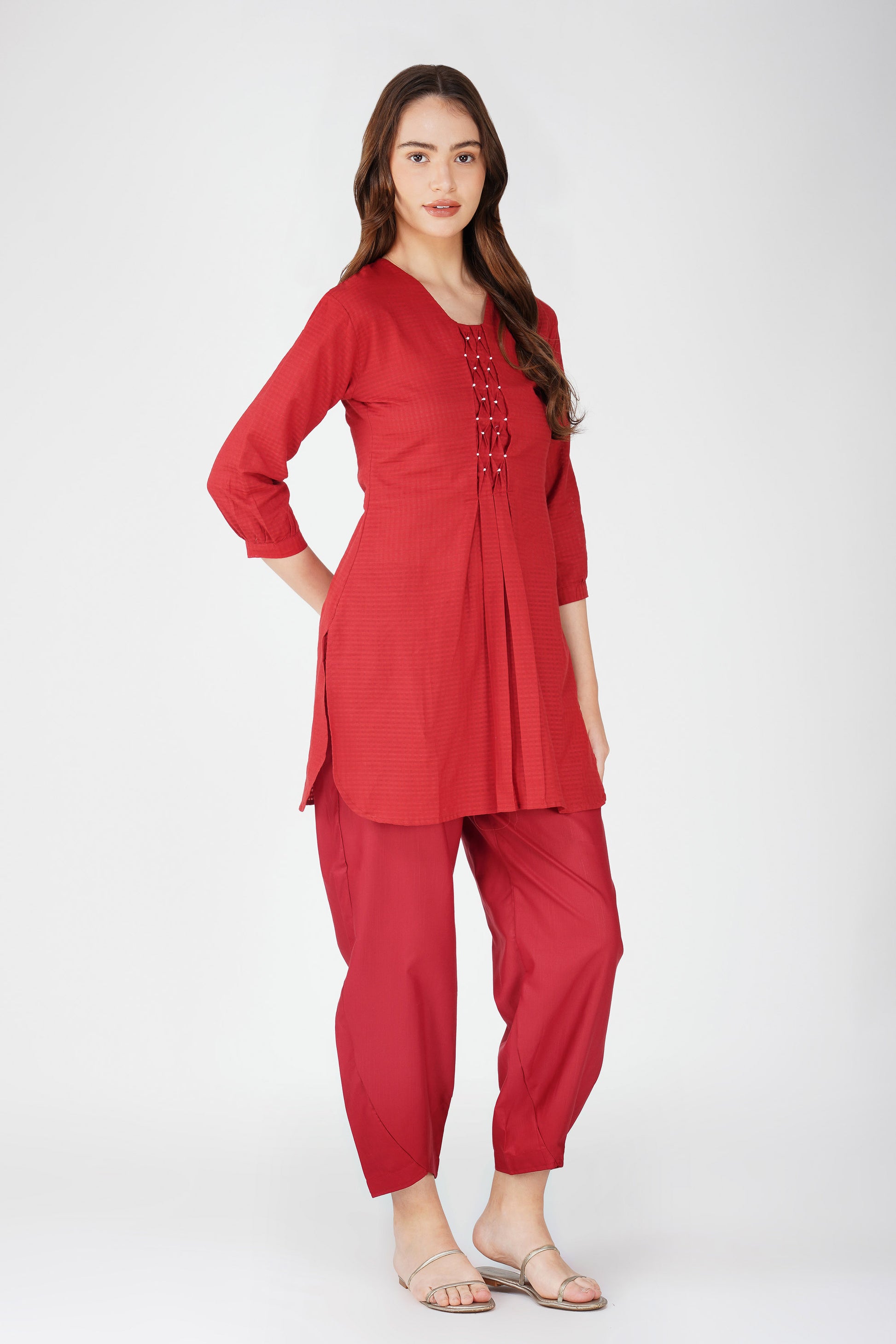 Earthy, artsy, and effortlessly bold β this maroon handloom cotton kurta is woven in checks and adorned with hand-tucked beads at the neckline π§΅. Paired with comfy Afghani-style pants and a pocket to keep things practical, this co-ord brings just the right amount of drama to your everyday πΆοΈπ.