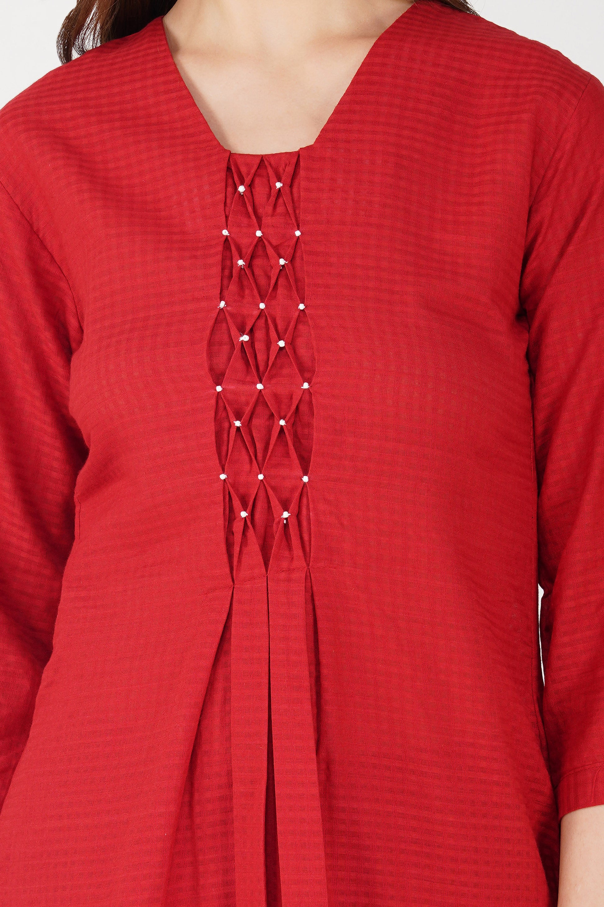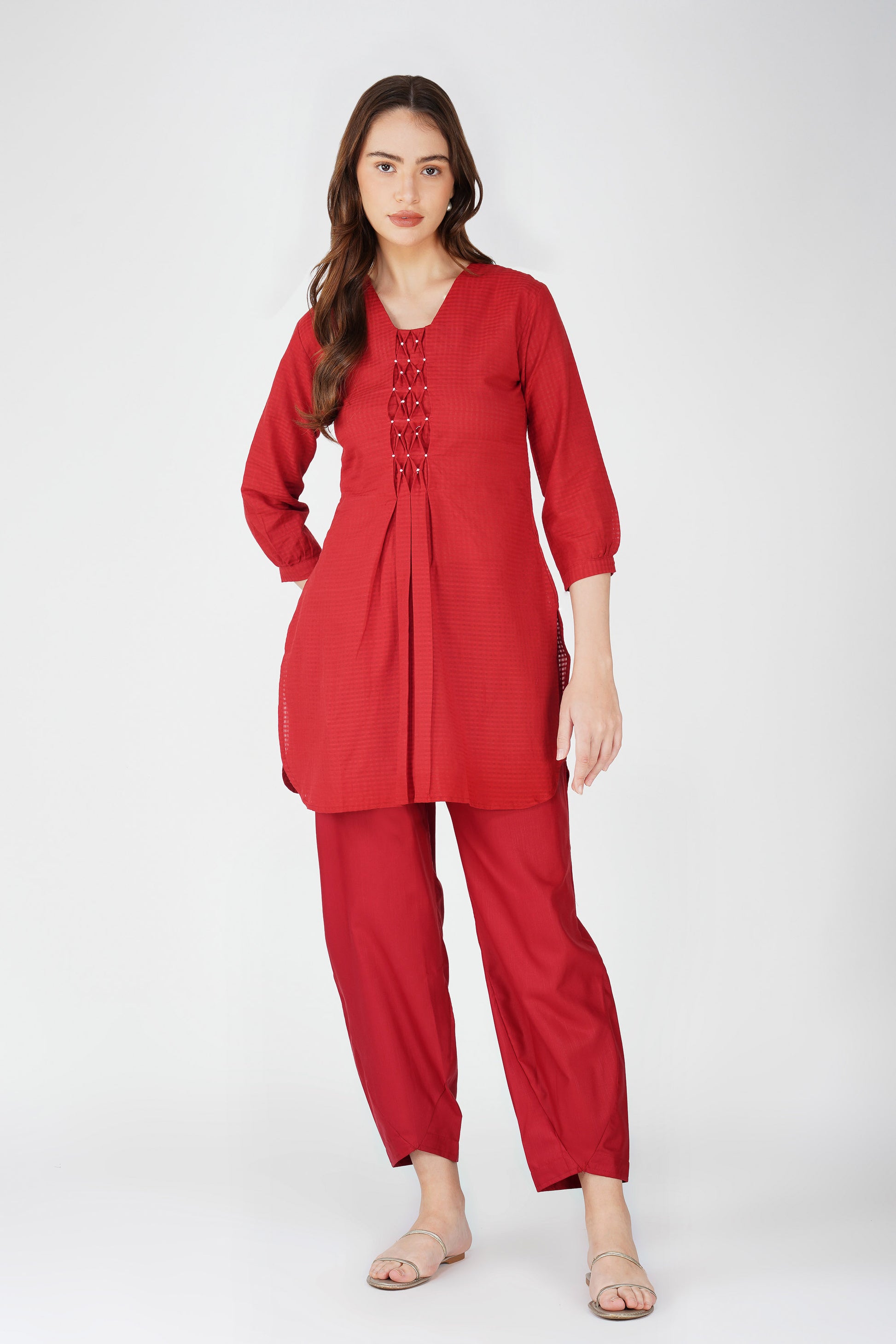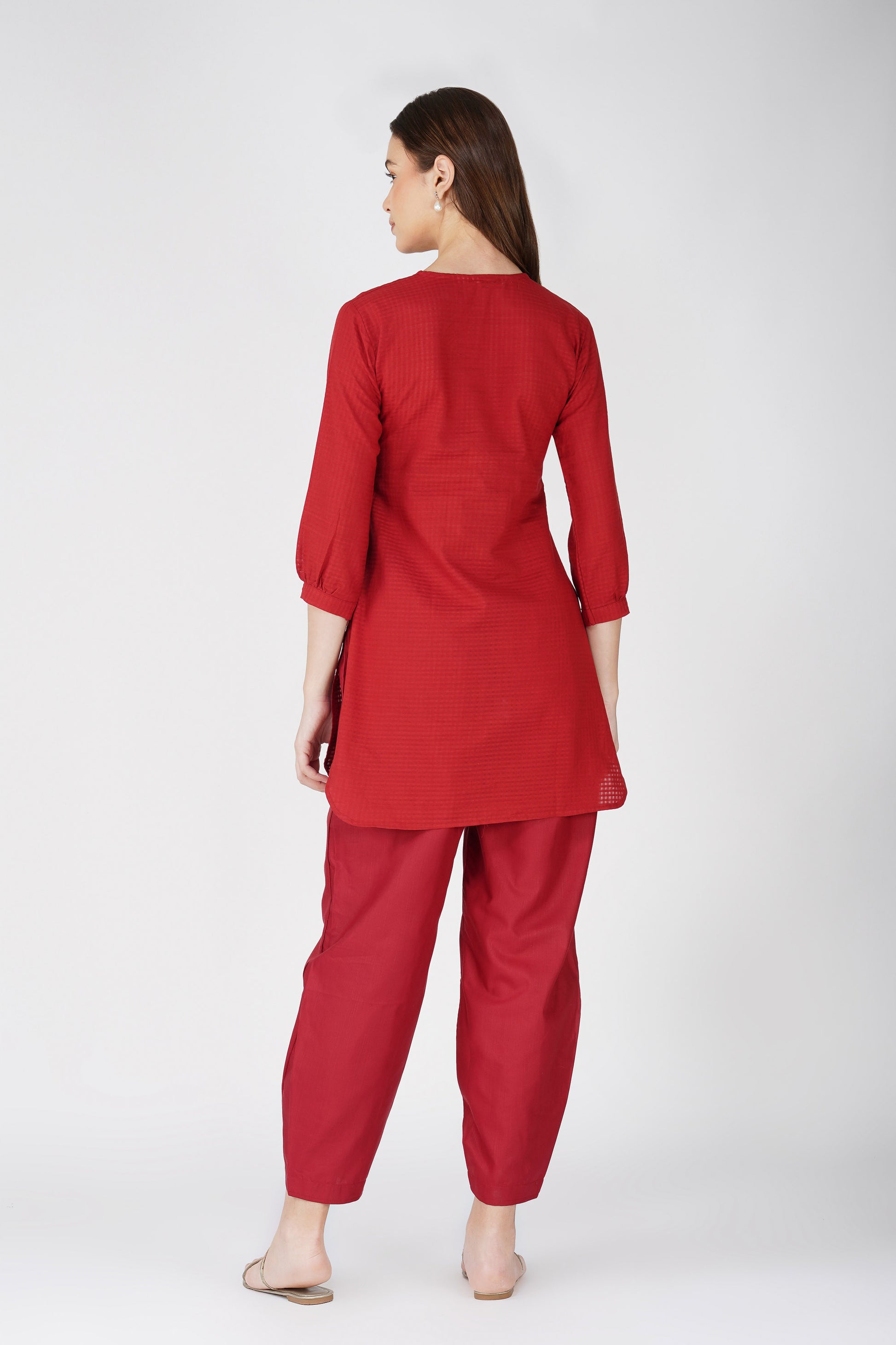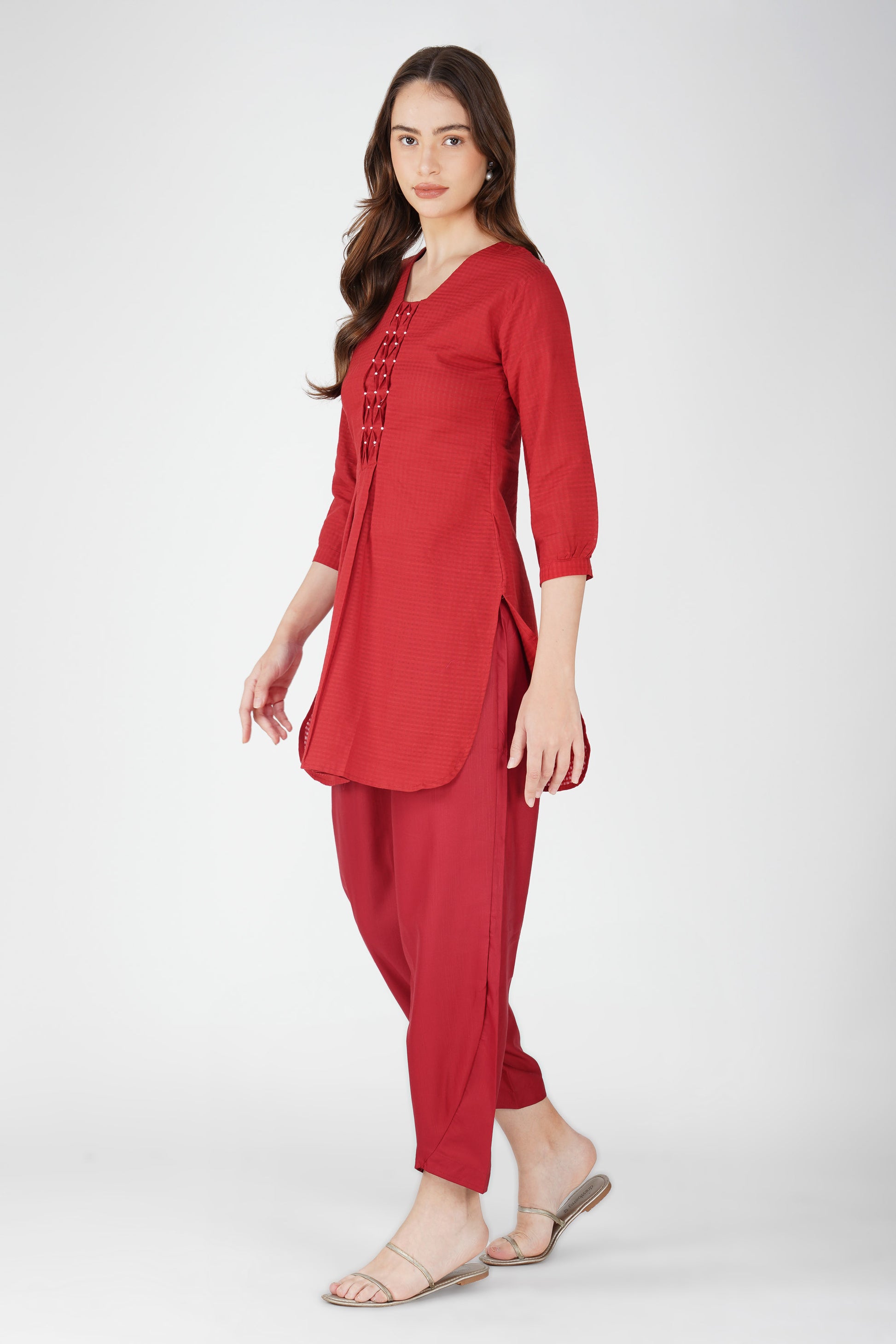 Maroon Handloom Kurta Set β Beaded Neckline with Afghani Pants